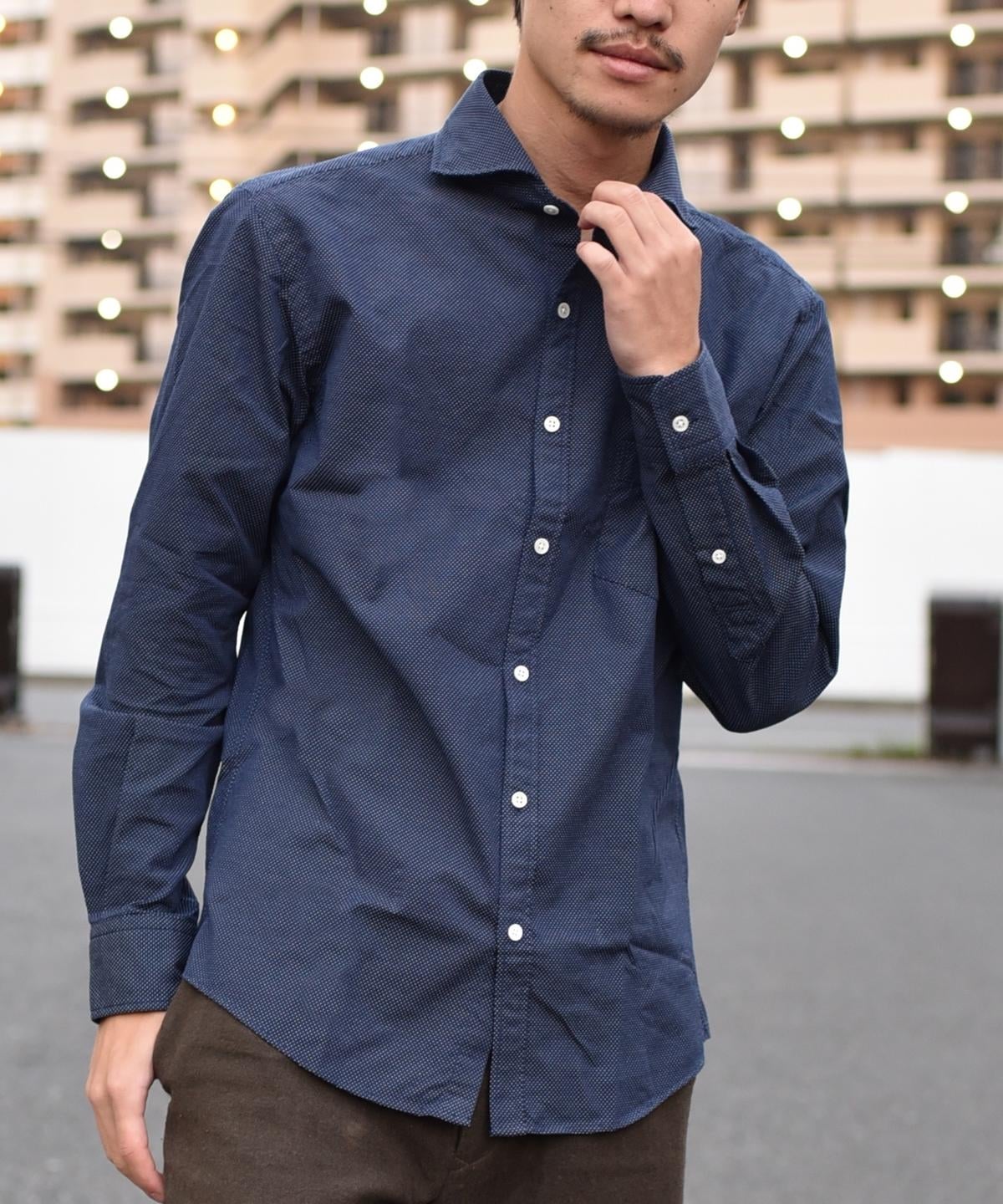 ドビー織りでドット柄を表現したセミワイドカラーシャツ