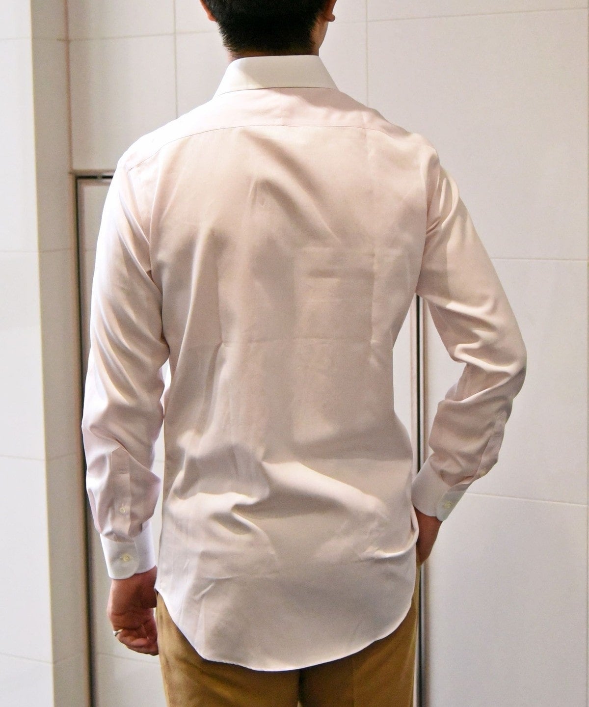 コットン100%の生地に特殊な加工を施し、防しわ性、寸法安定性を高めた素材です。滑らかな肌触りと光沢、風合いはそのままに、洗った後のアイロンがけも非常に楽チンな素材です。
