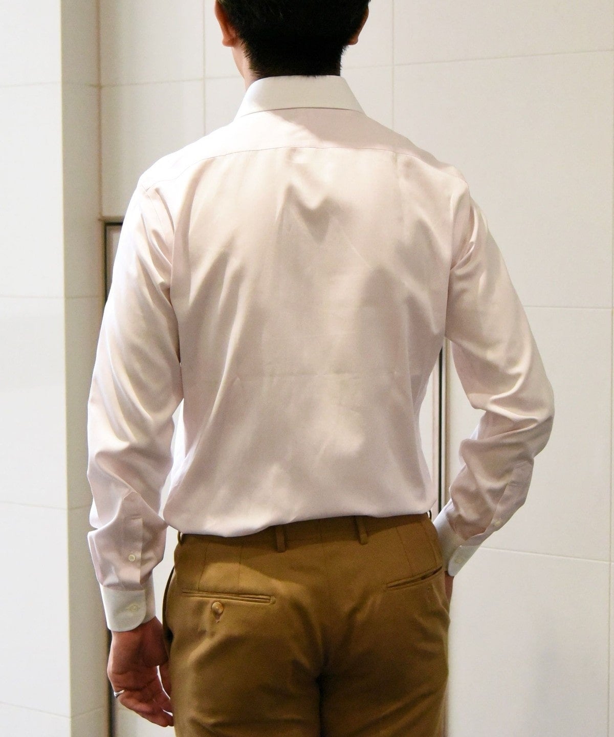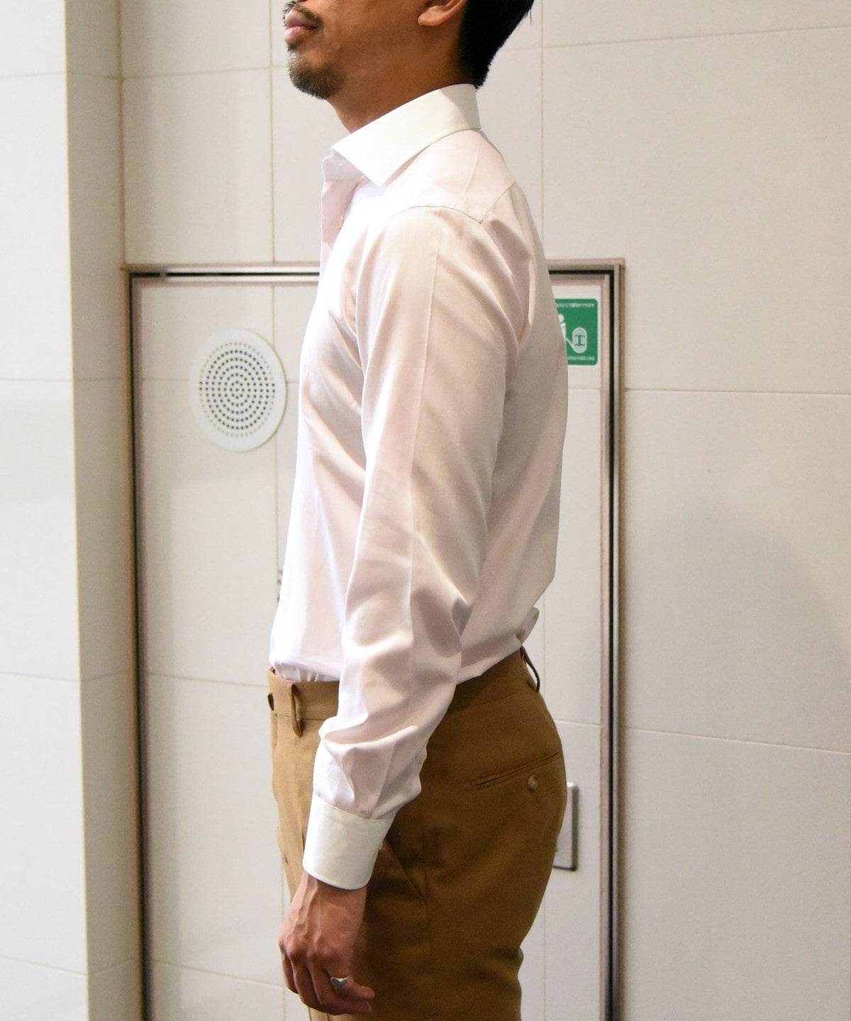 だいえりはフロントに向かってカーブさせることでフィットかんの向上と美しい襟の立ち具合を実現。