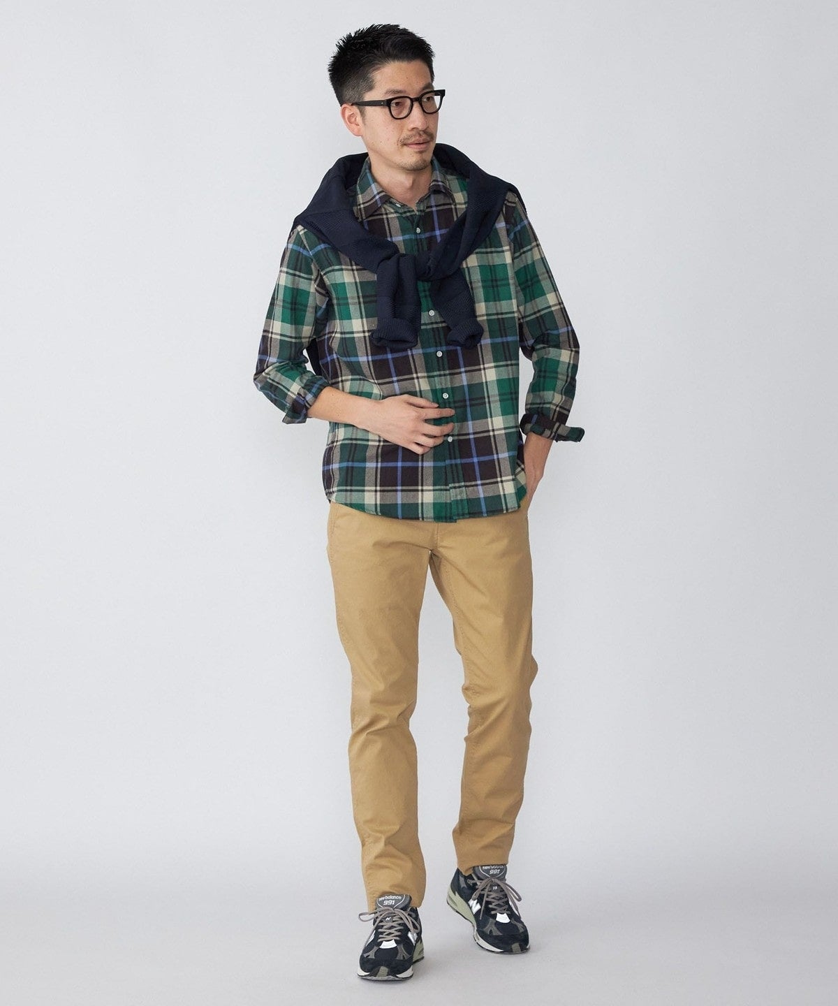 羽織ったり、ダウンのインナーに着たりと、カジュアル使いはもちろん、カーディガン等キレイめ使いにも相性の良いシャツに仕上がっています。