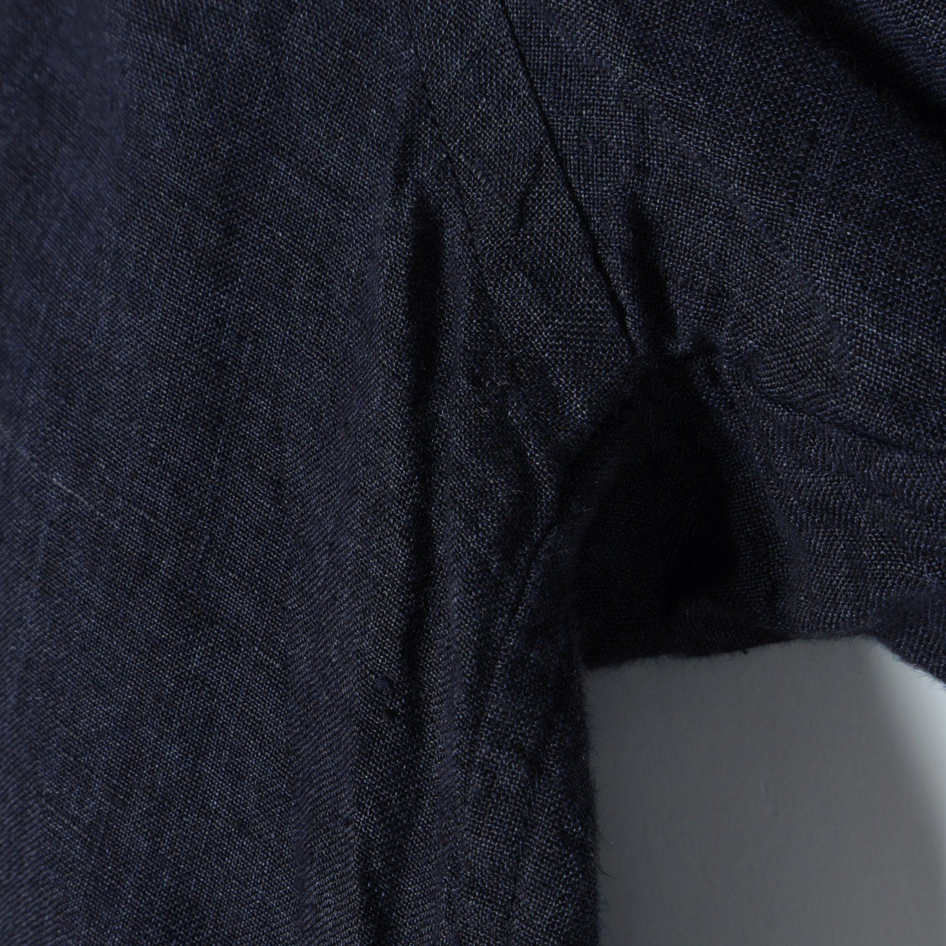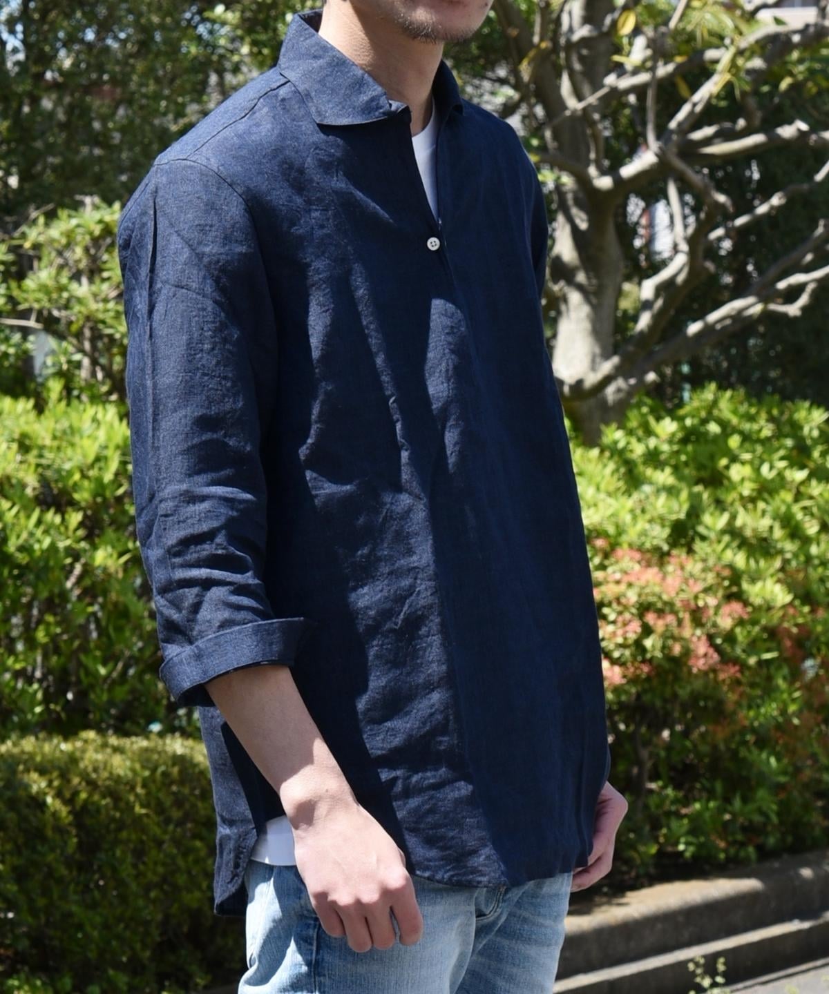 プルオーバー型なので身幅は程良いゆとりがあります。身幅に対して着丈は長すぎずシルエットのバランスがとりやすいです。麻素材なので汗を掻いても肌離れが良く、暑い季節にも丁度良さそうです。