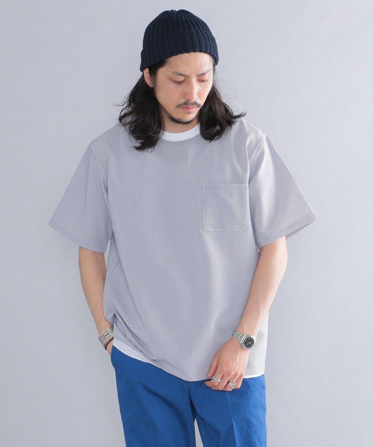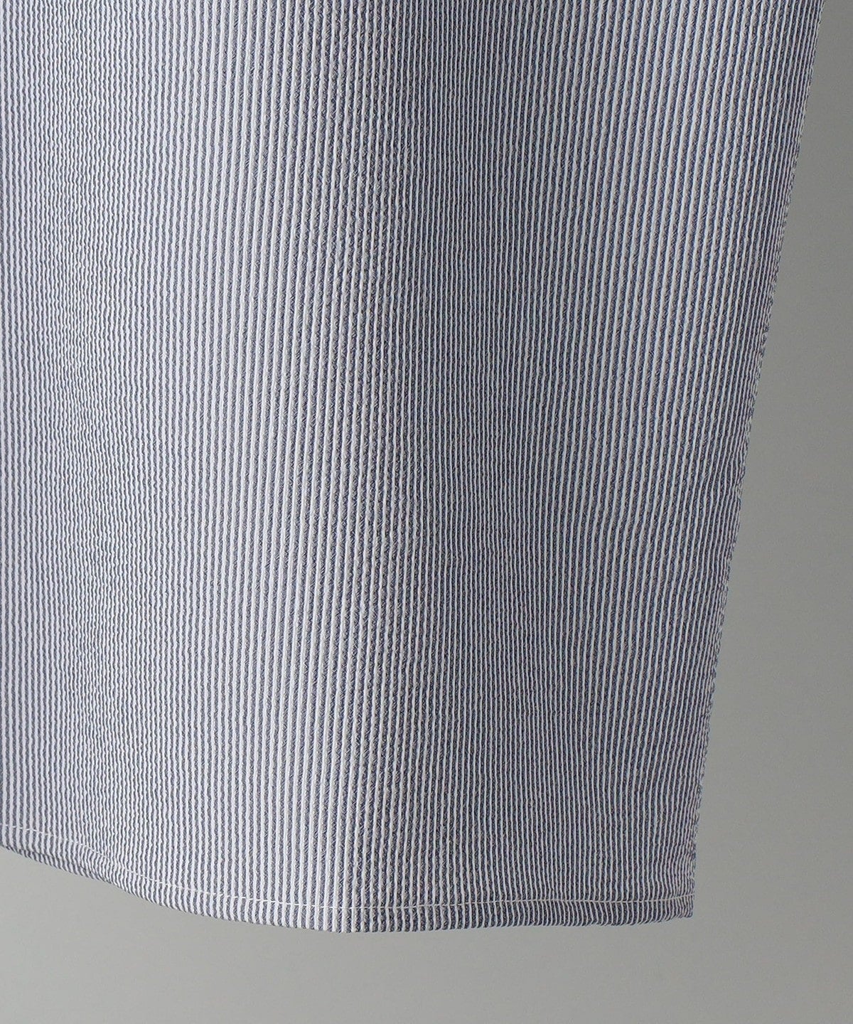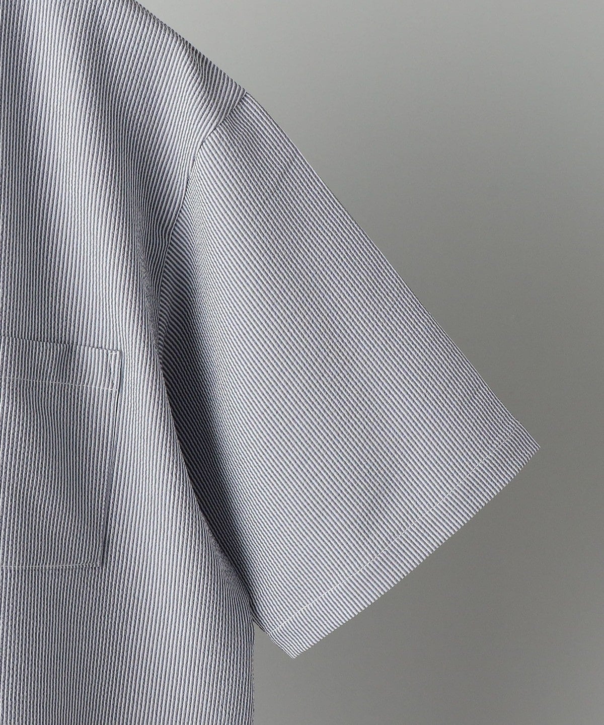 暑いシーズンを過ごすには欠かせない素材を掛け合わせることで、より涼しくドライな着心地に仕上げています。細かいピンストライプ柄が、より清涼感を感じさせると共に、着用時にストレスを感じにくいストレッチ性も併せ持っており、程よいリラックス感のあるシルエットを採用した拘りのアイテム。