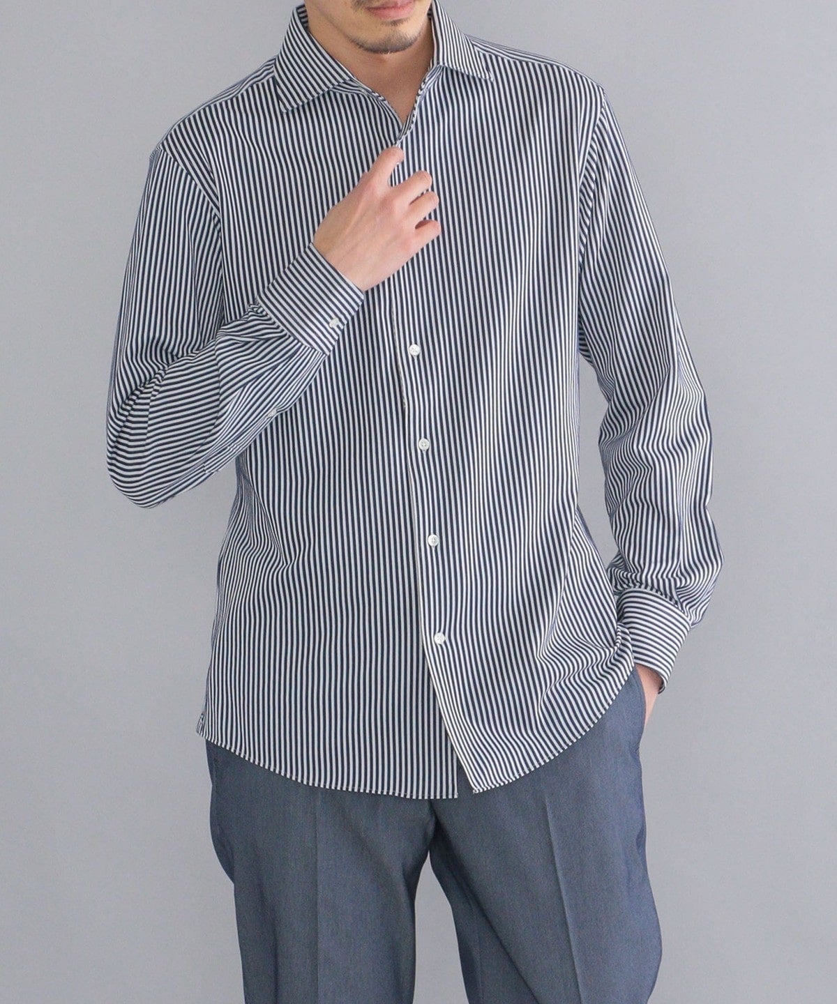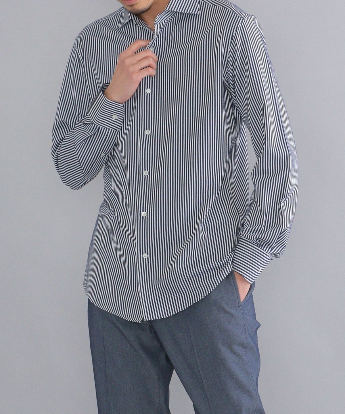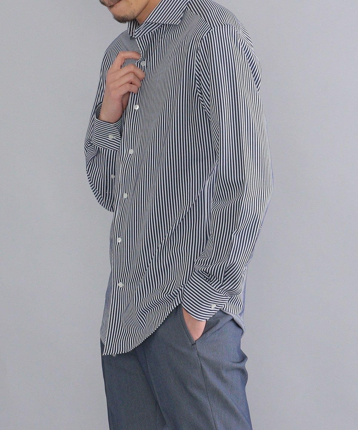 ・ノータイでも綺麗な立ち上がりと、エレガントな表情の衿型。第一ボタンを付けており、タイドアップも可能です。