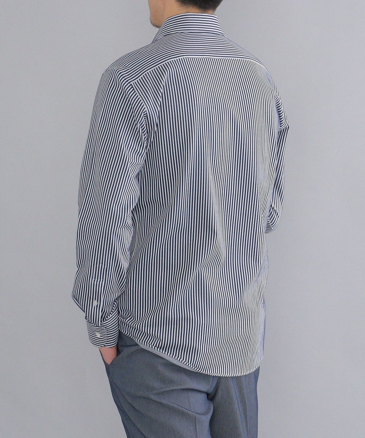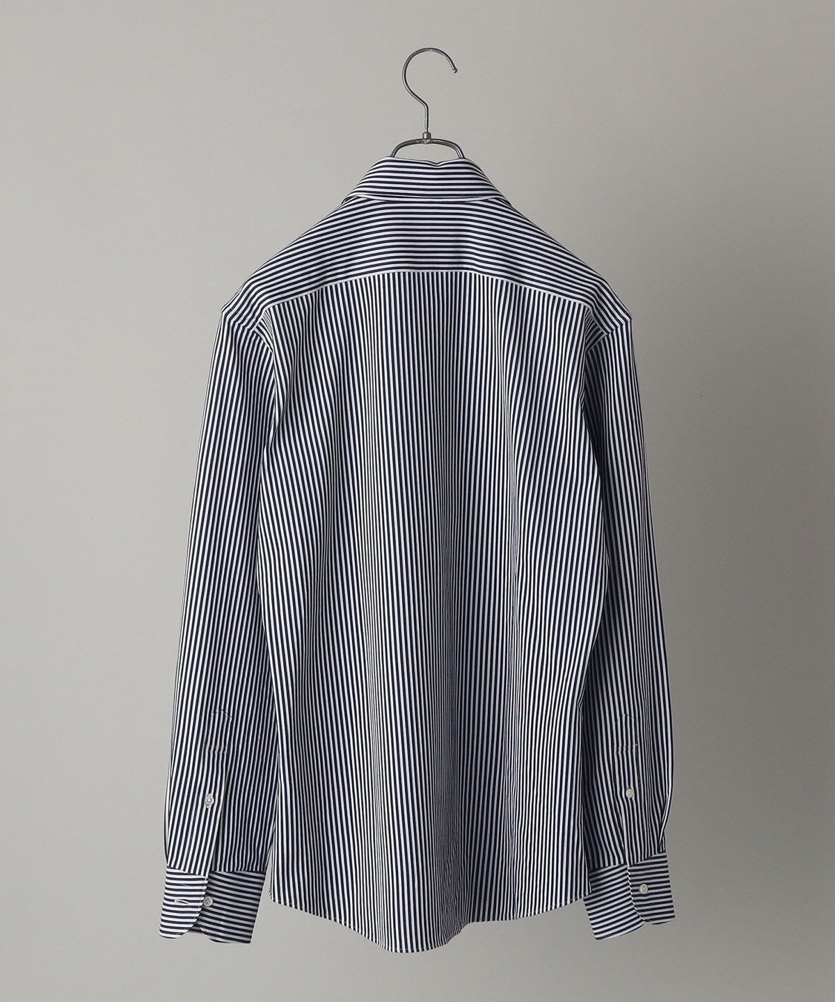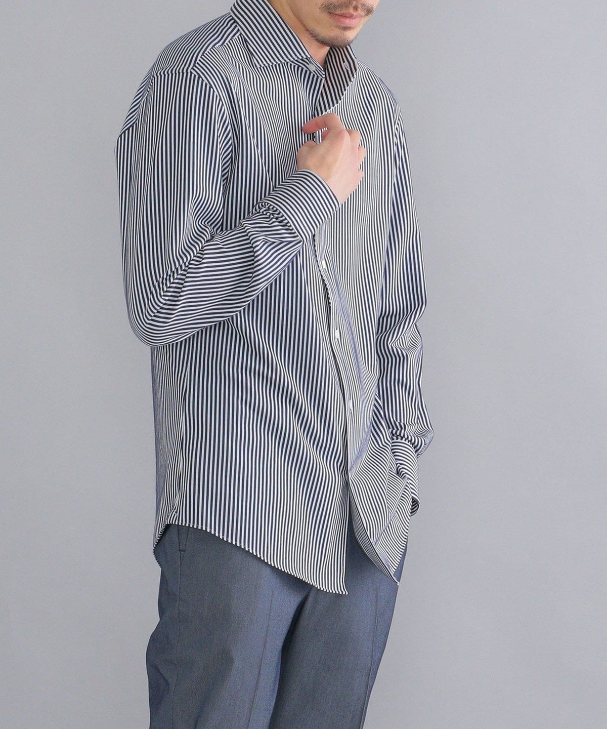 ・ノータイでも綺麗な立ち上がりと、エレガントな表情の衿型。第一ボタンを付けており、タイドアップも可能です。