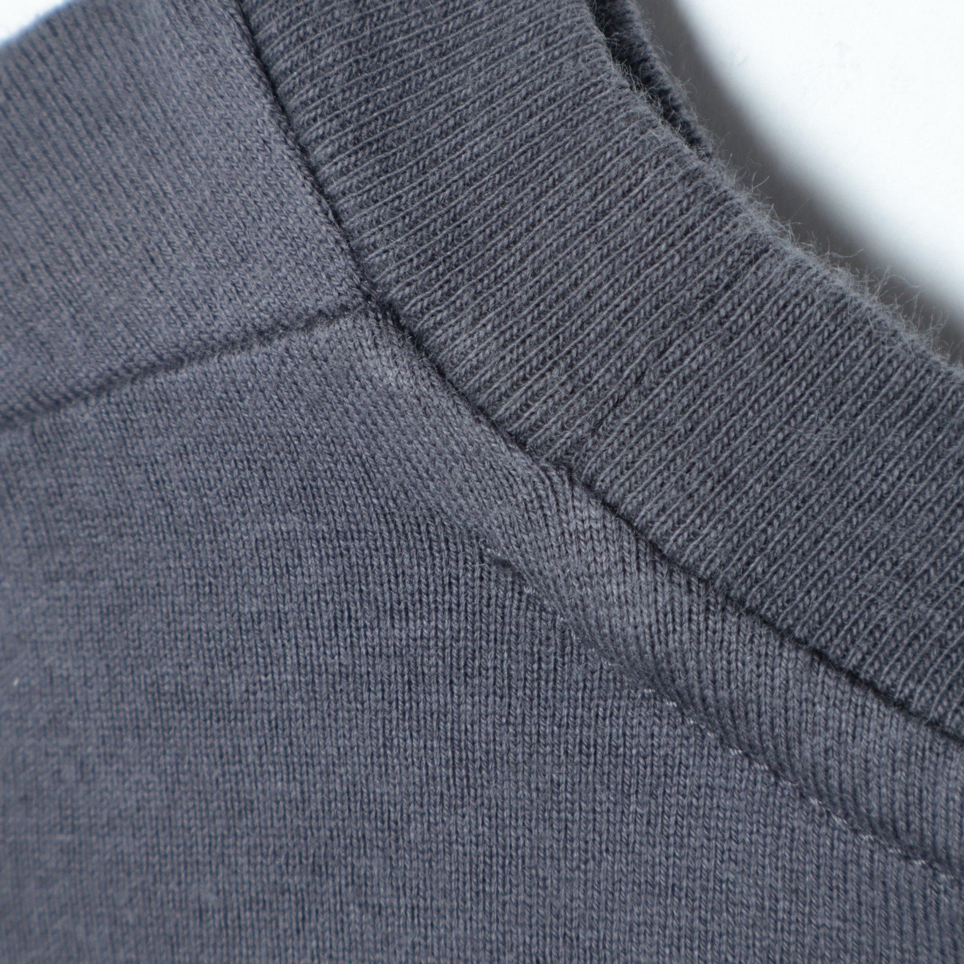 またこの生地は、ヘビーになりすぎないよう編み機をアレンジをし、ほどよい度詰め感で編んでいる為、度目がかなり詰まりつつも、風合いが硬くなりすぎない絶妙な仕上がりに。