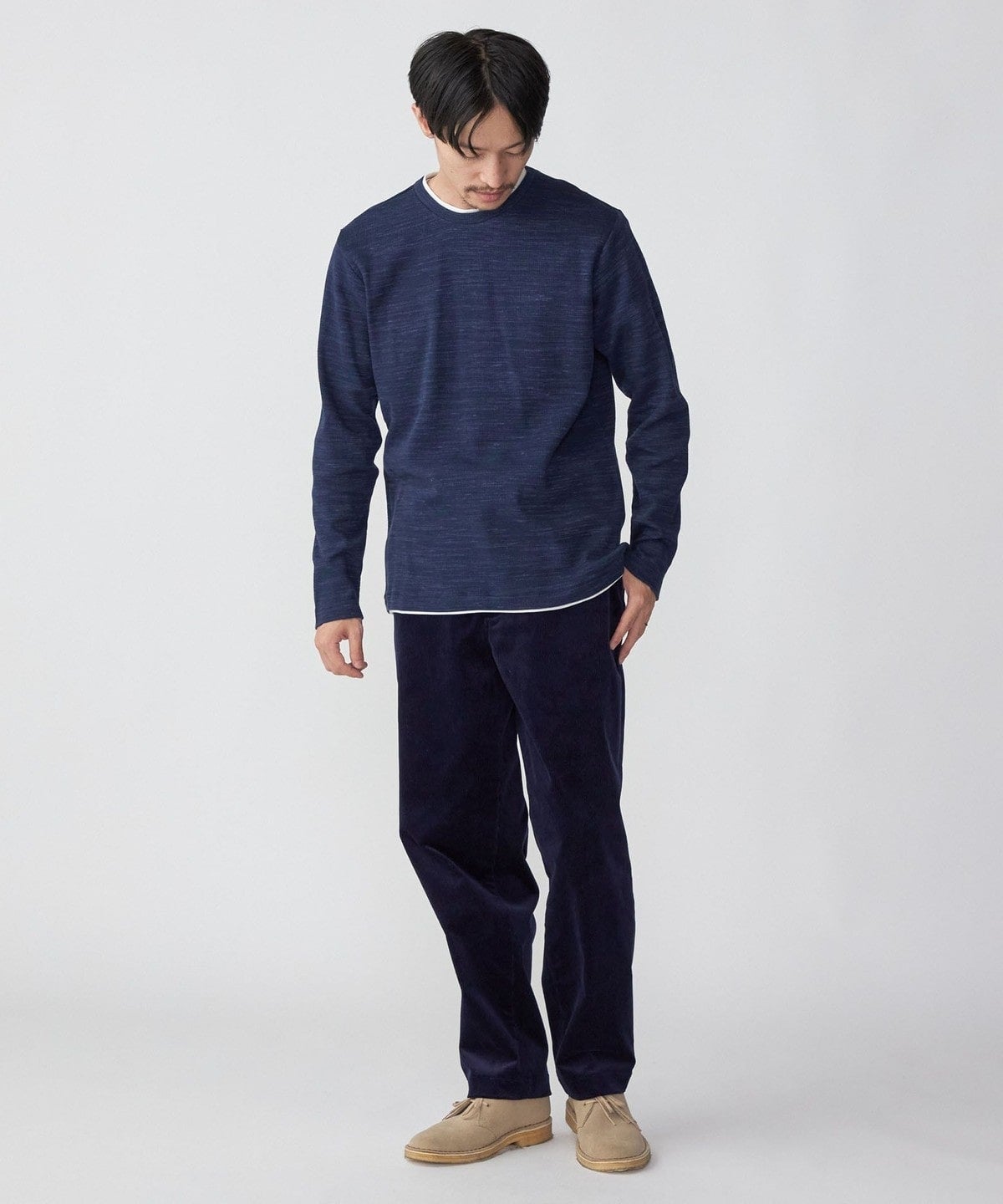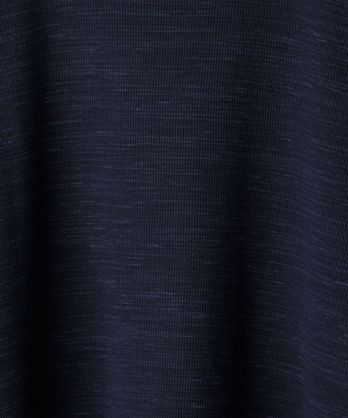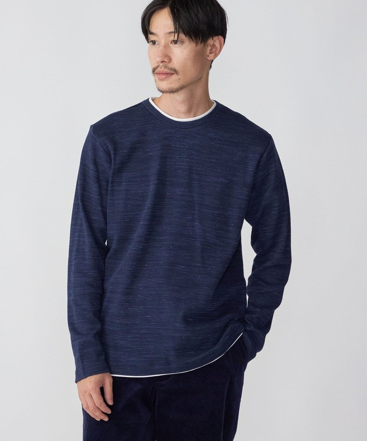 杢調のワッフル(サーマル)生地に、ネックと裾部分にフライス生地を配したフェイクレイヤードカットソー。
