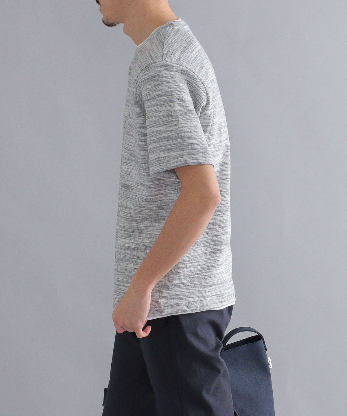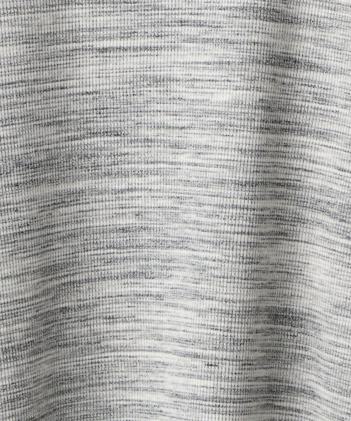 杢調のワッフル(サーマル)生地に、ネックと裾部分にフライス生地を配したフェイクレイヤードカットソー。
