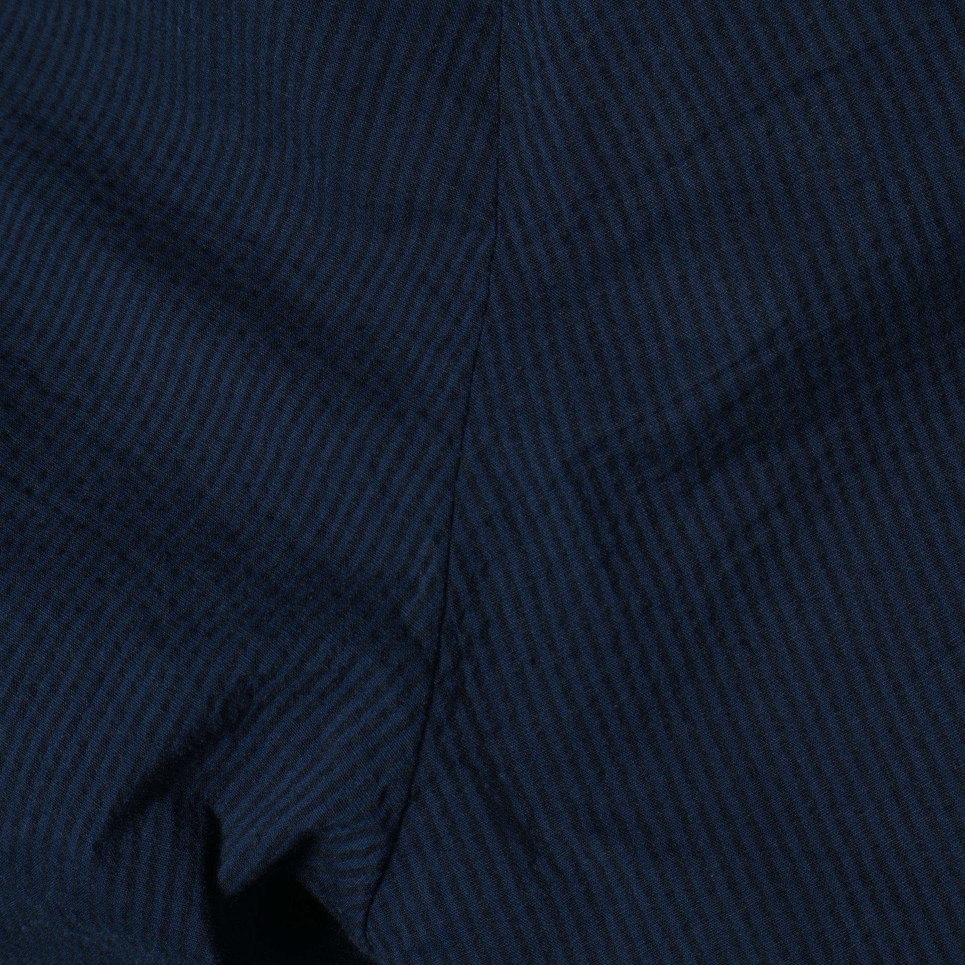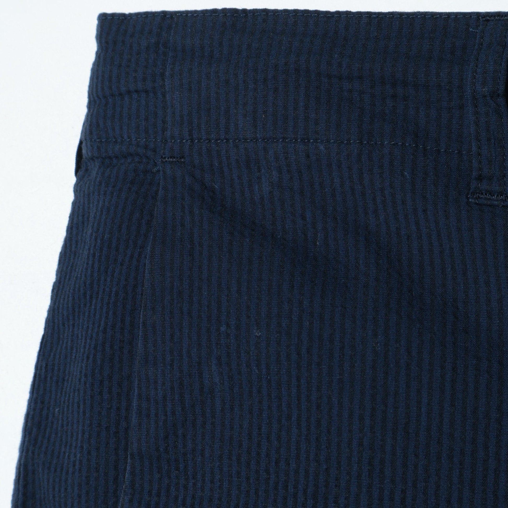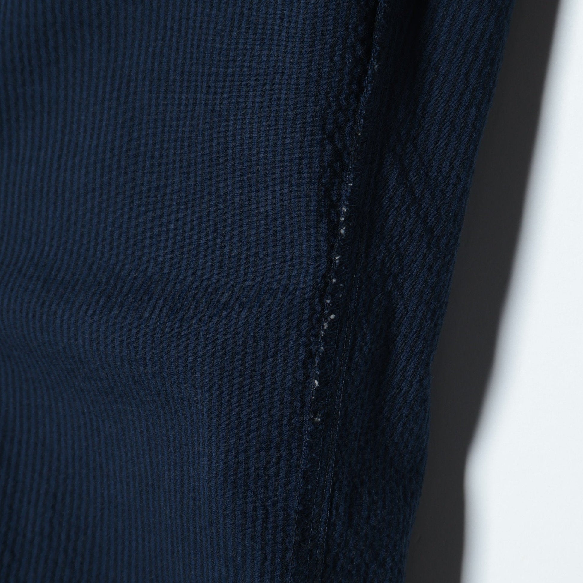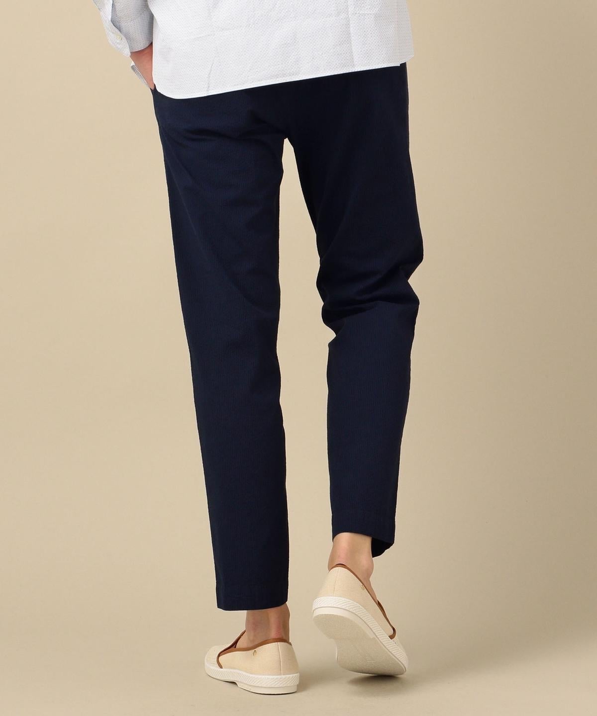 兵庫県は西脇市で織られた、経糸に綿、緯糸にシルクレーヨン混紡糸を使用したシアサッカー素材を用いたイージーパンツ。