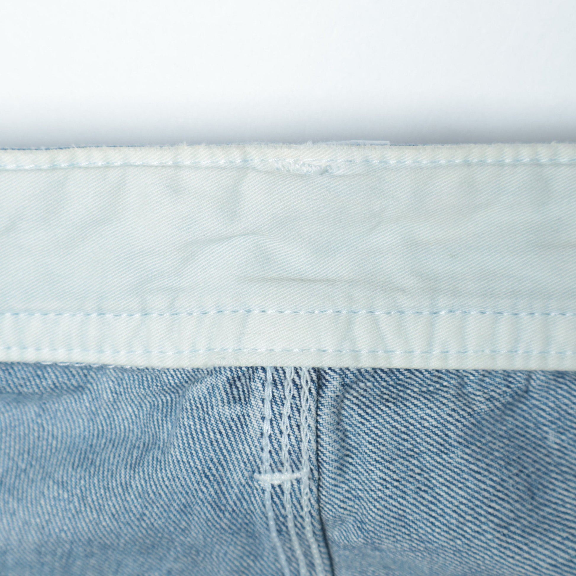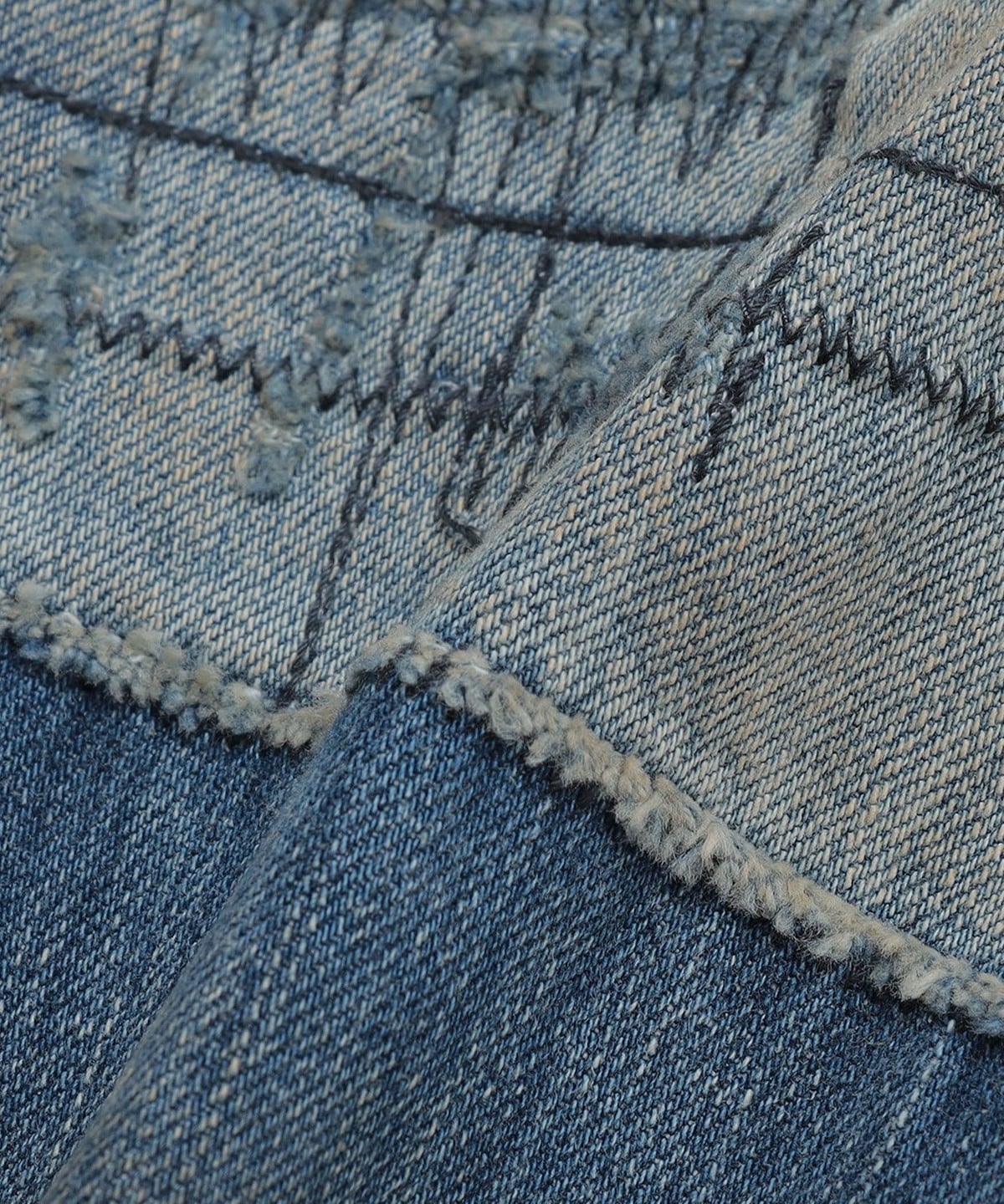 適度な厚みのデニムに、あて布やステッチなどのリメイク加工を施した一本。