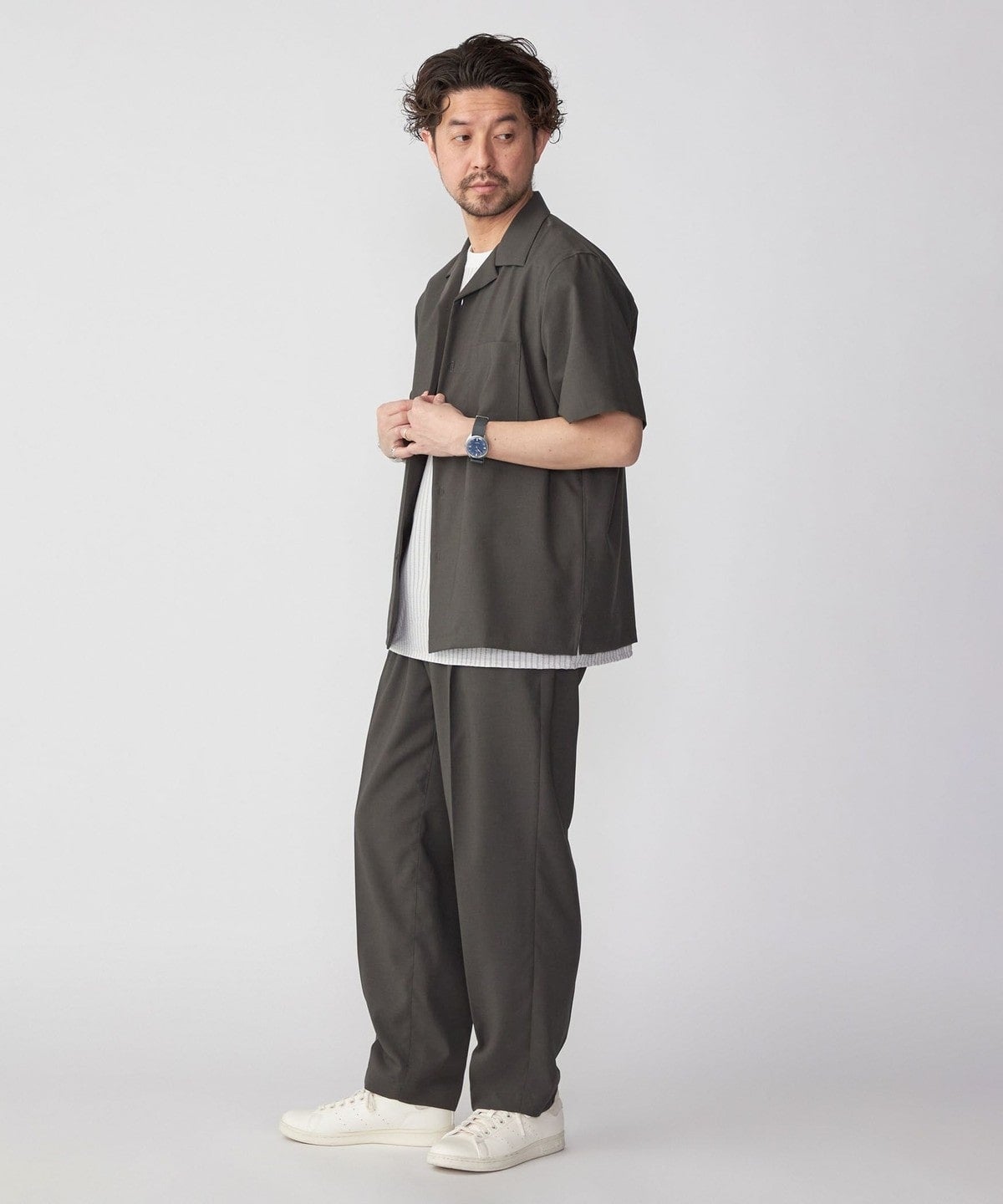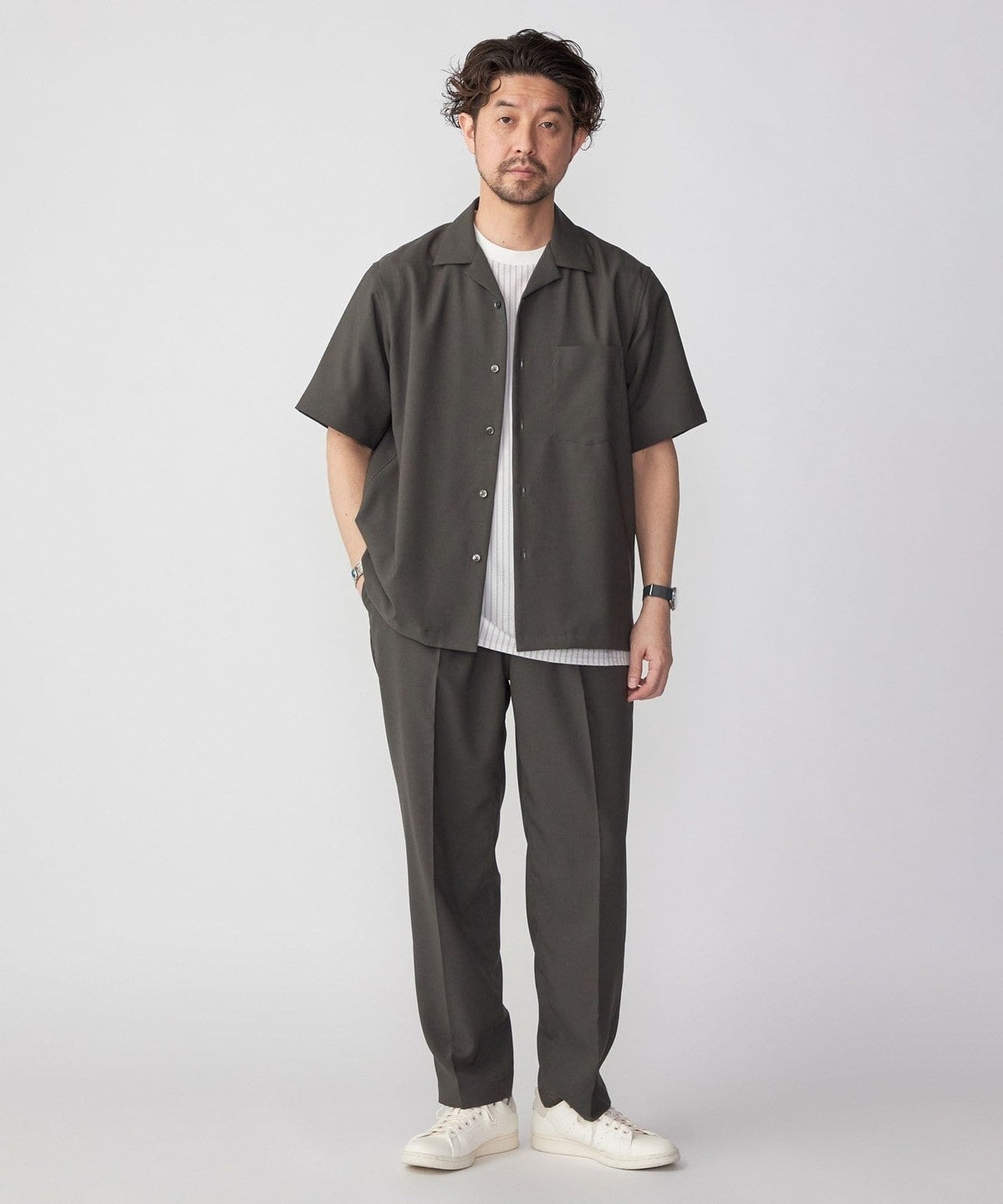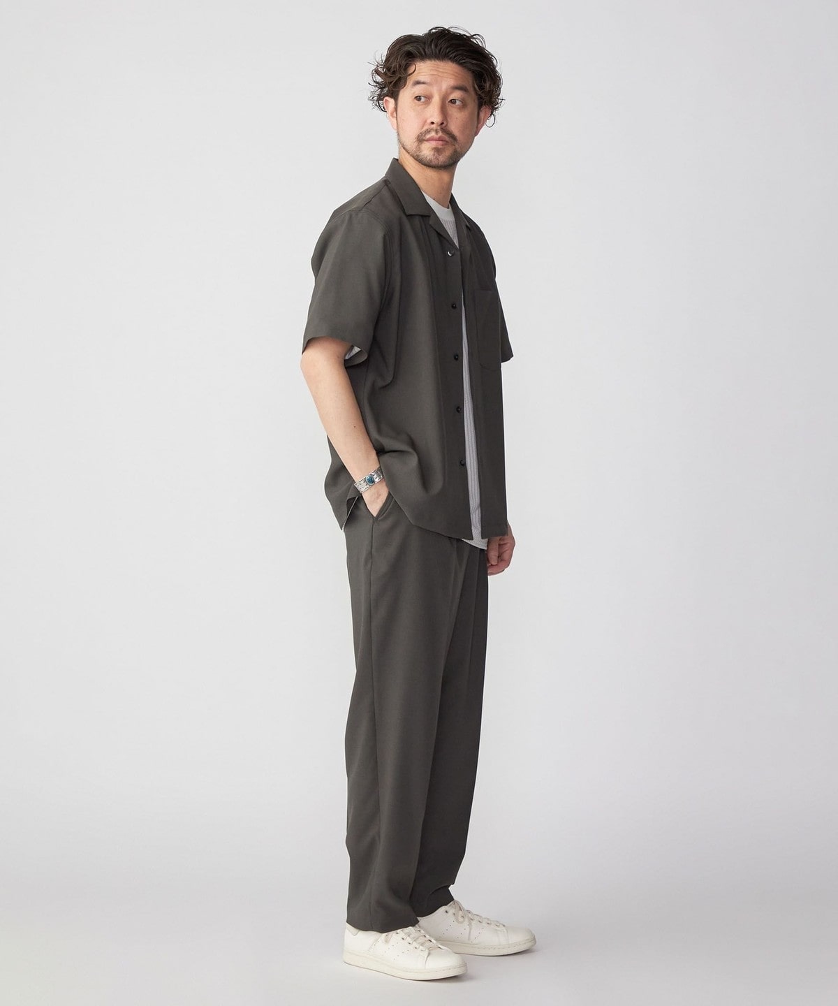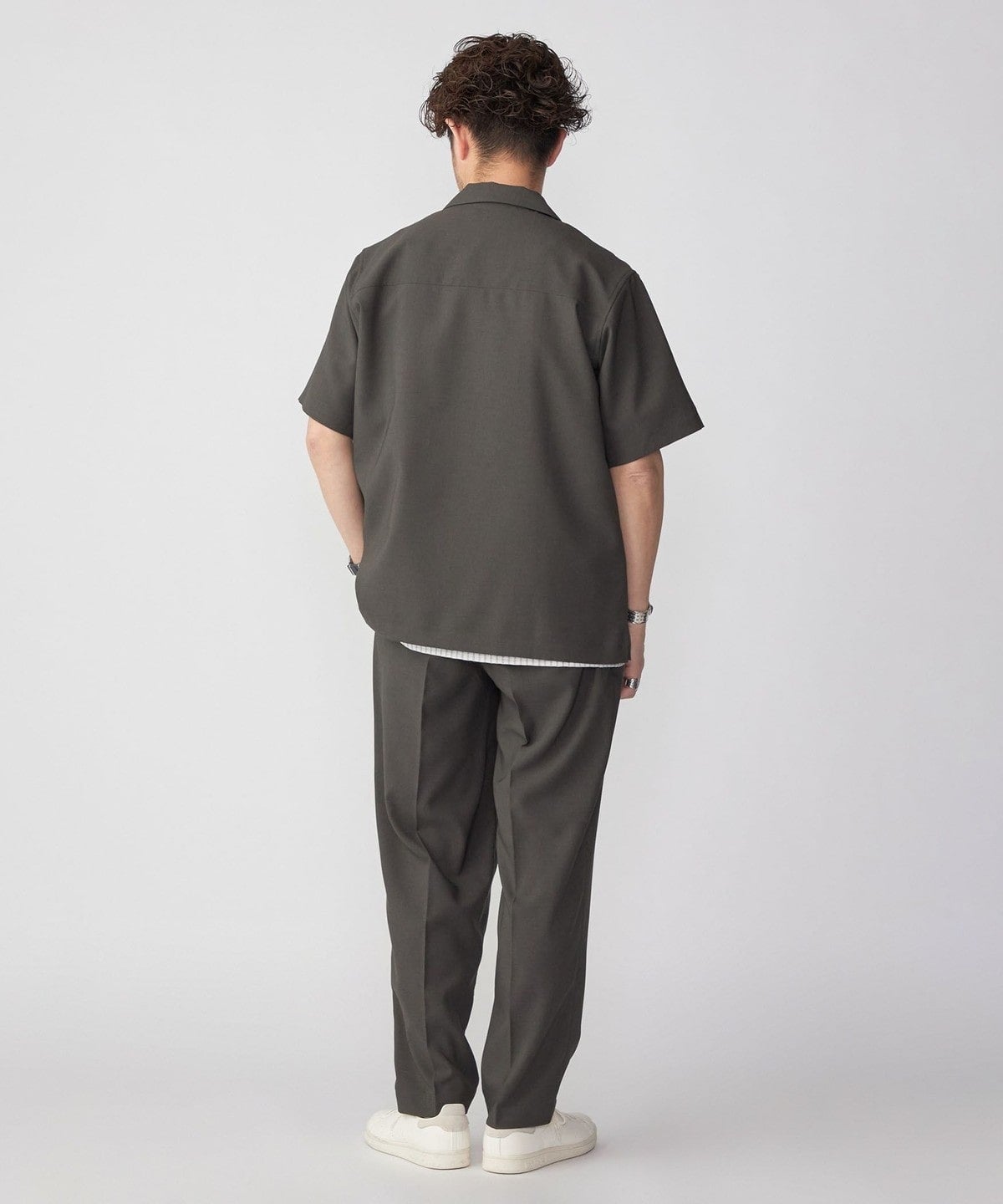 大人が着れる上品且つ端正なルックスの一着は、同生地を使用したオープンカラーシャツ<品番:111-51-3046>と合わせてセットアップでの着用もおススメです。