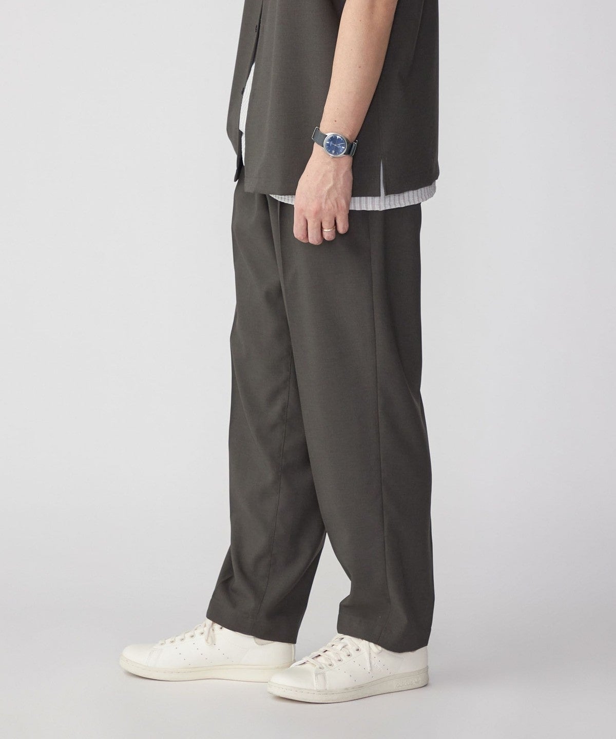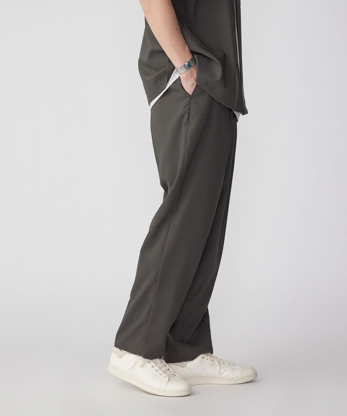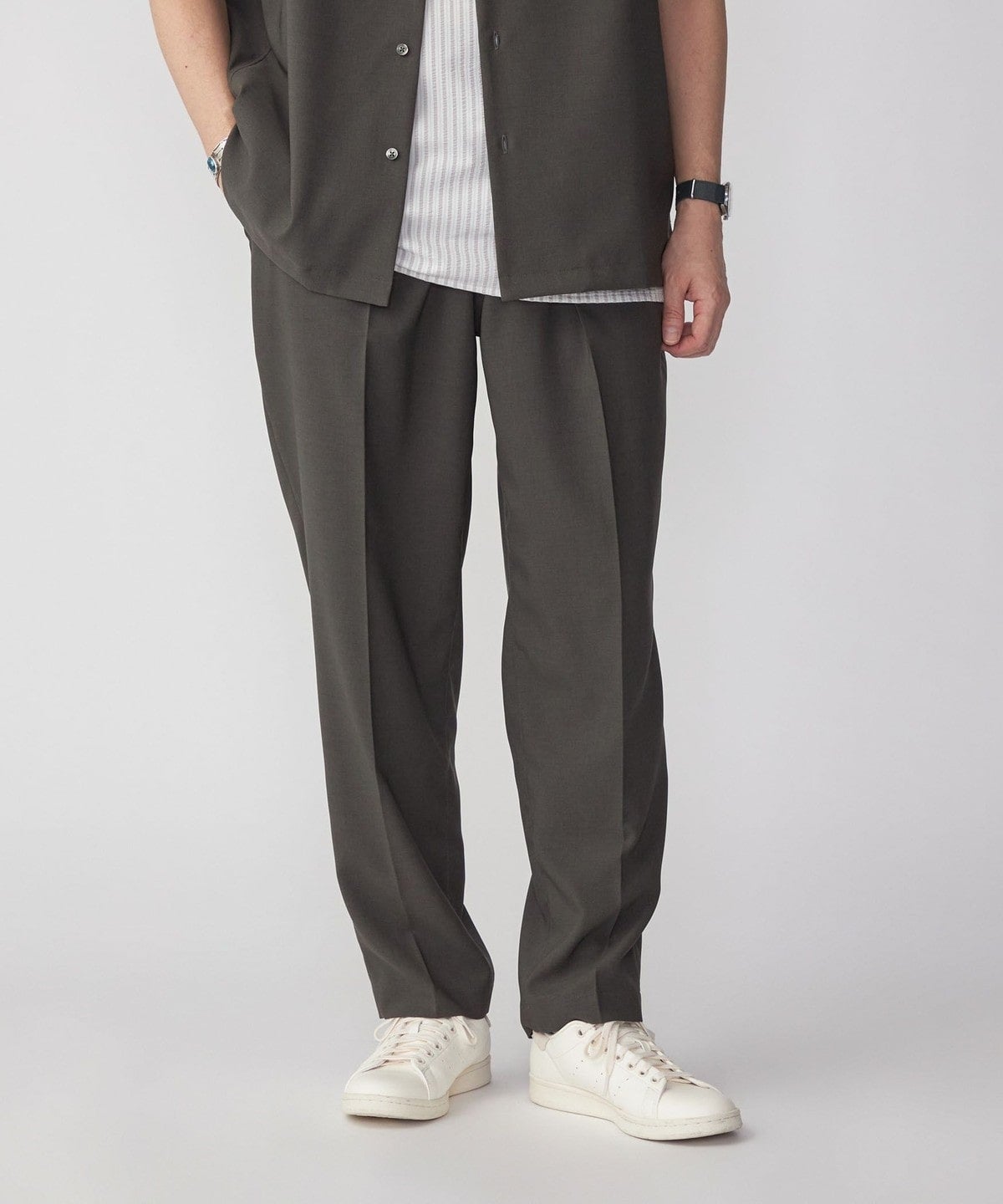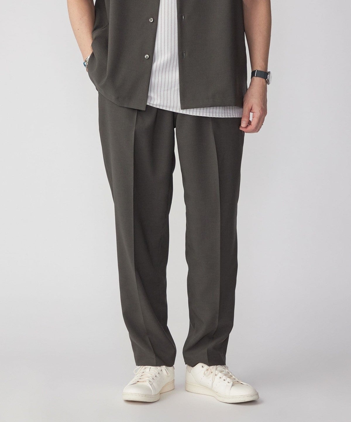 大人が着れる上品且つ端正なルックスの一着は、同生地を使用したオープンカラーシャツ<品番:111-51-3046>と合わせてセットアップでの着用もおススメです。