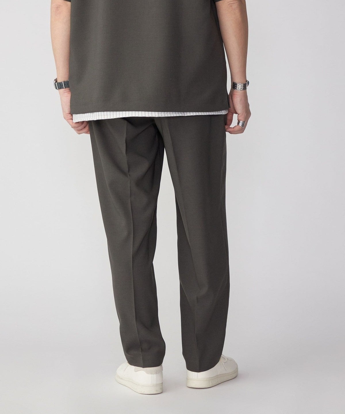 フィットは、ややテーパードをかけた程よくゆったりとしたシルエット。センタークリースを入れることで、よりキレイめな印象に仕上げています。後身頃のみゴムを入れ、内側にはドローコードでフィットの調整が可能です。