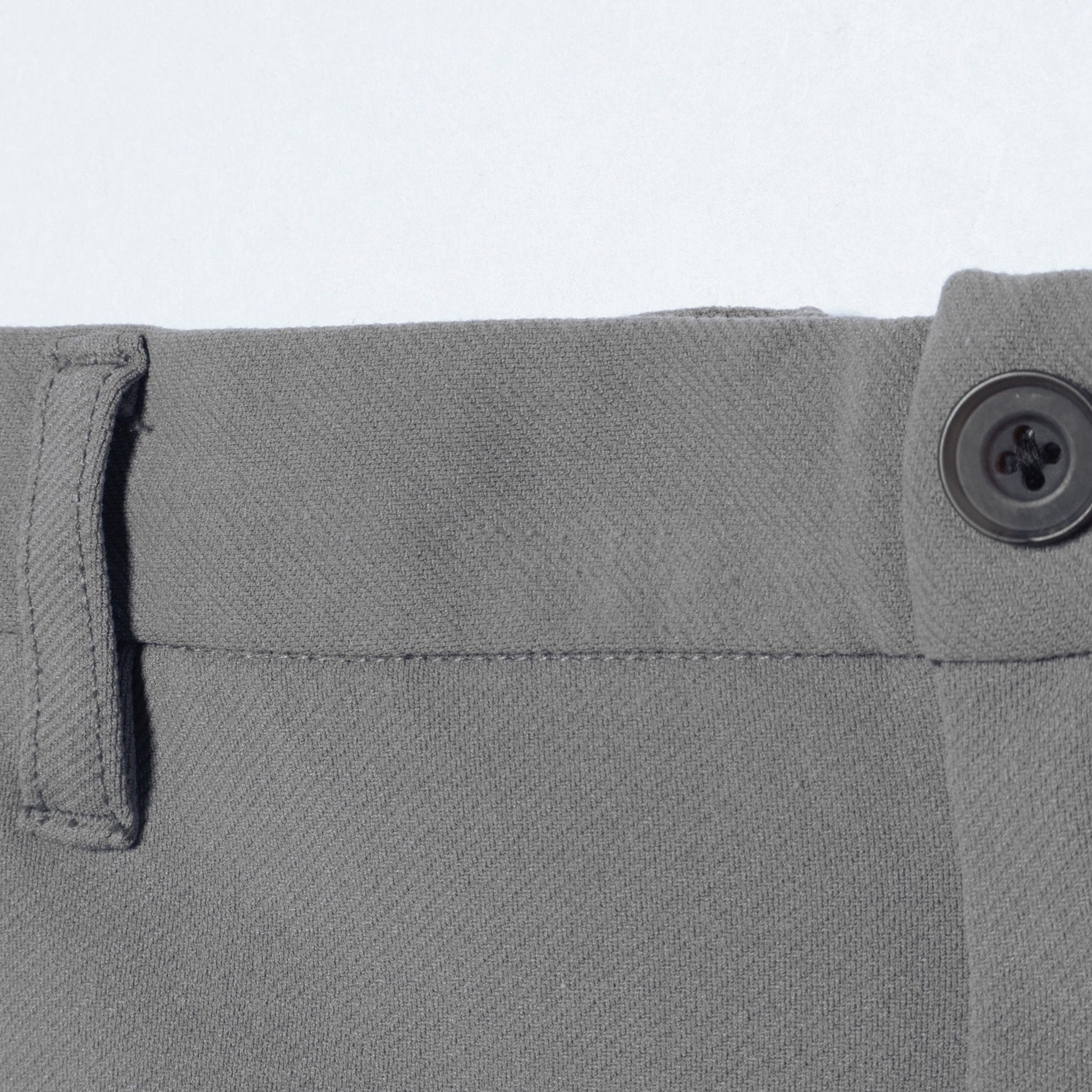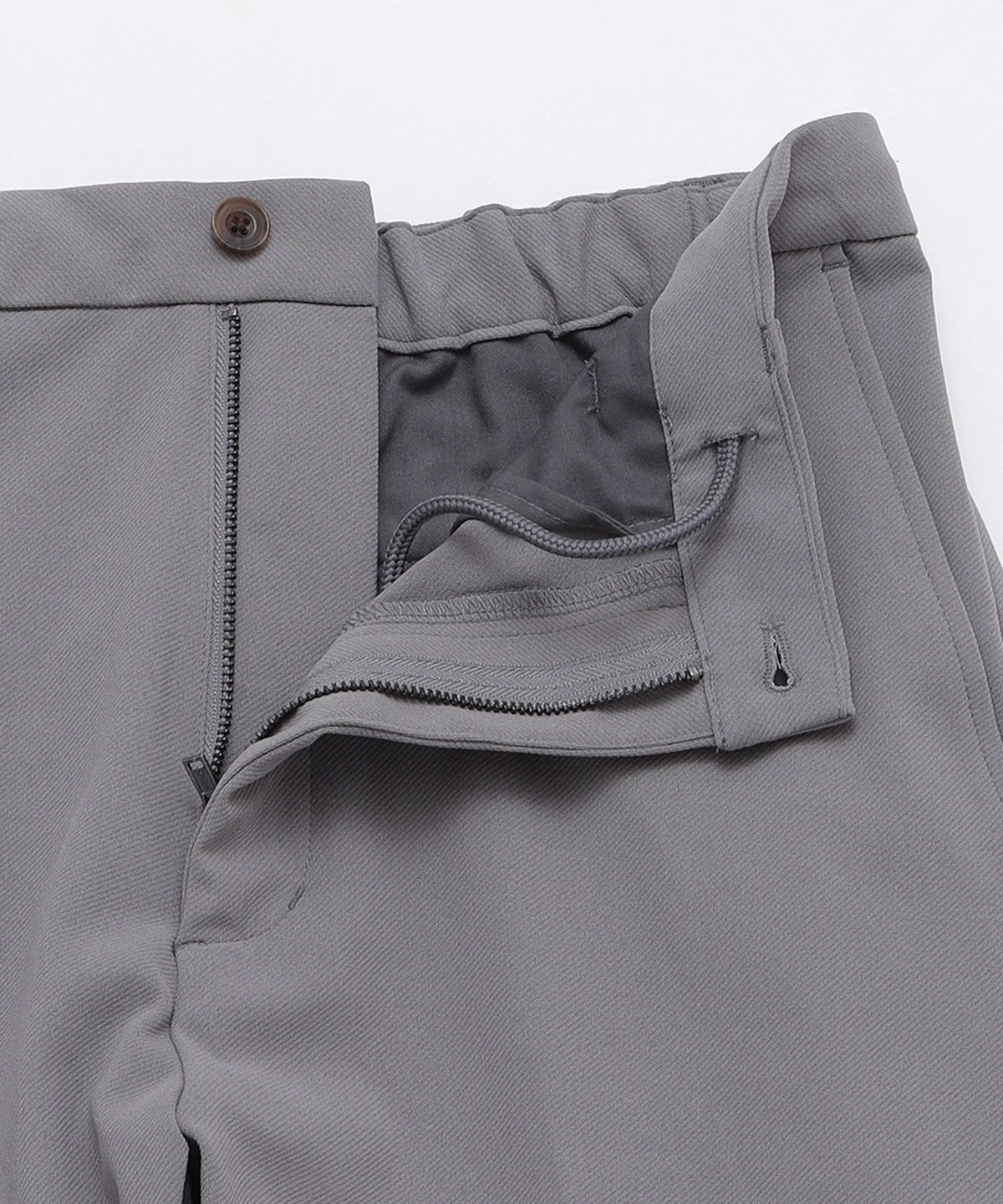 センタークリースを入れることで、よりキレイめな印象に仕上げています。ウエスト部分は後身頃のみゴム仕様にして、ドローストリング(紐)で調整が可能なためラクチンな穿き心地です。