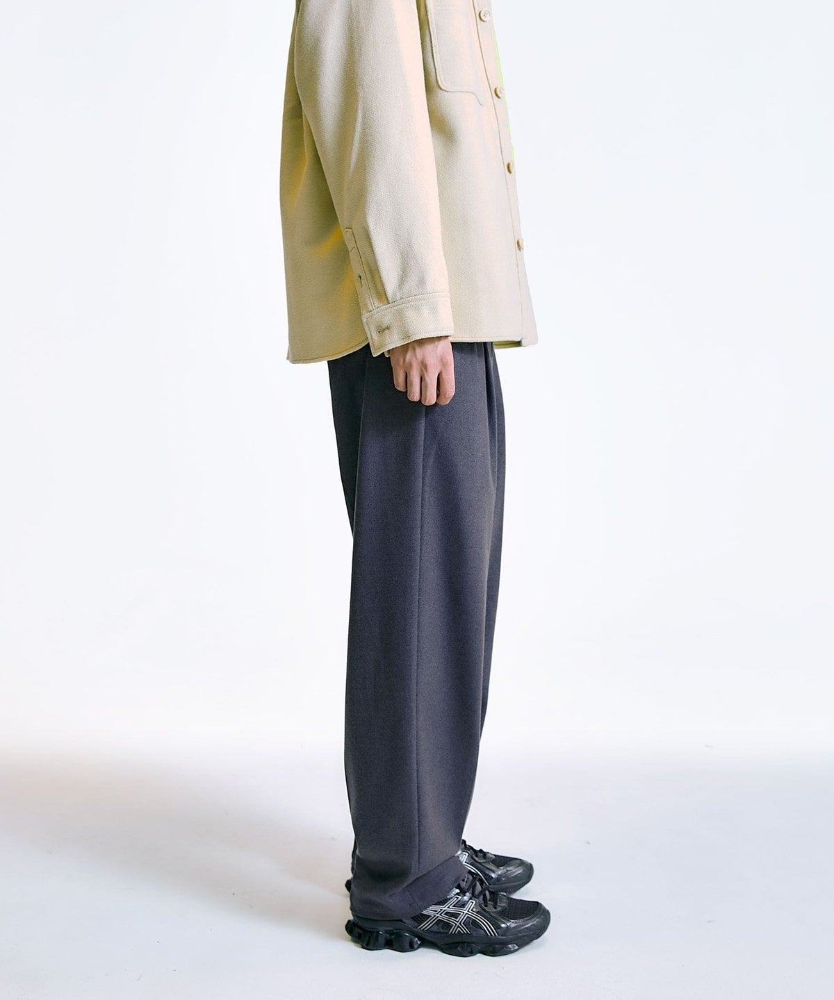 サイズ感はヒップ、ワタリを広く設定し、テーパードを利かせた野暮ったさを感じない上品なワイドシルエットに構築。センタークリースを入れることで、よりキレイめな印象に。