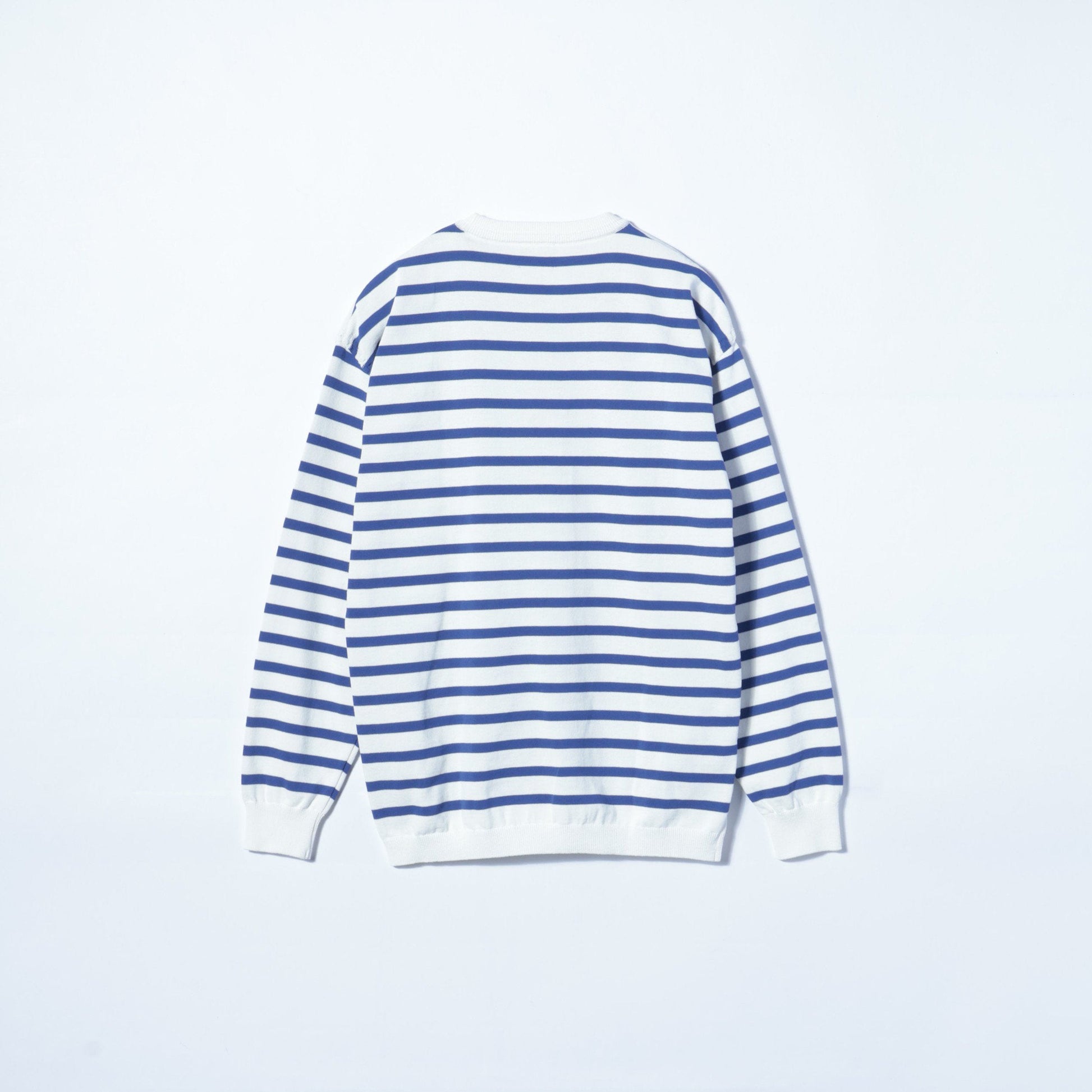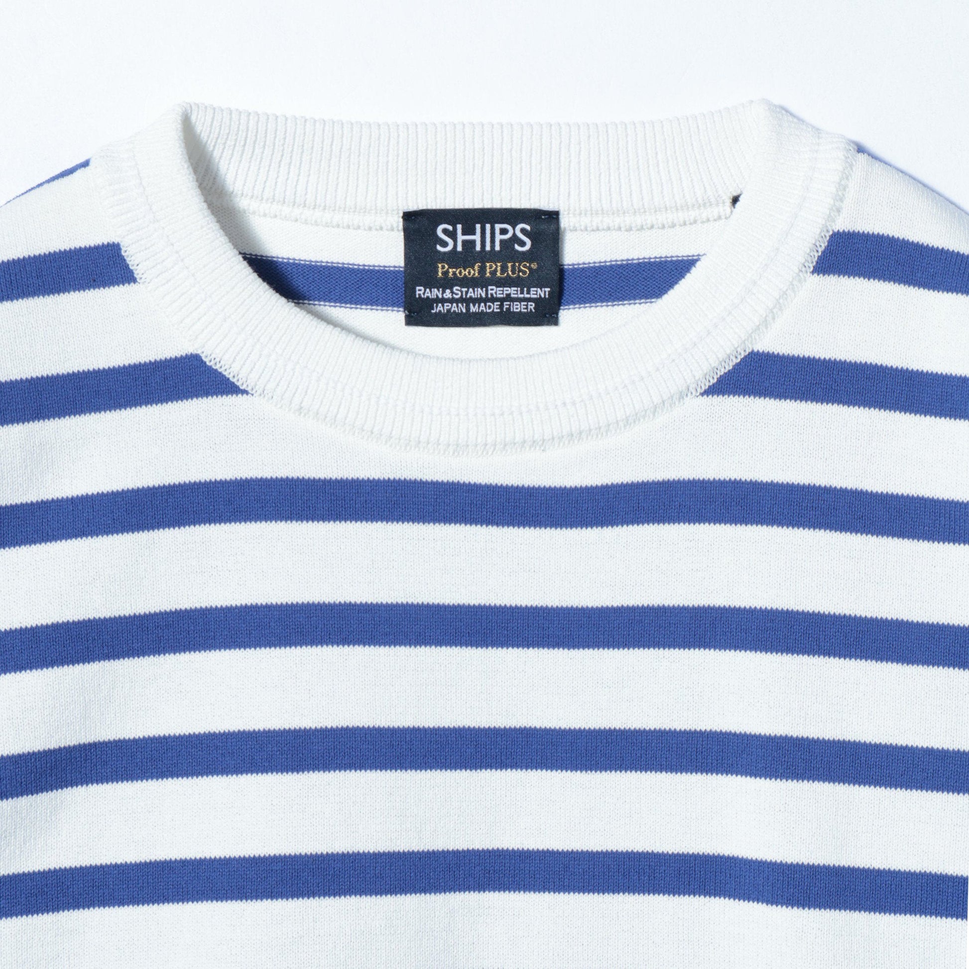特殊撥水加工糸(国産糸)の"PROOF PLUS(R)"を使用したミドルゲージのボーダーニット。コーヒー等のちょっとした汚れや、急な雨等を弾き、防いでくれる高機能素材です。