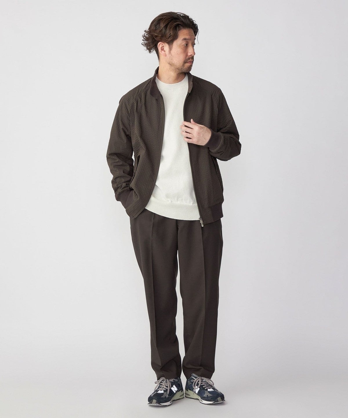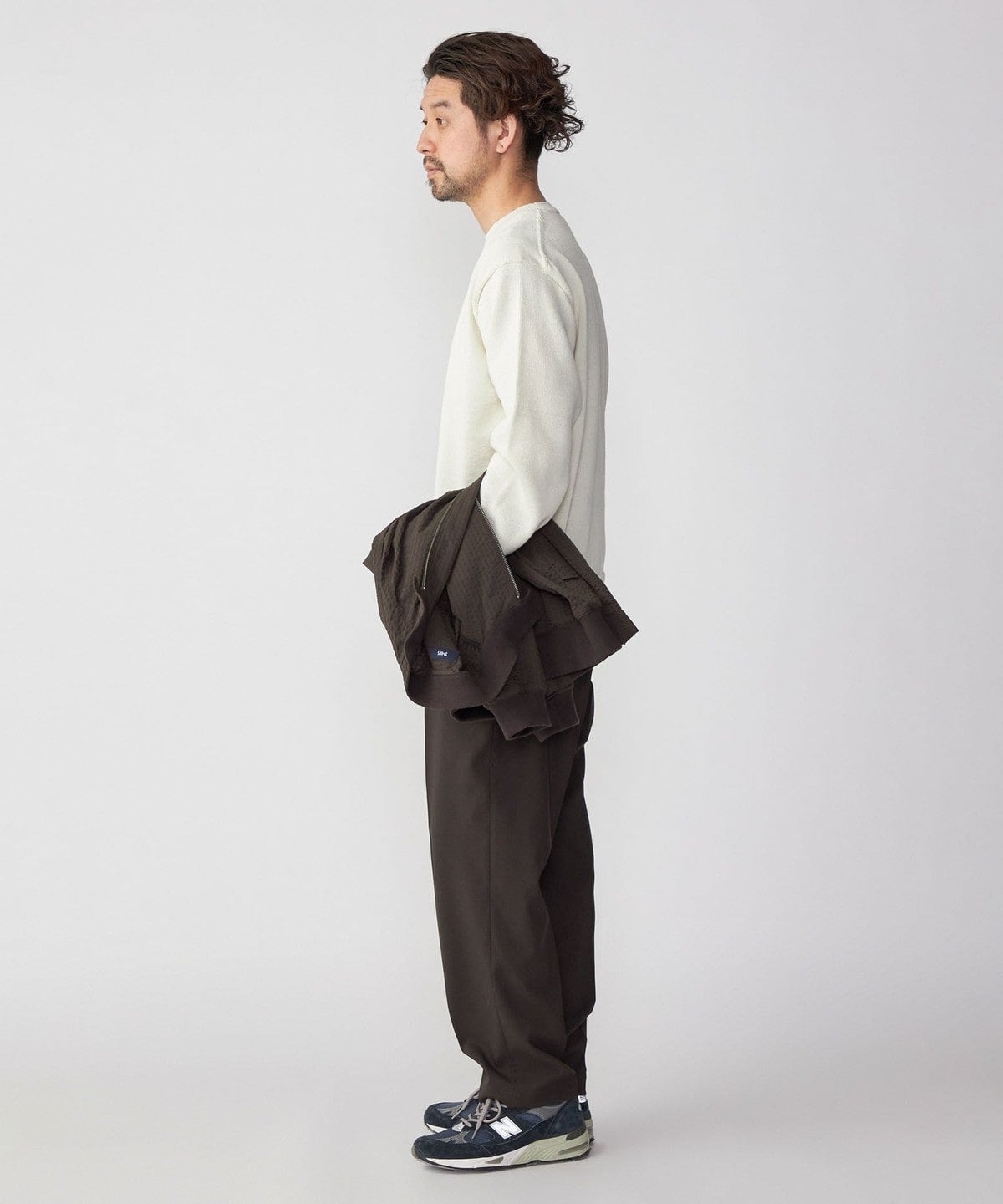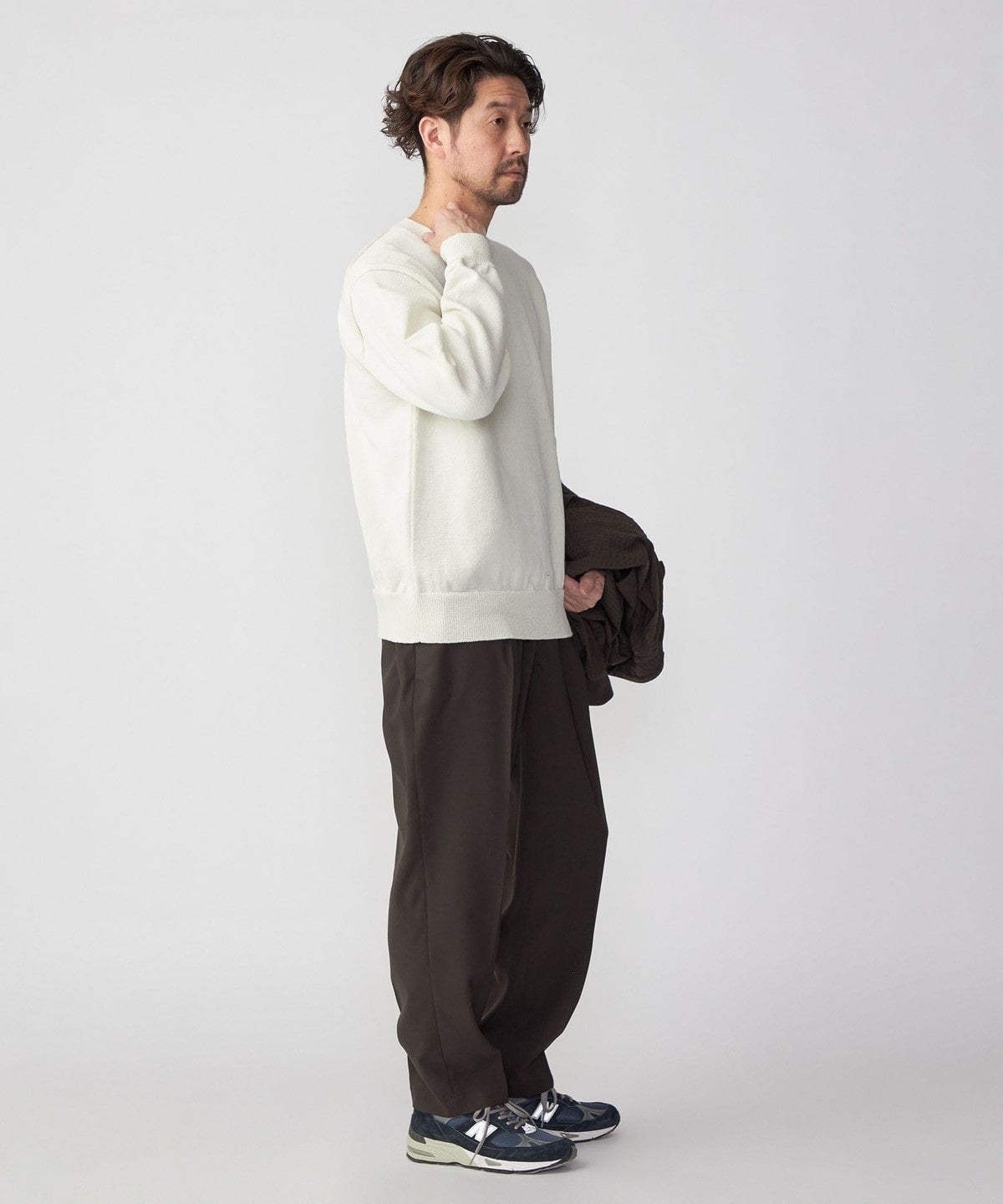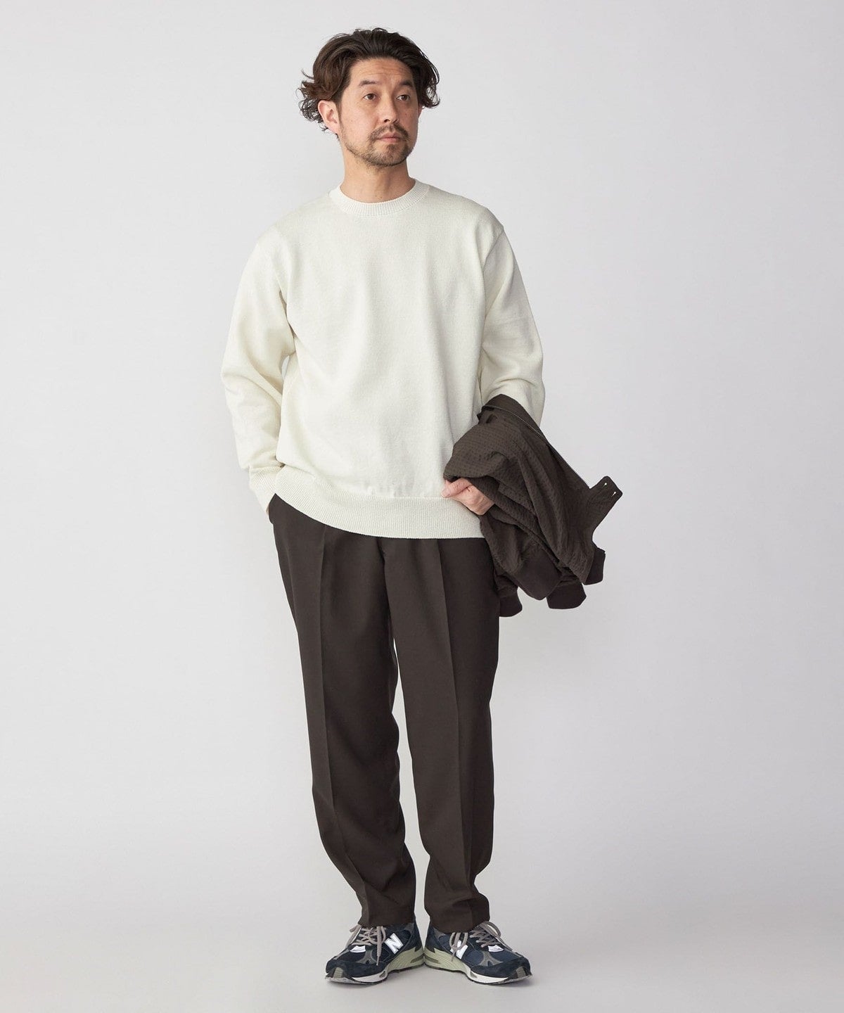 編地のハリ感がボディラインを拾いにくく、リラックス感のある上品なスタイリングを演出します。