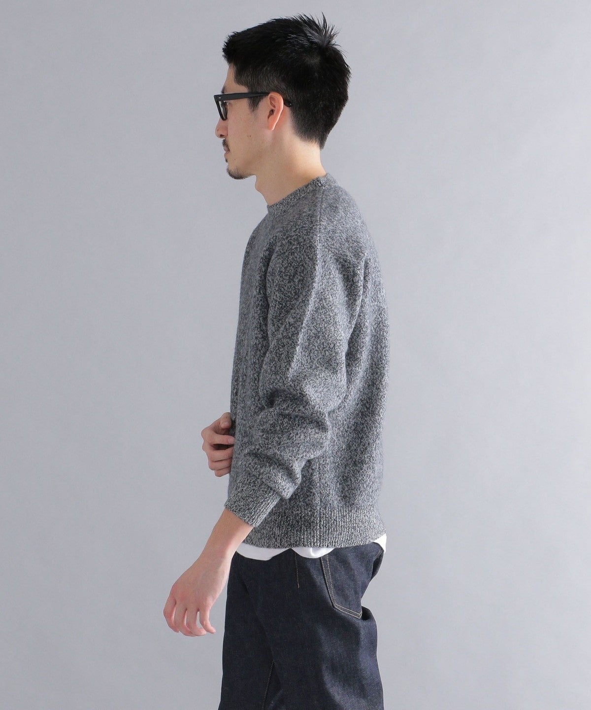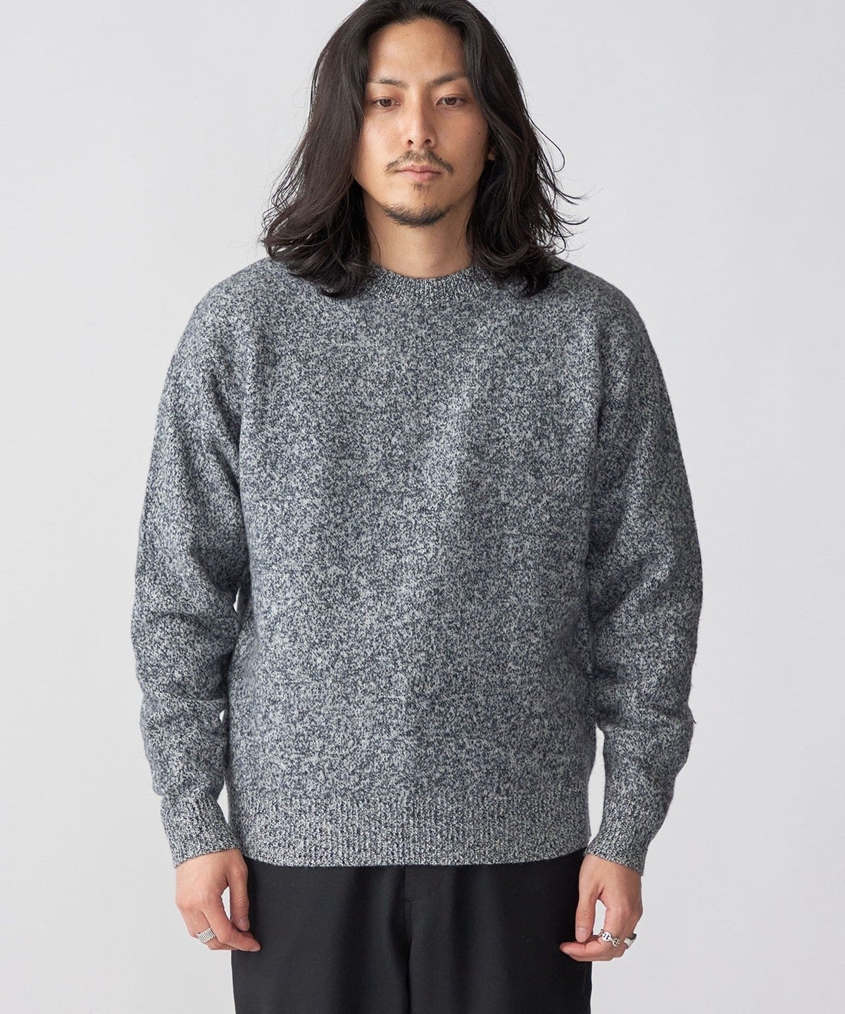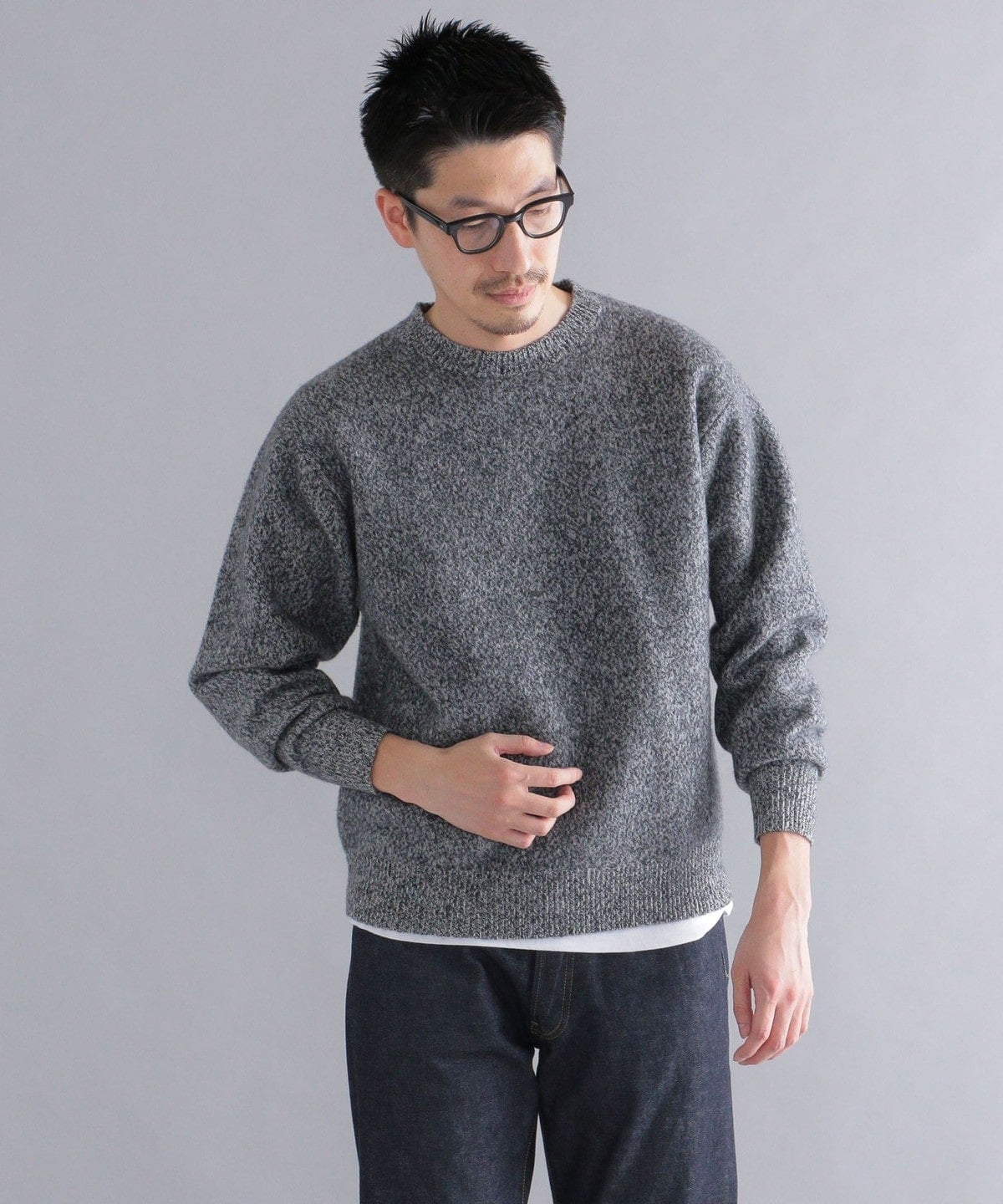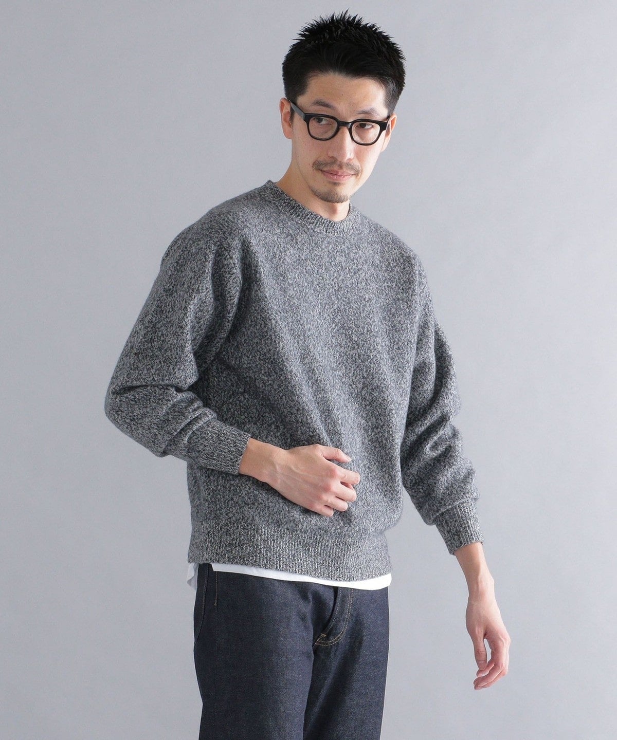 ムラ感のあるメランジニットの風合いがこなれ感を演出するクルーネックプルオーバー。