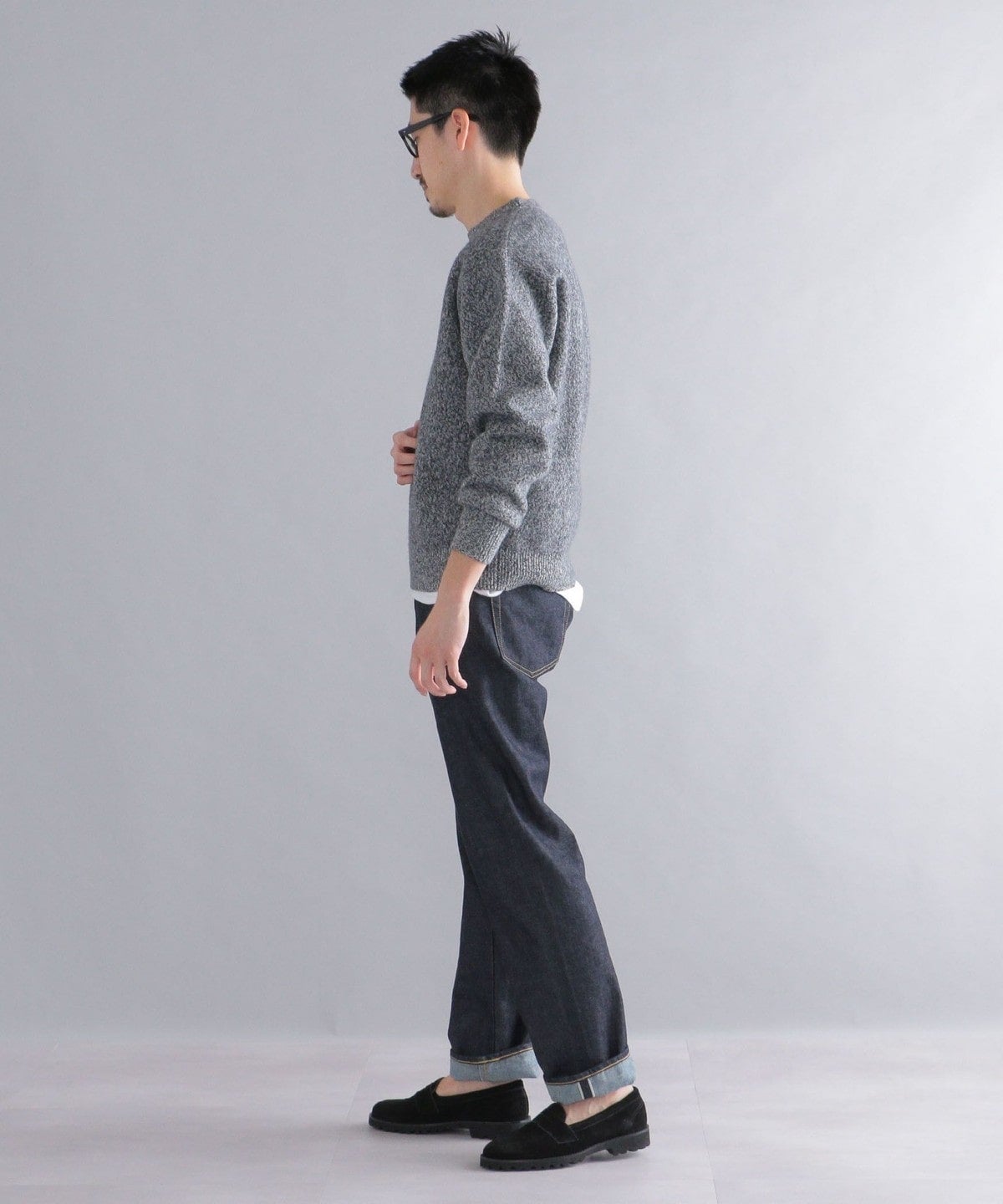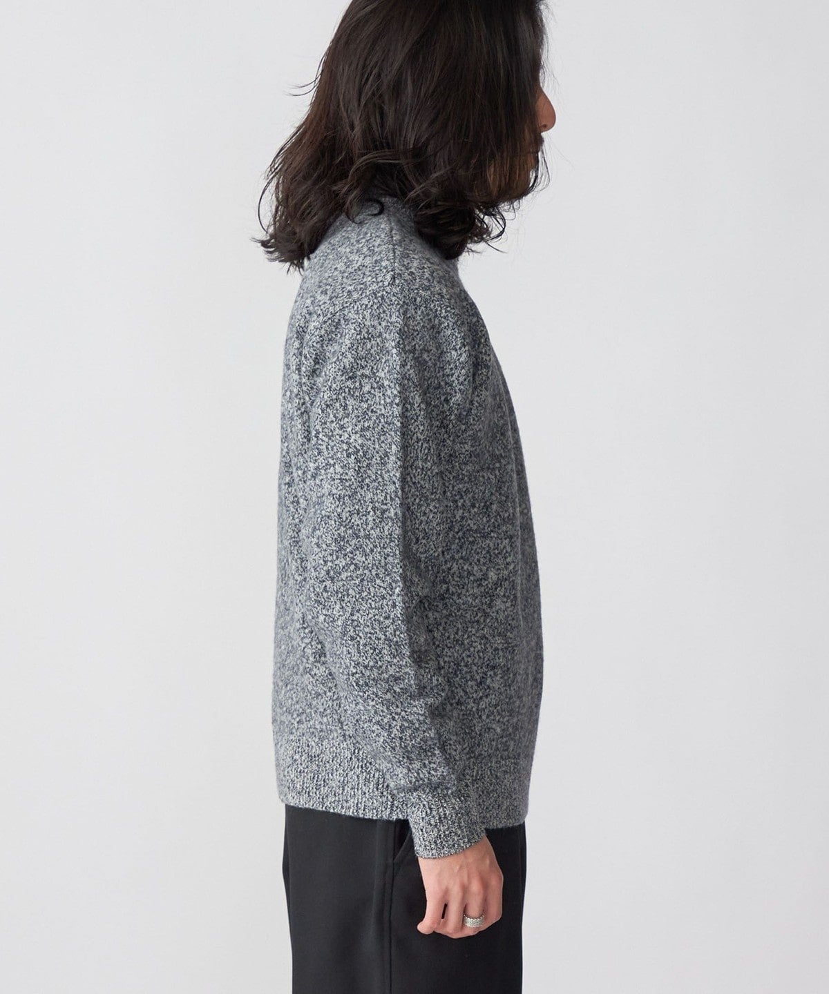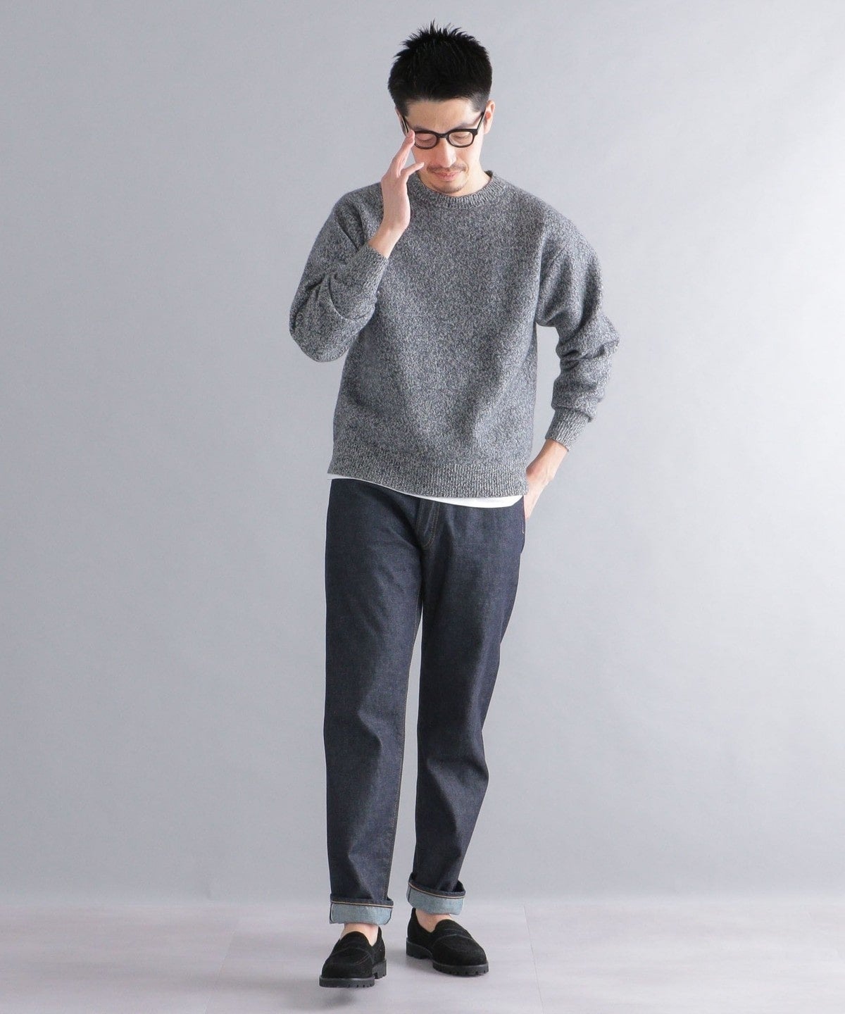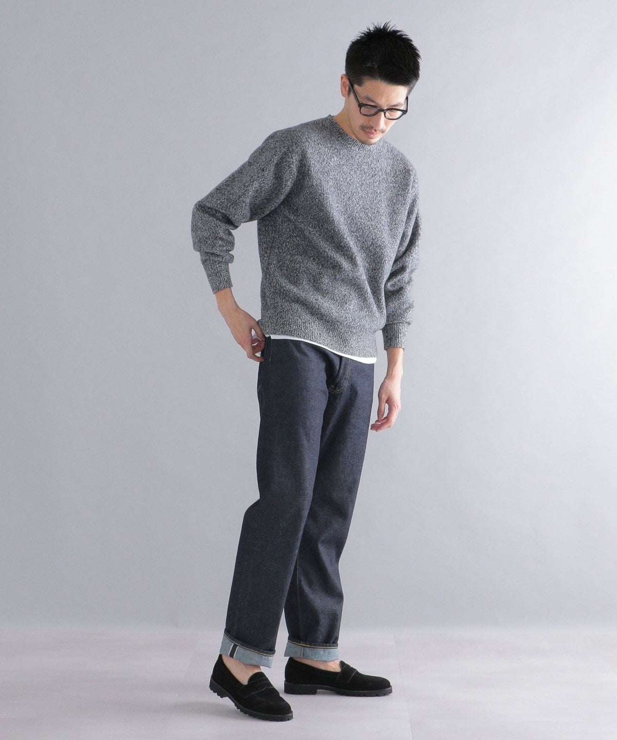 ムラ感のあるメランジニットの風合いがこなれ感を演出するクルーネックプルオーバー。
