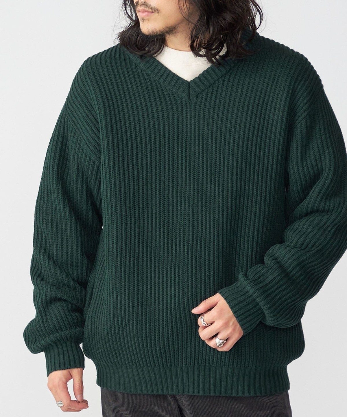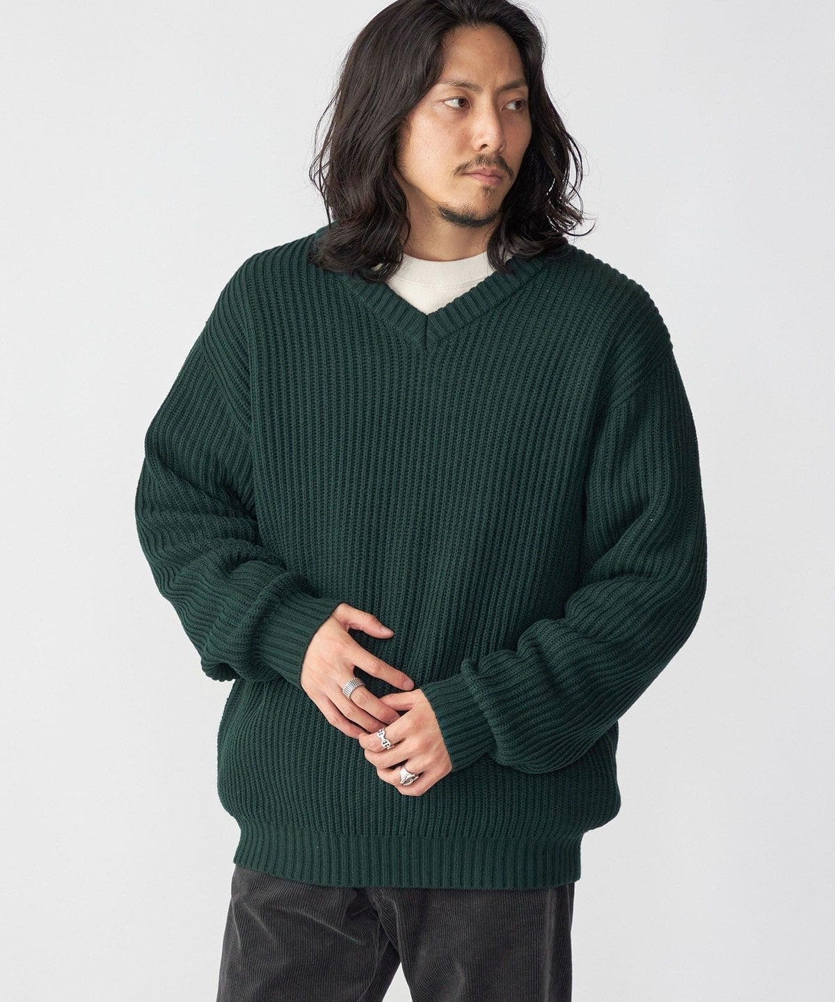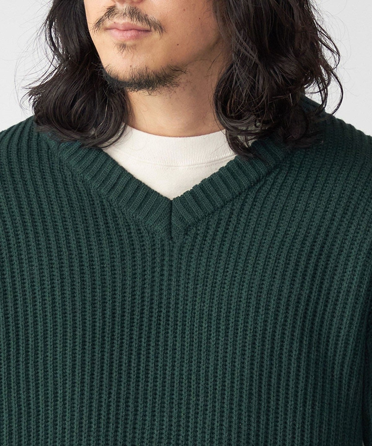 ボリューム感と暖かみのある風合いが特徴のVネックニット。