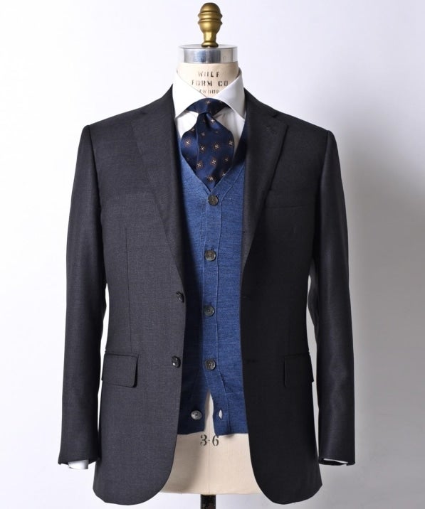 ネクタイがバランスよく出るVゾーンや、ベルトがしっかり隠れる着丈など、ビジネスでの着用を考慮したつくりとなっています。