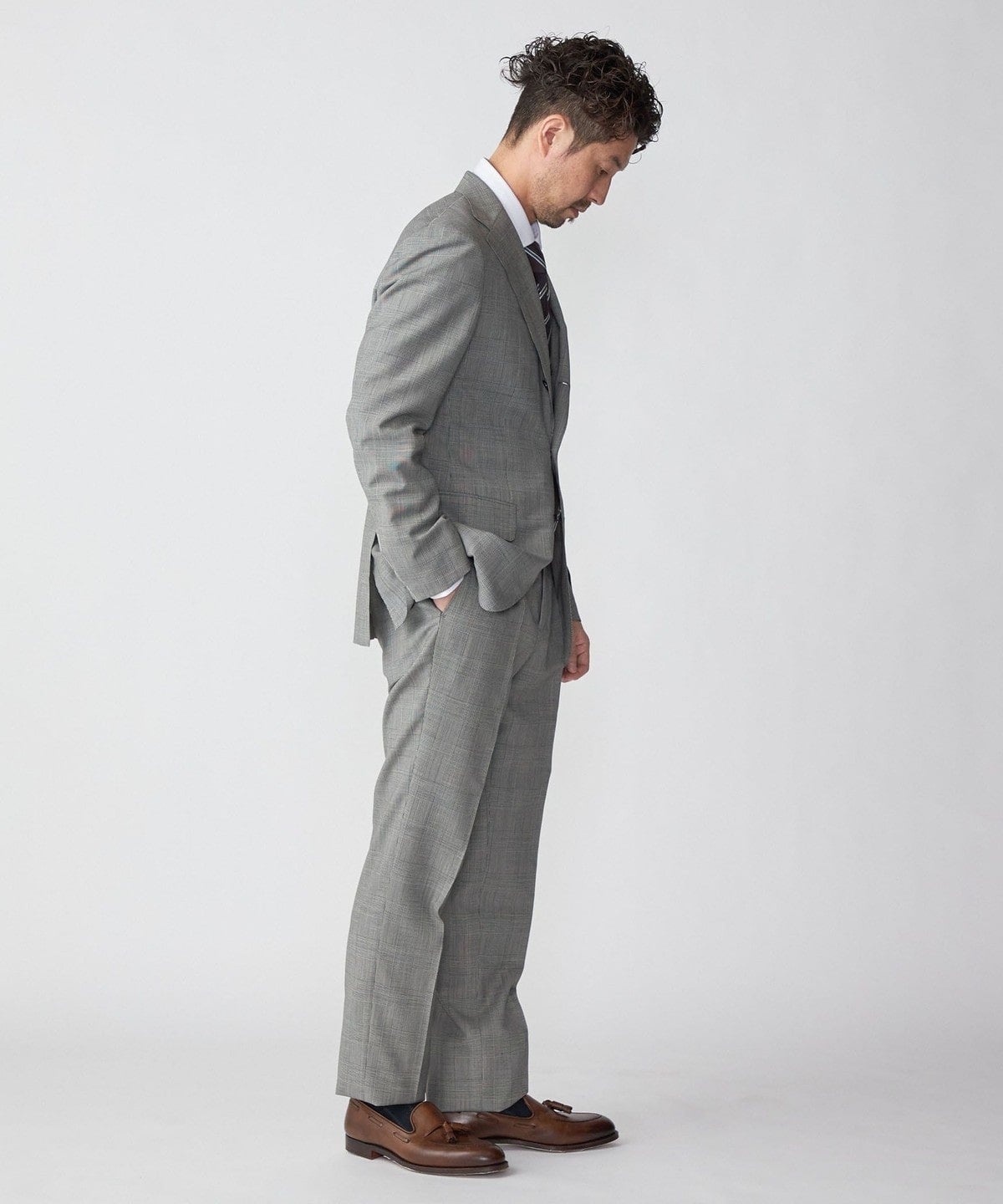 ◆人体工学に基づき着用感とシルエットを最優先した型紙を用い、卓越した縫製技術で美しく立体的に作られたテーラードスーツ。