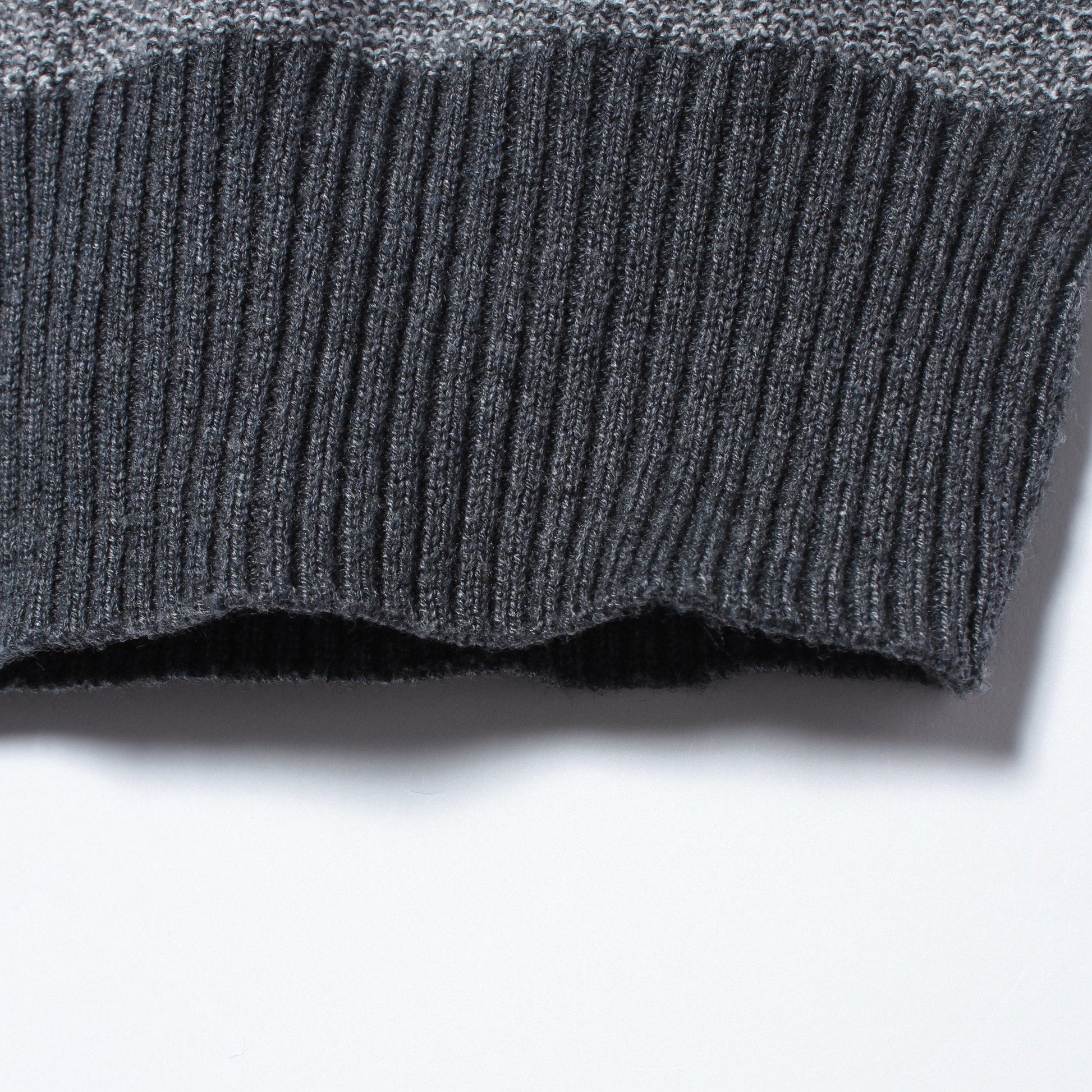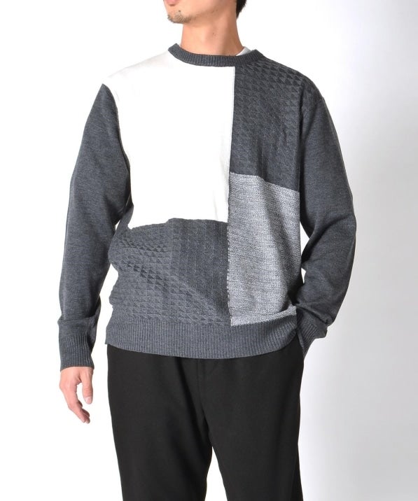 前身ごろを様々な編地を組み合わせたパッチワーク風ニット。色目もあえて同色系であわせることで適度な存在感と着まわしやすさのバランスの取れたアイテムに仕上がっております。