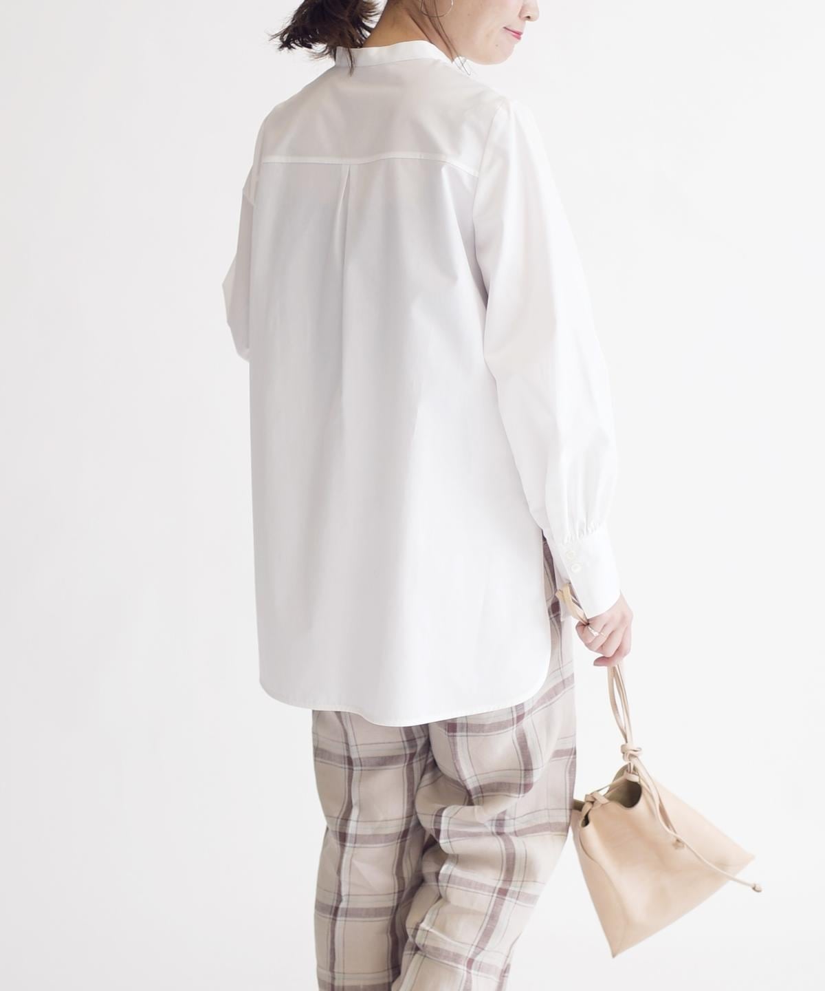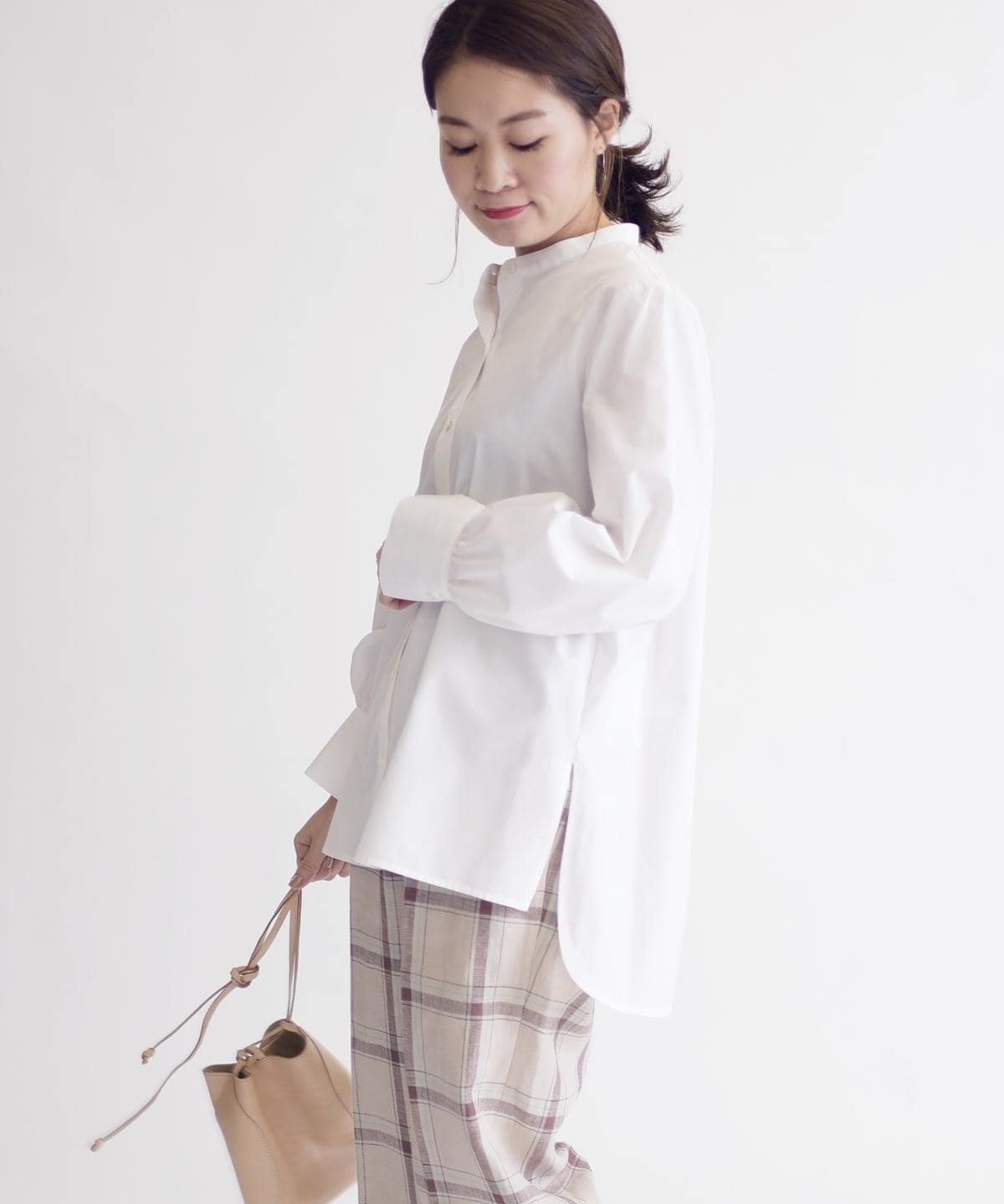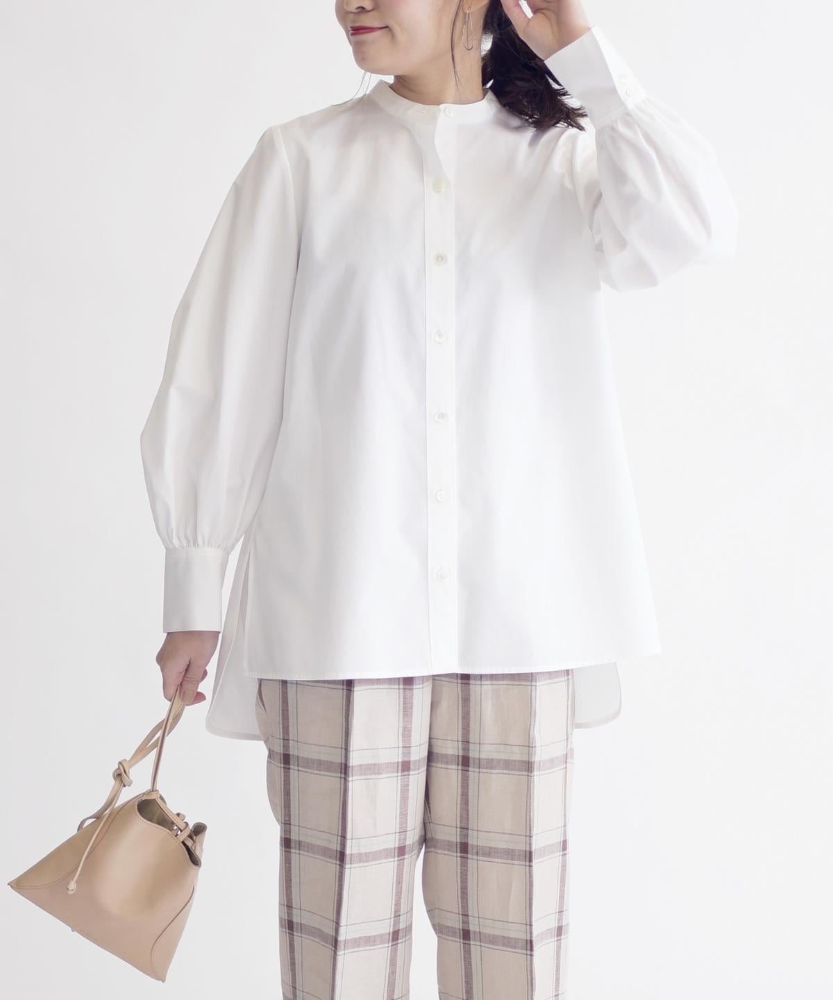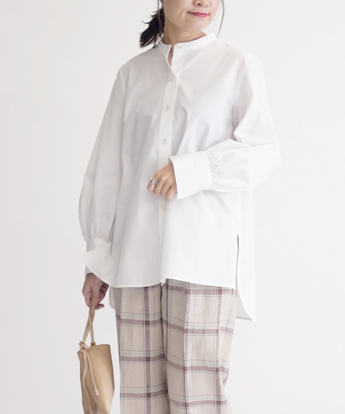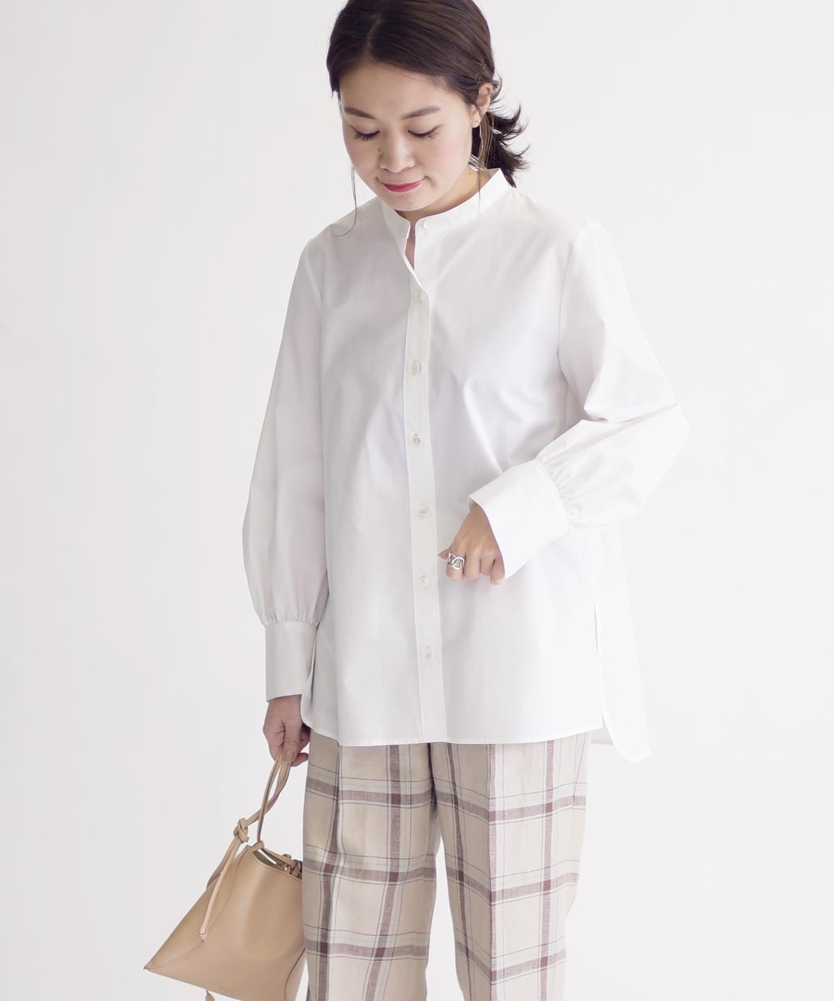 袖にボリュームをもたせマニッシュな印象の強いバンドカラーに女性らしさを加えています。