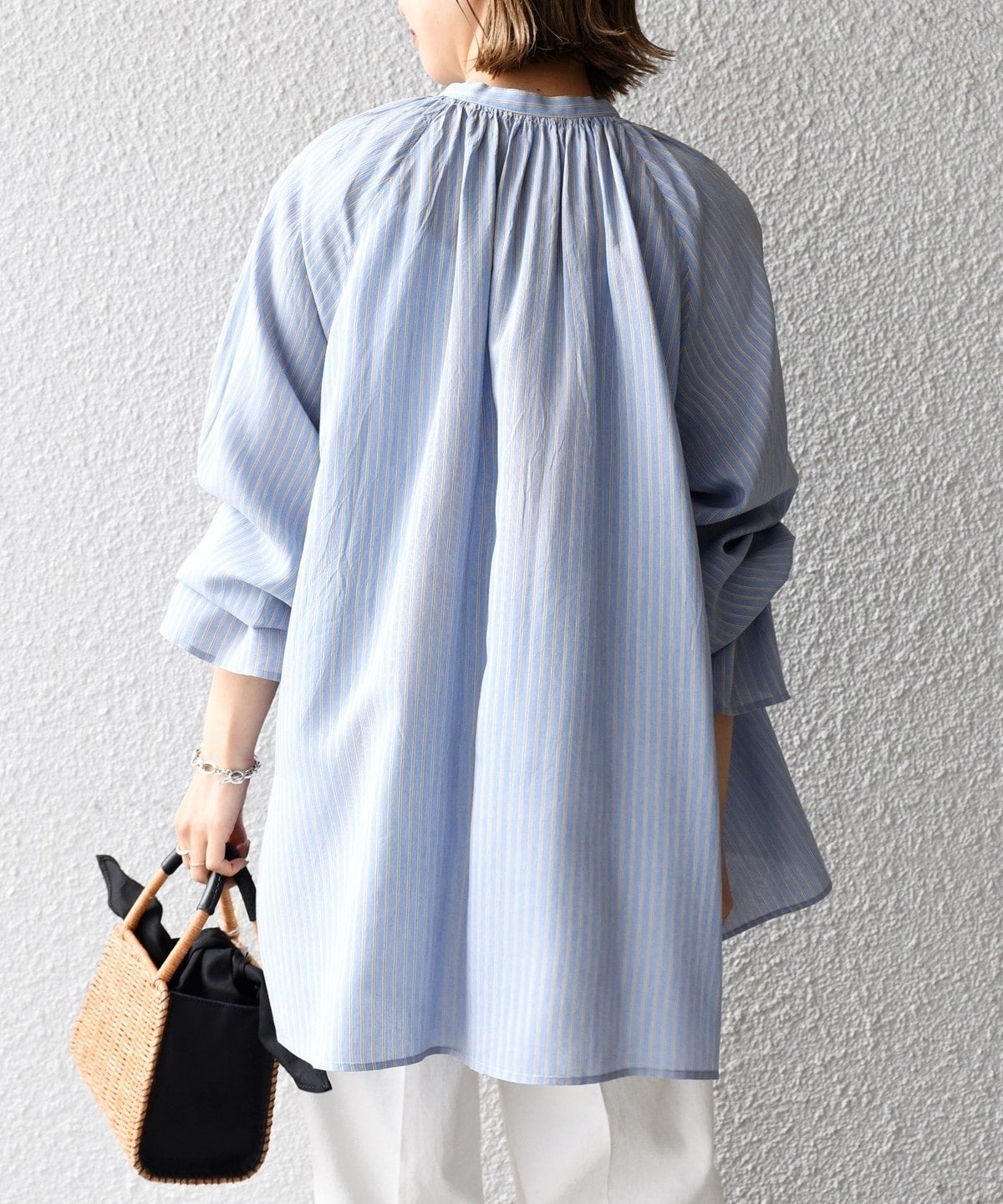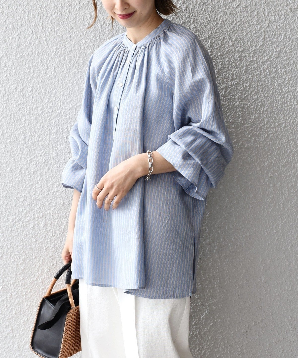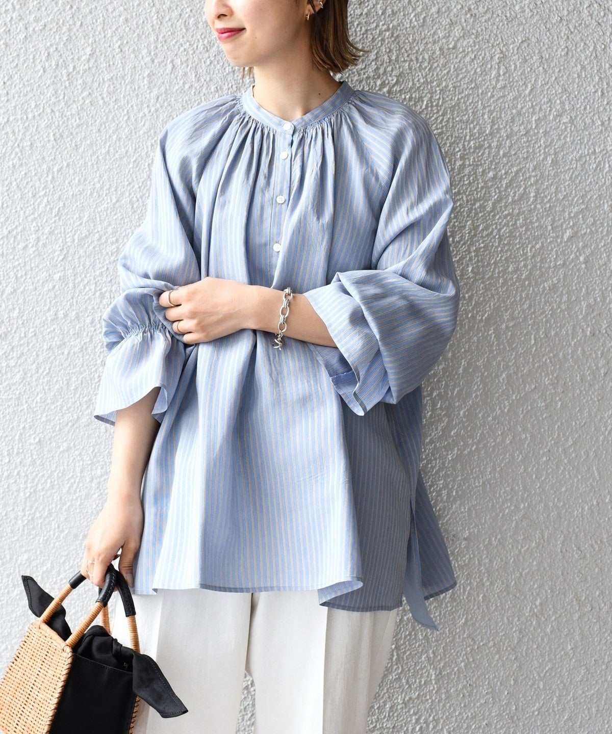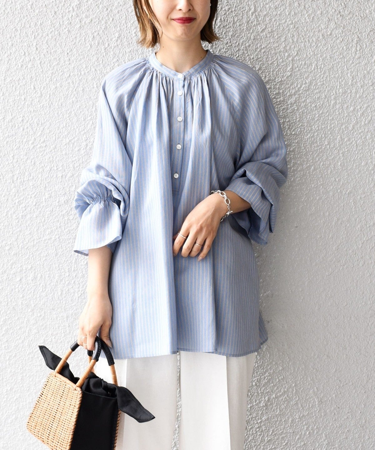 袖口はシャーリング仕様、袖部分にはたっぷりとギャザーをいれたデザイン。バンドカラーで甘くなりすぎず着用頂けます。
