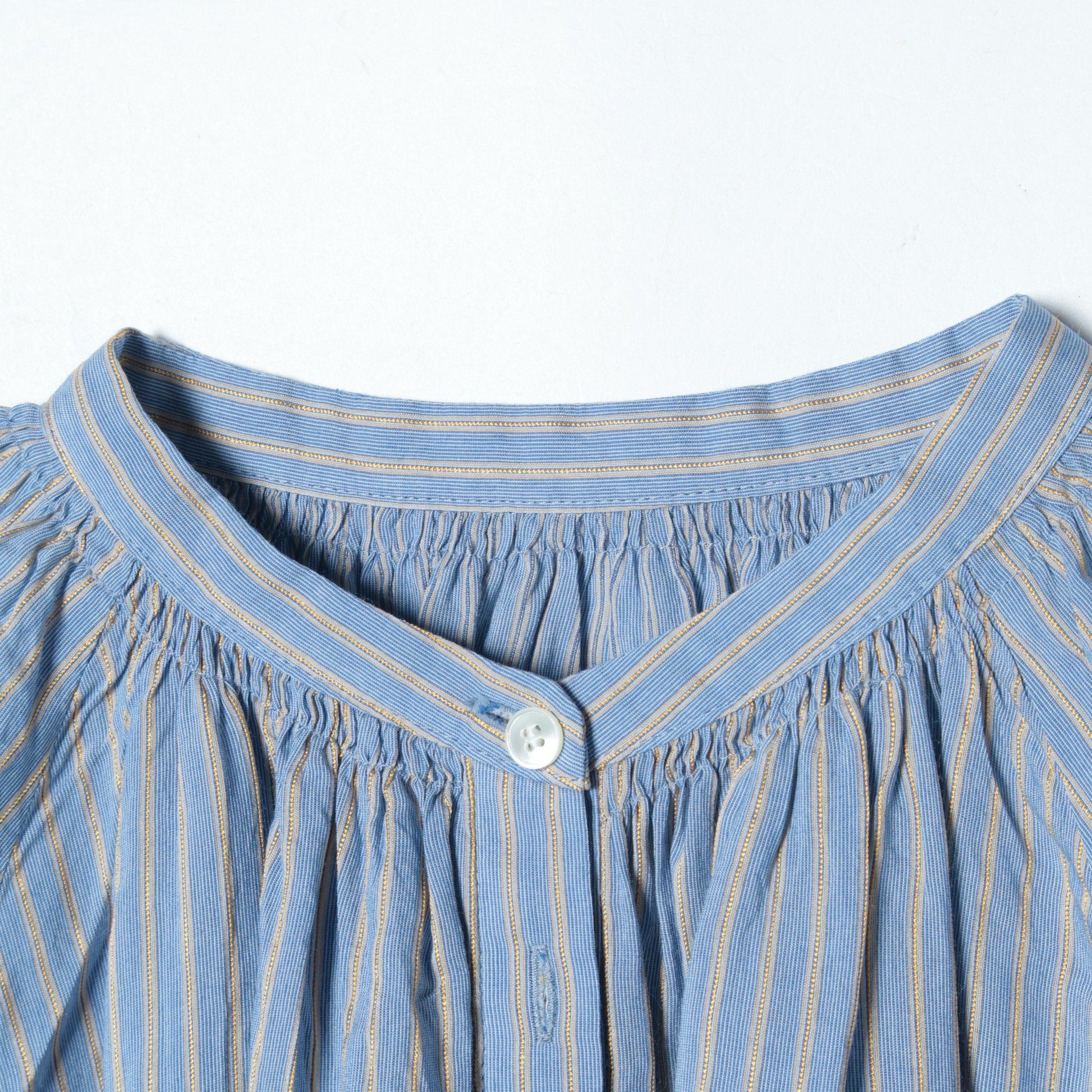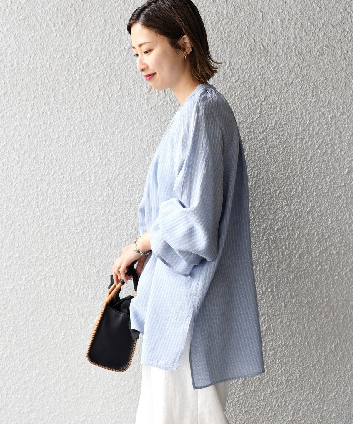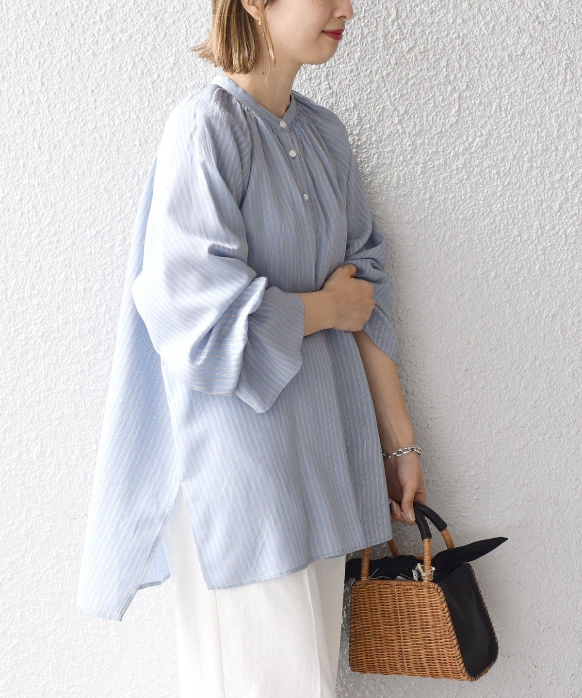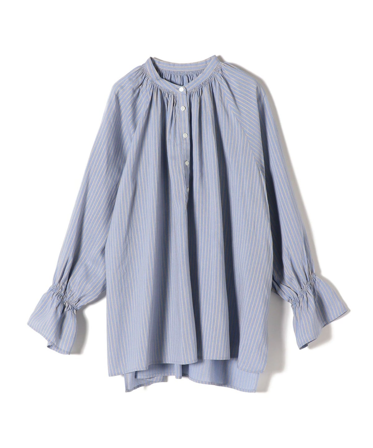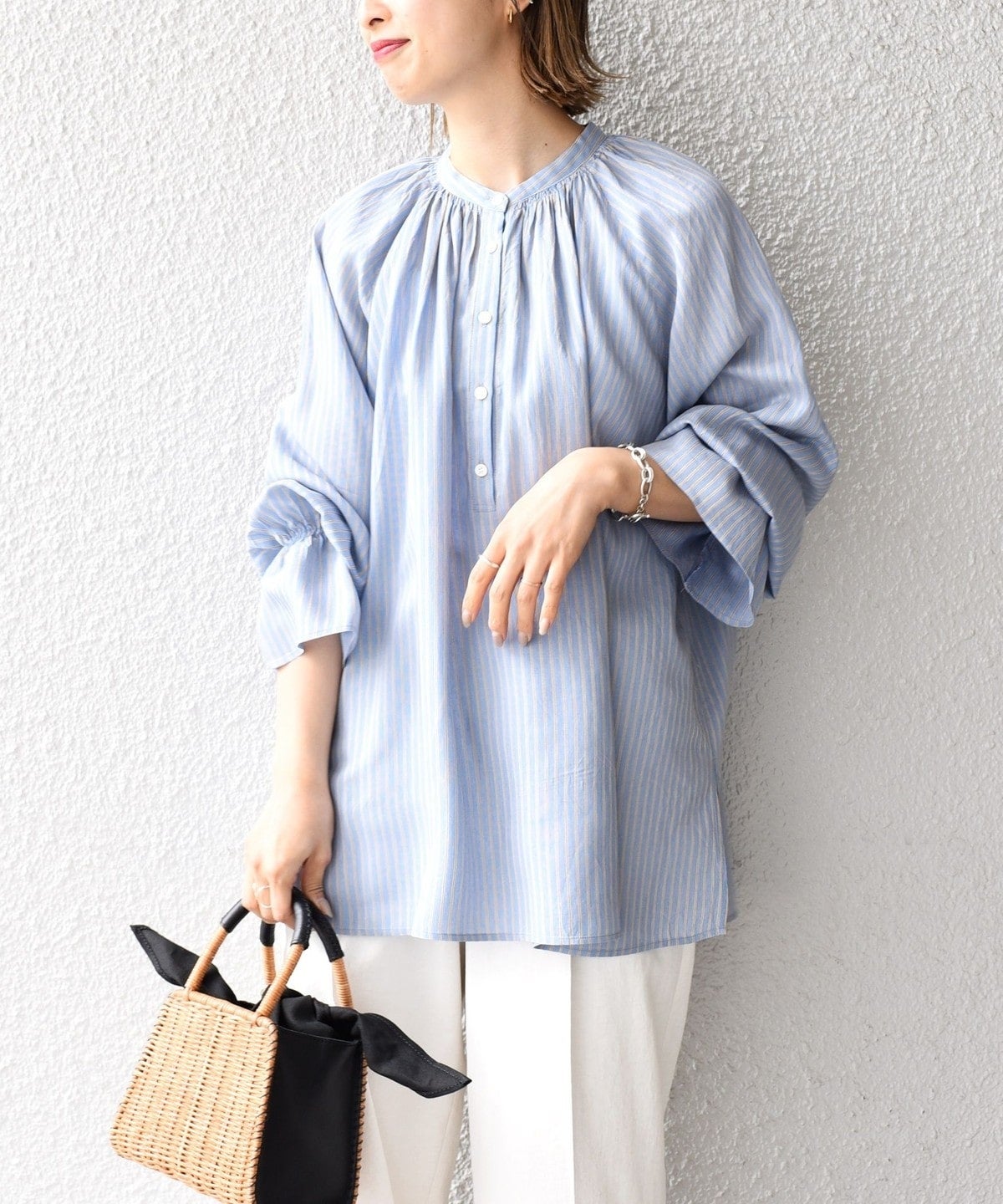 袖口はシャーリング仕様、袖部分にはたっぷりとギャザーをいれたデザイン。バンドカラーで甘くなりすぎず着用頂けます。