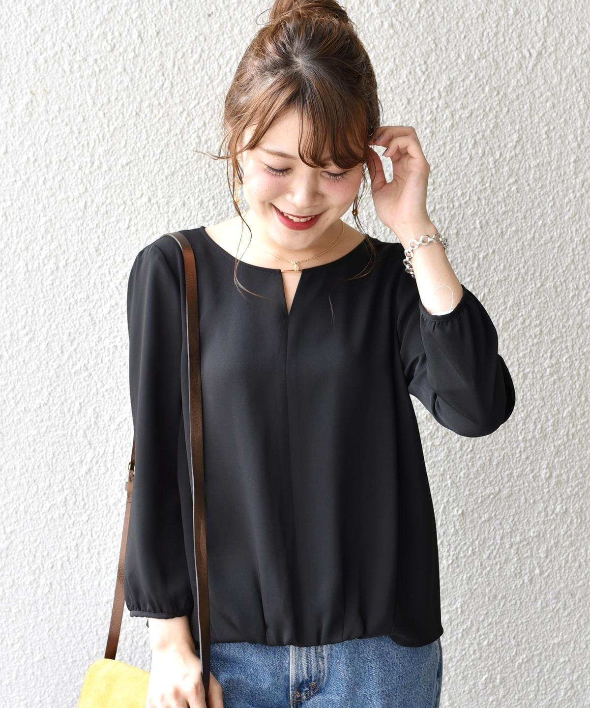 ネックレスを着けなくても華やかに見えるパーツ付きのブラウスです。ジャケットのインナーとしても◎