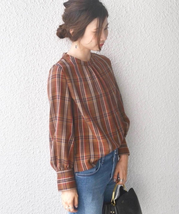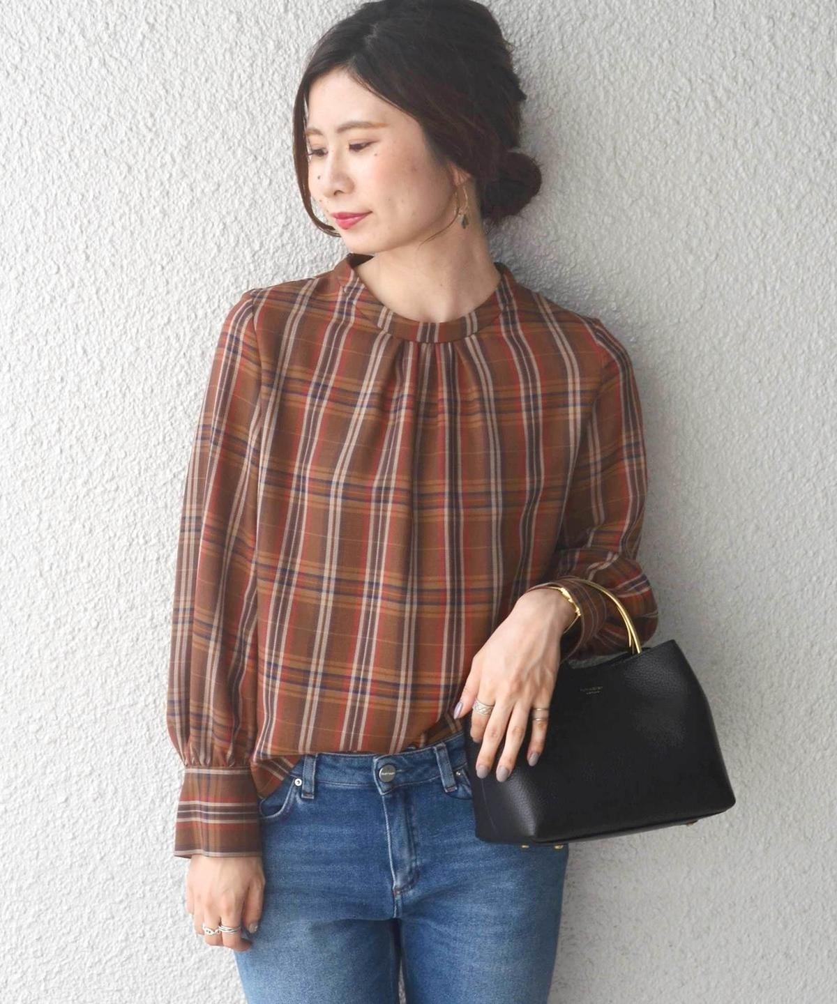 トレンドのハイネックブラウス。今年らしいチェック柄が目を惹くアイテム。手洗い可能な素材なので秋の始まりから冬まで長い期間取り入れていただけます◎