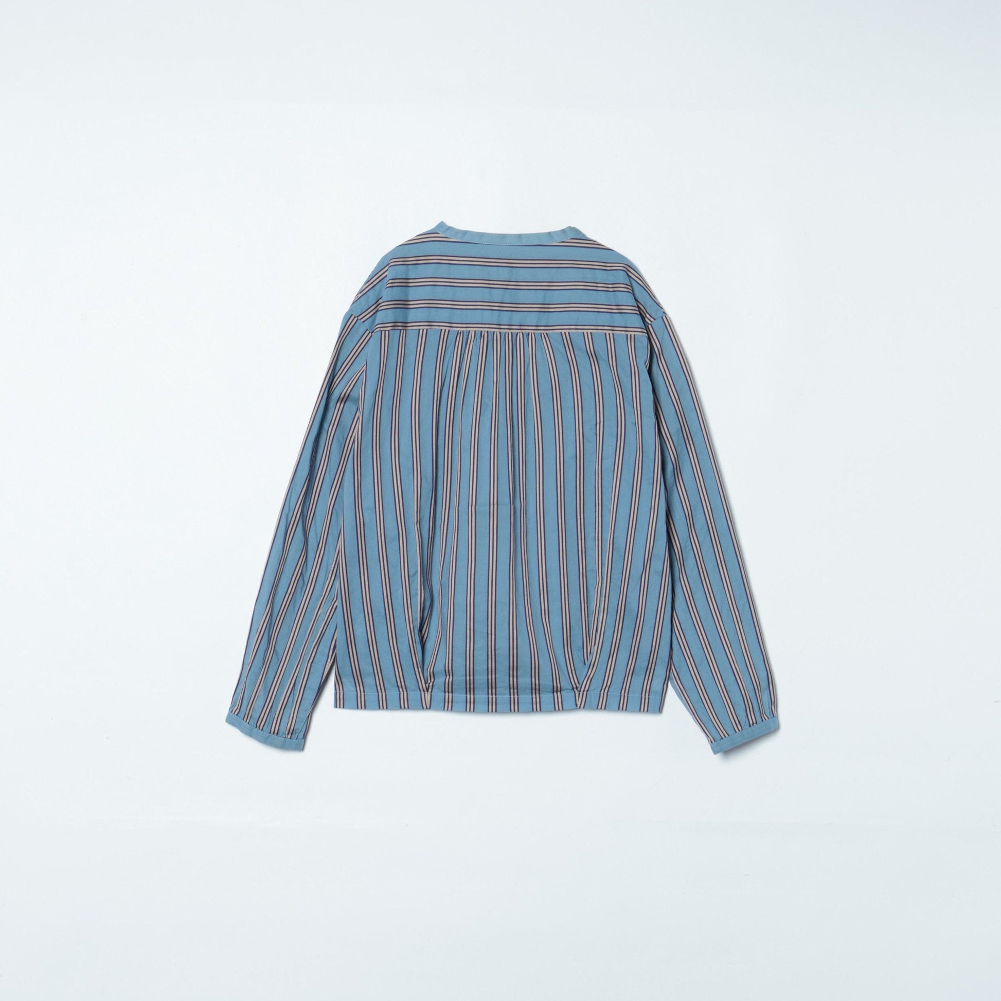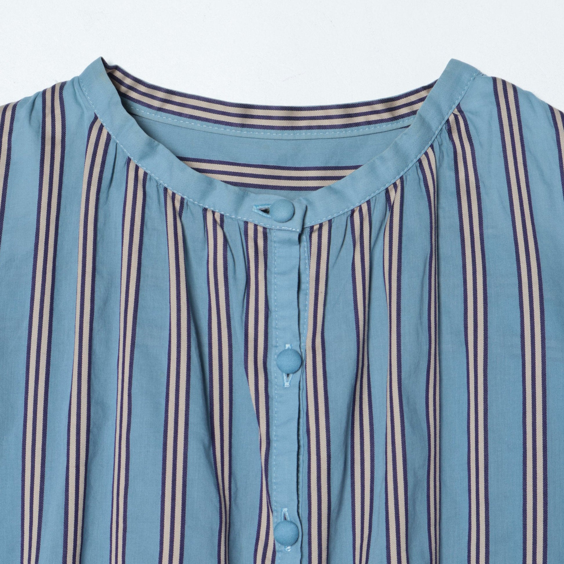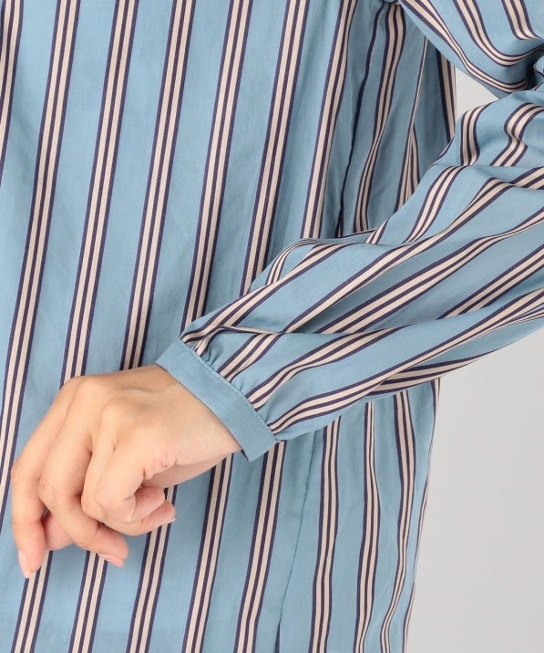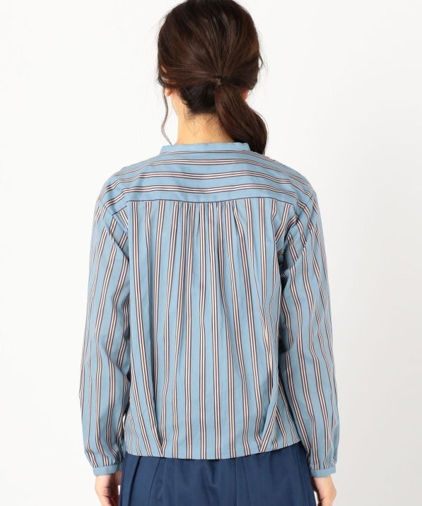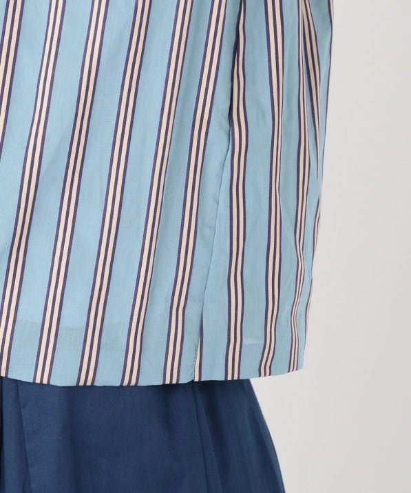 ストライプが印象的なタックブラウス。一枚で決まるデザイントップスはこれからの季節に欠かせないアイテム。合わせ方次第で、ON・OFF兼用で着まわせます。