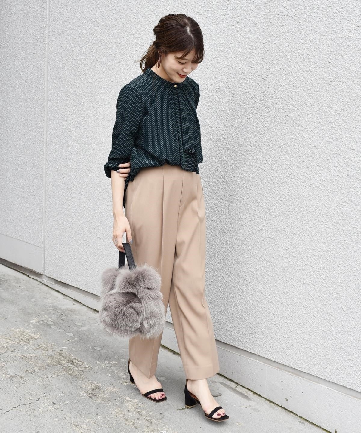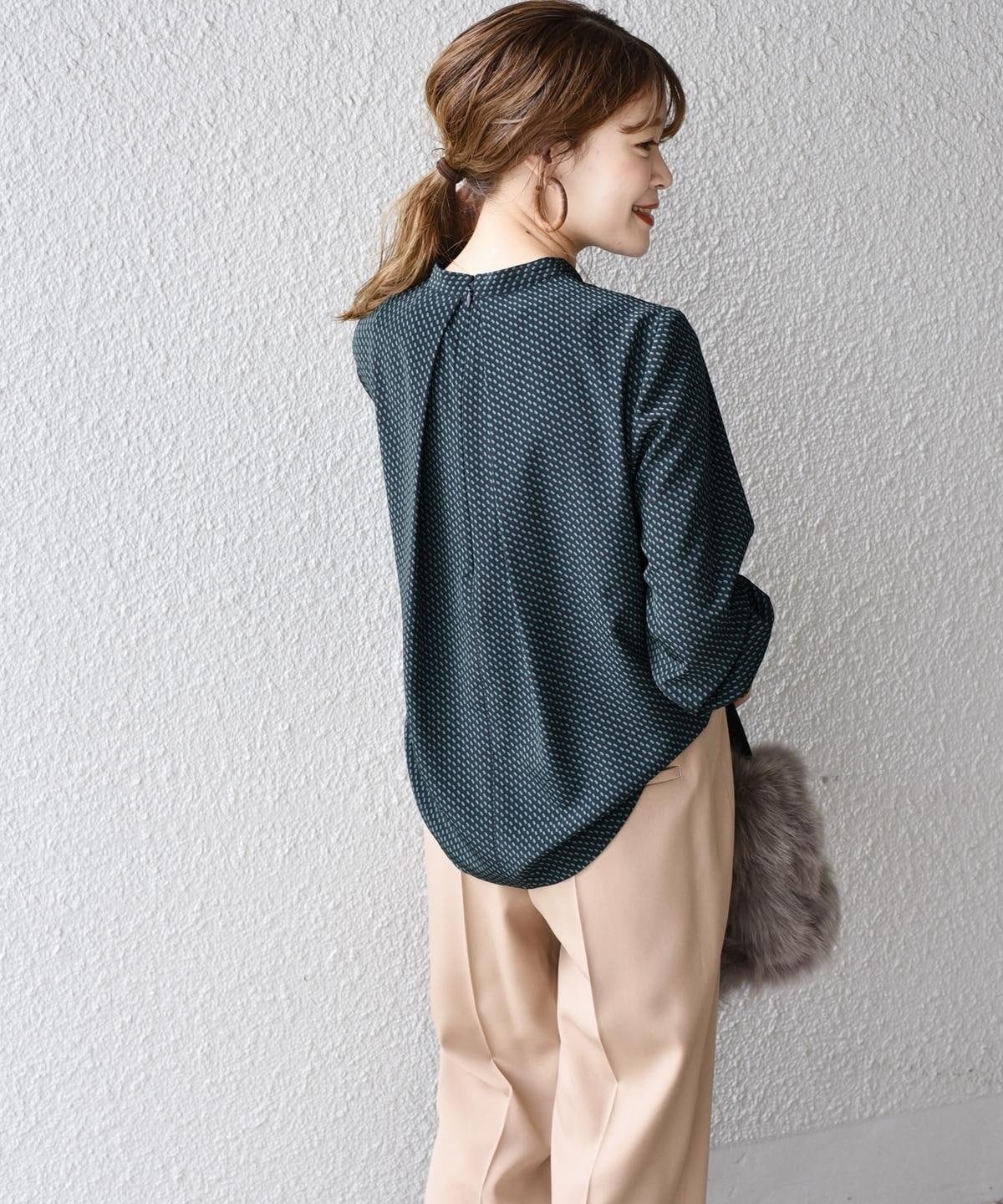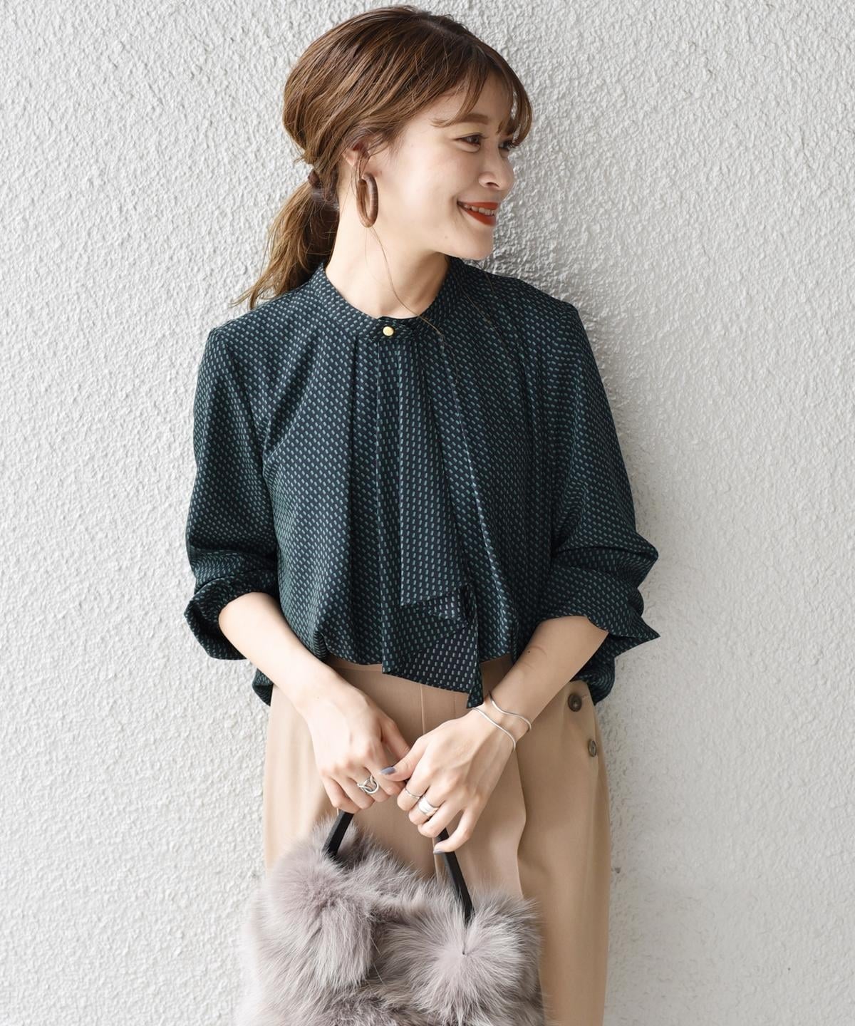 落ち着いた色合いと胸元のスカーフタイが大人っぽい印象のブラウス。