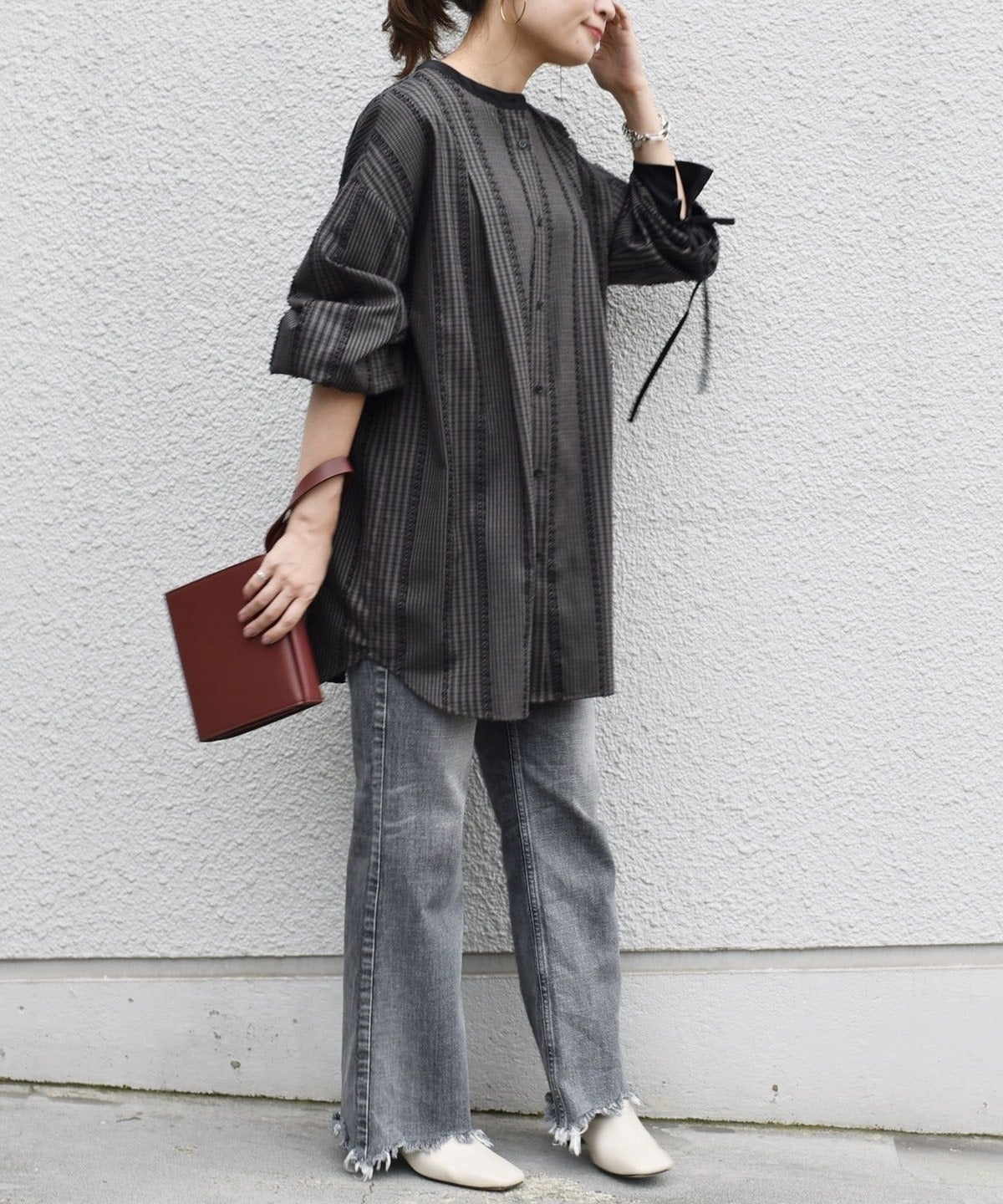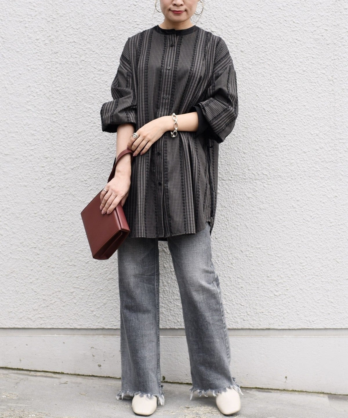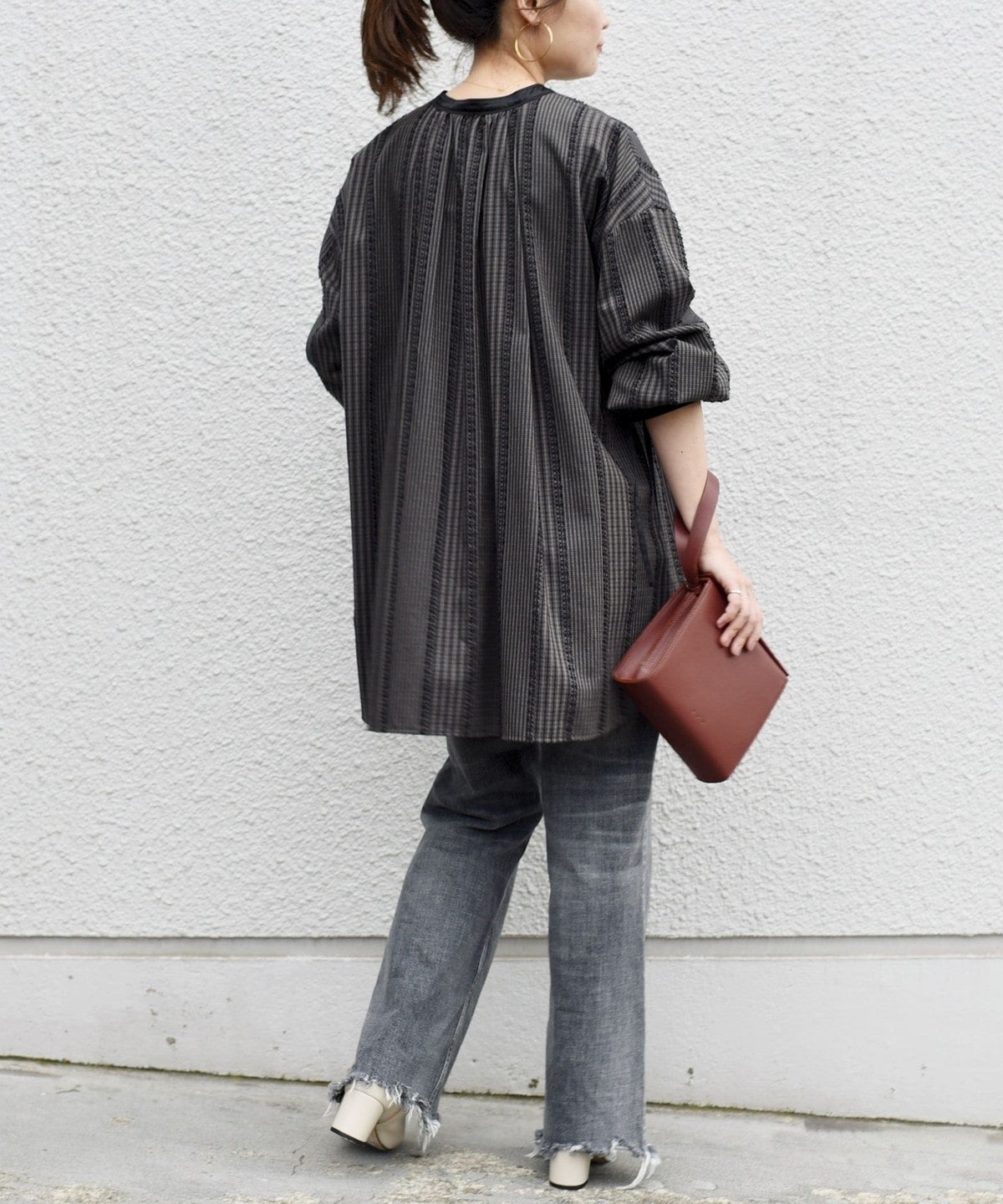 カットフリンジ生地が目を引く、衿とカフスがバイカラーのチュニックブラウスです。オーバーサイズに作ったので羽織としても着こなしやすくなっています。前後2WAYで着用できます。