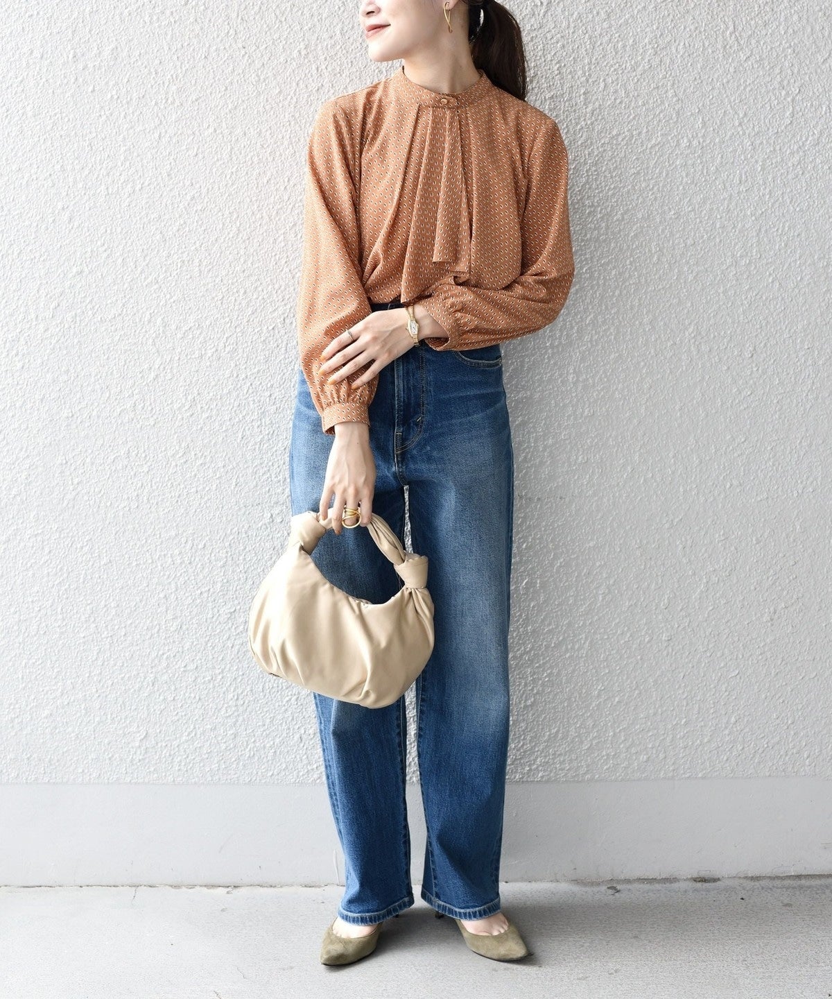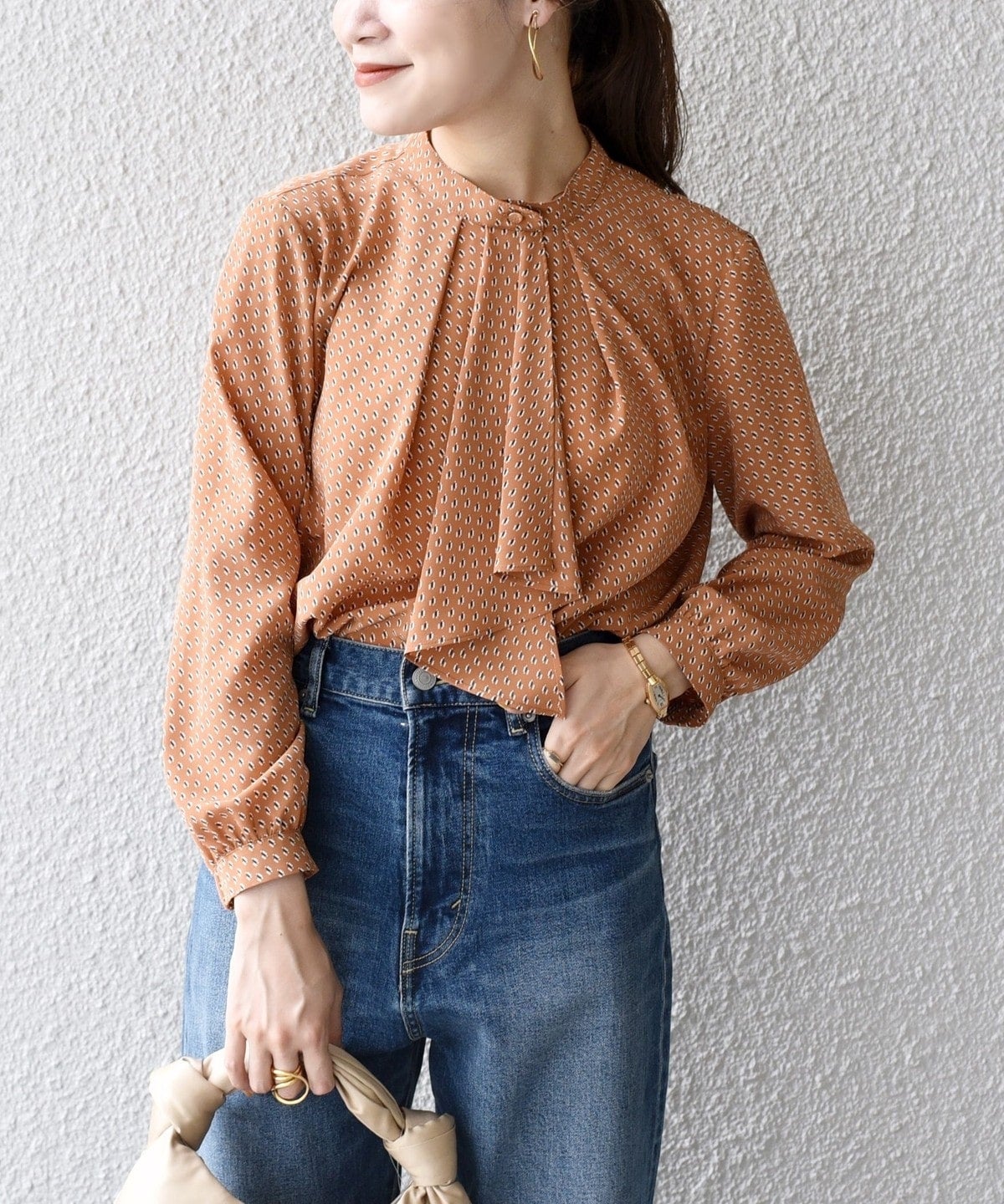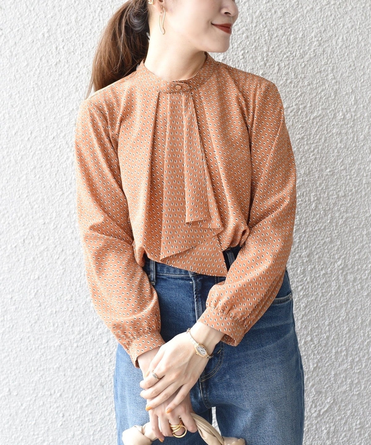 ビジネスシーンにも対応できるブラウスとして定番となっているスカーフタイブラウス。