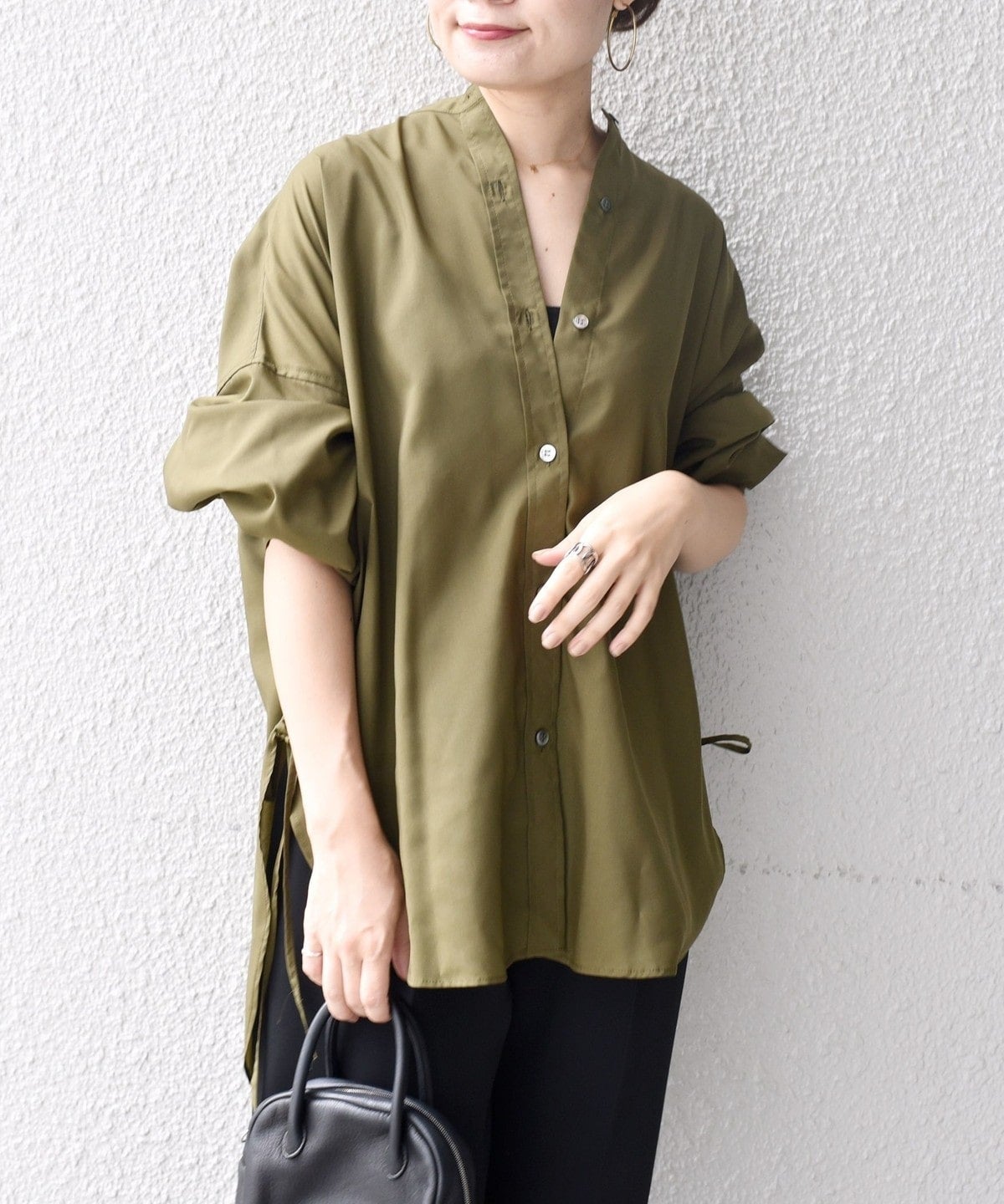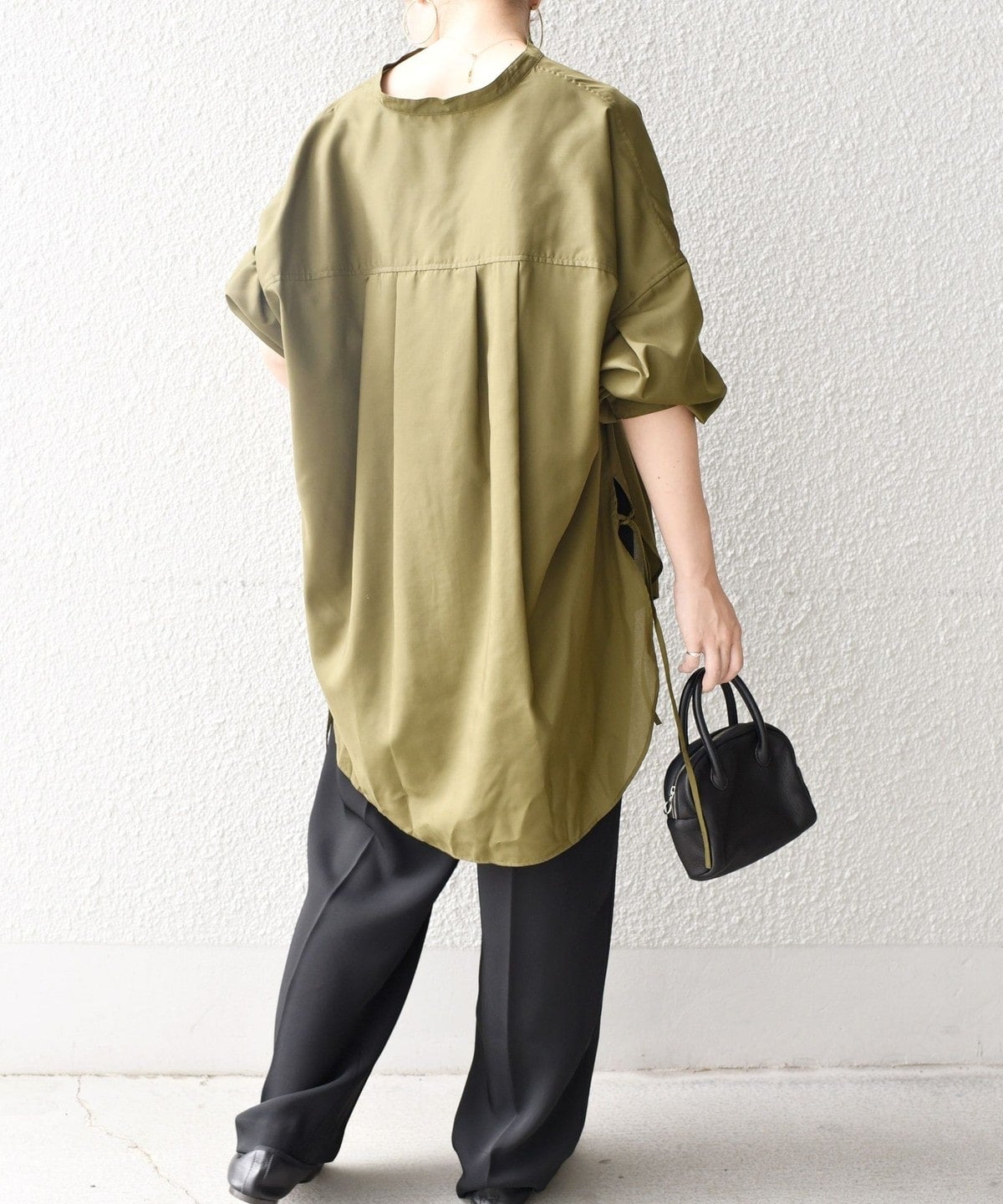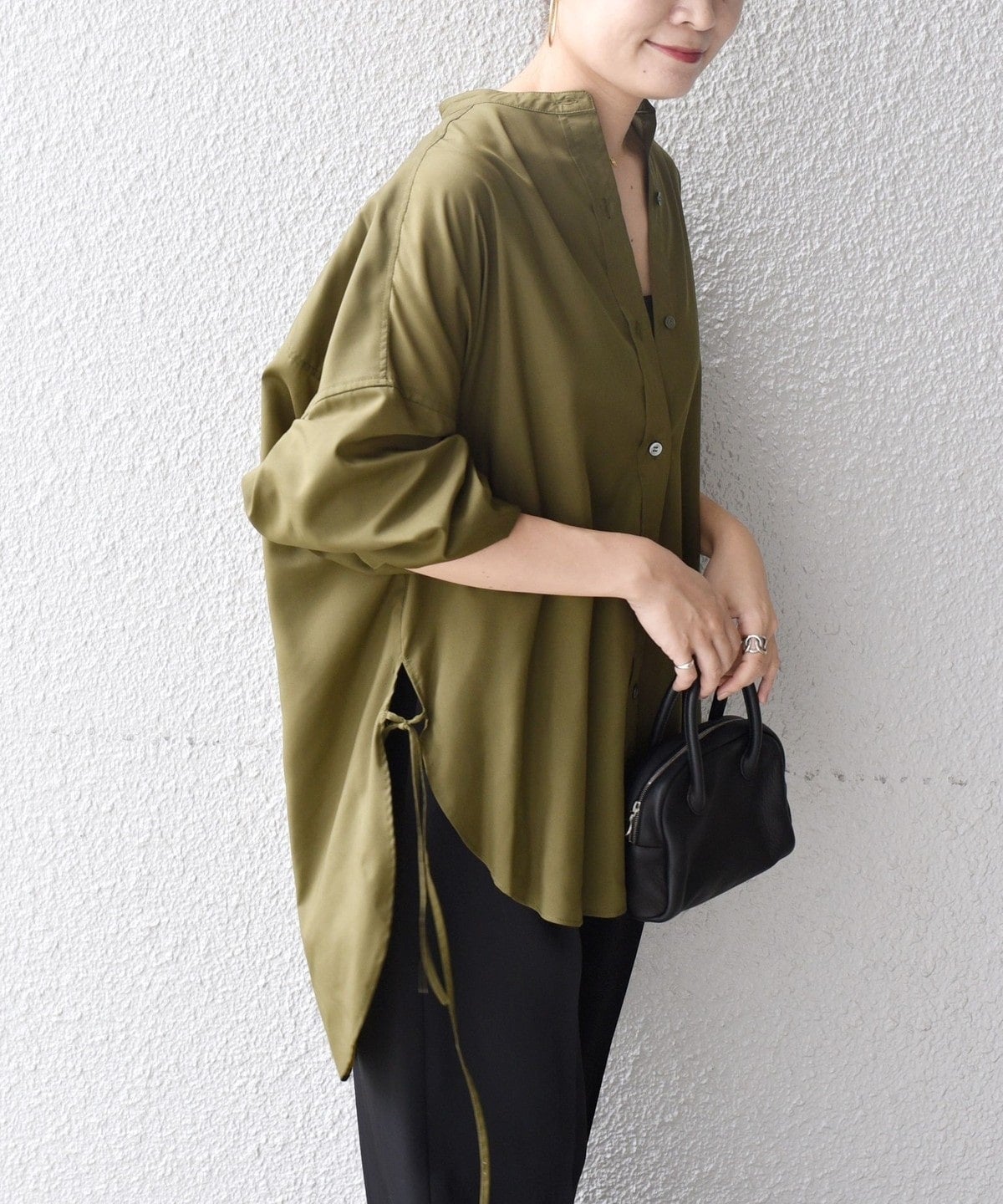 深めのサイドスリットやリボン仕様がポイントにもなっていて重ね着や羽織りにもおすすめです。