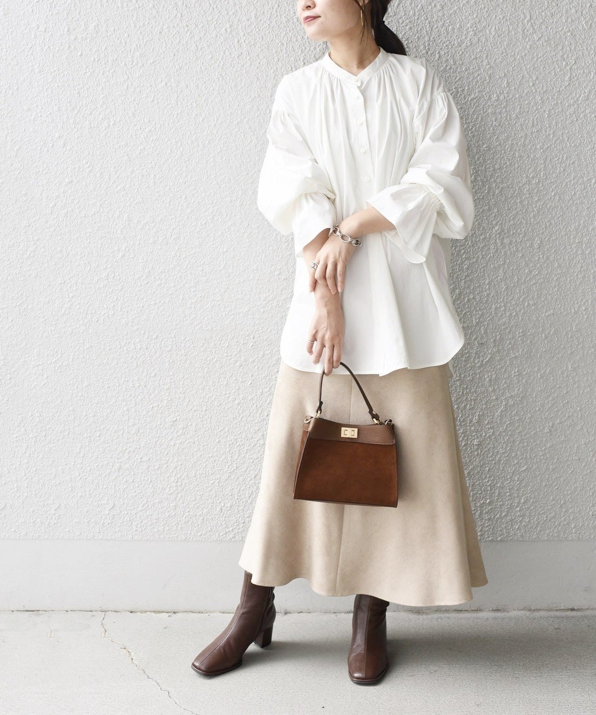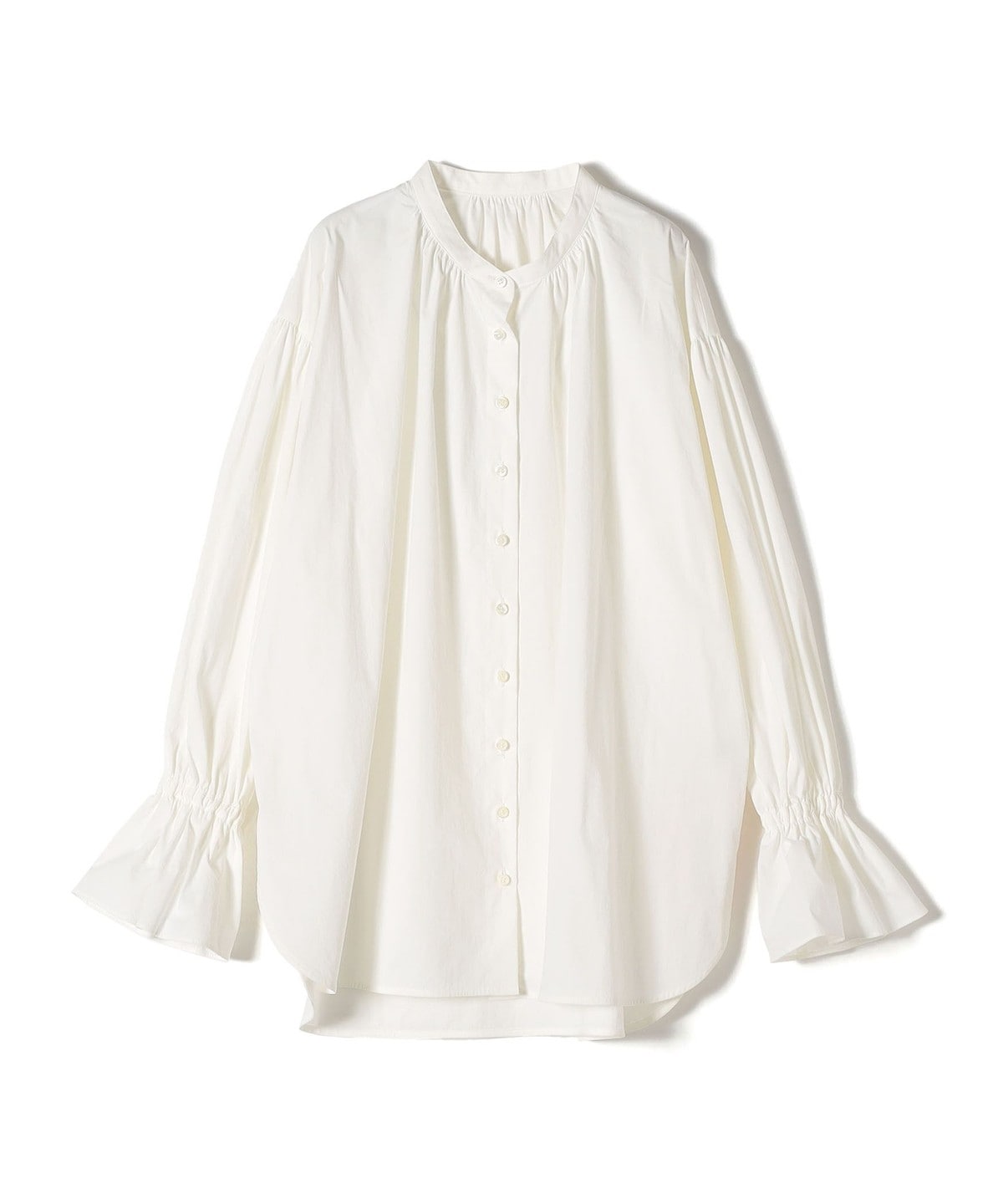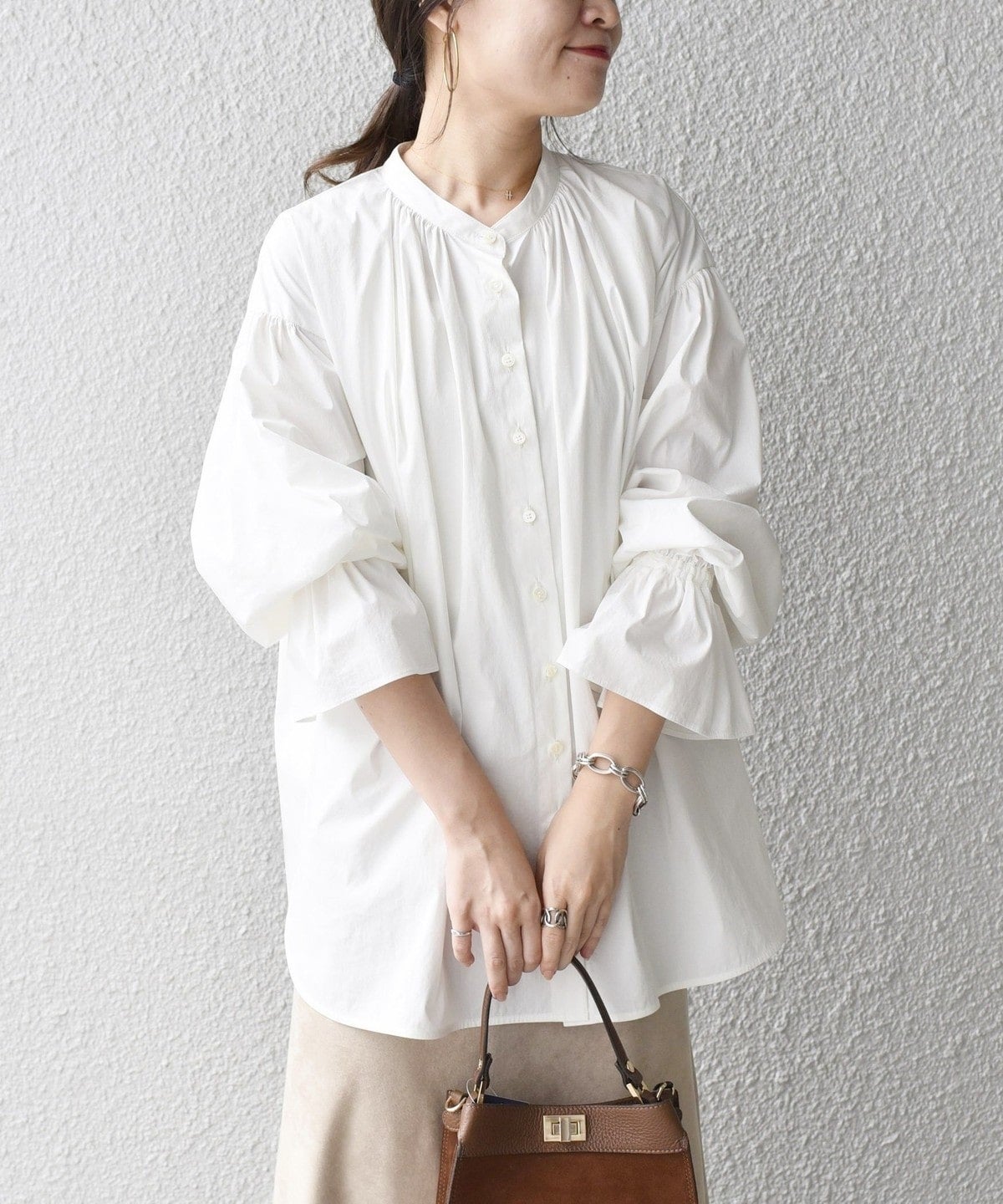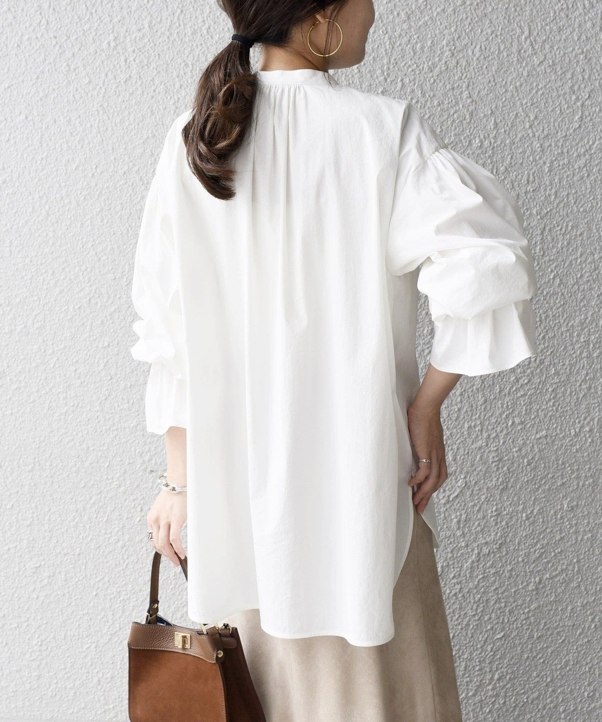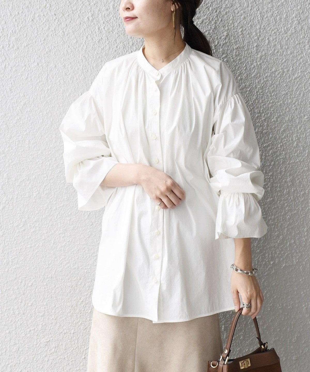 首元に入った細かいギャザーと、きゅっと絞ったキャンディースリーブがかわいいブラウス。
