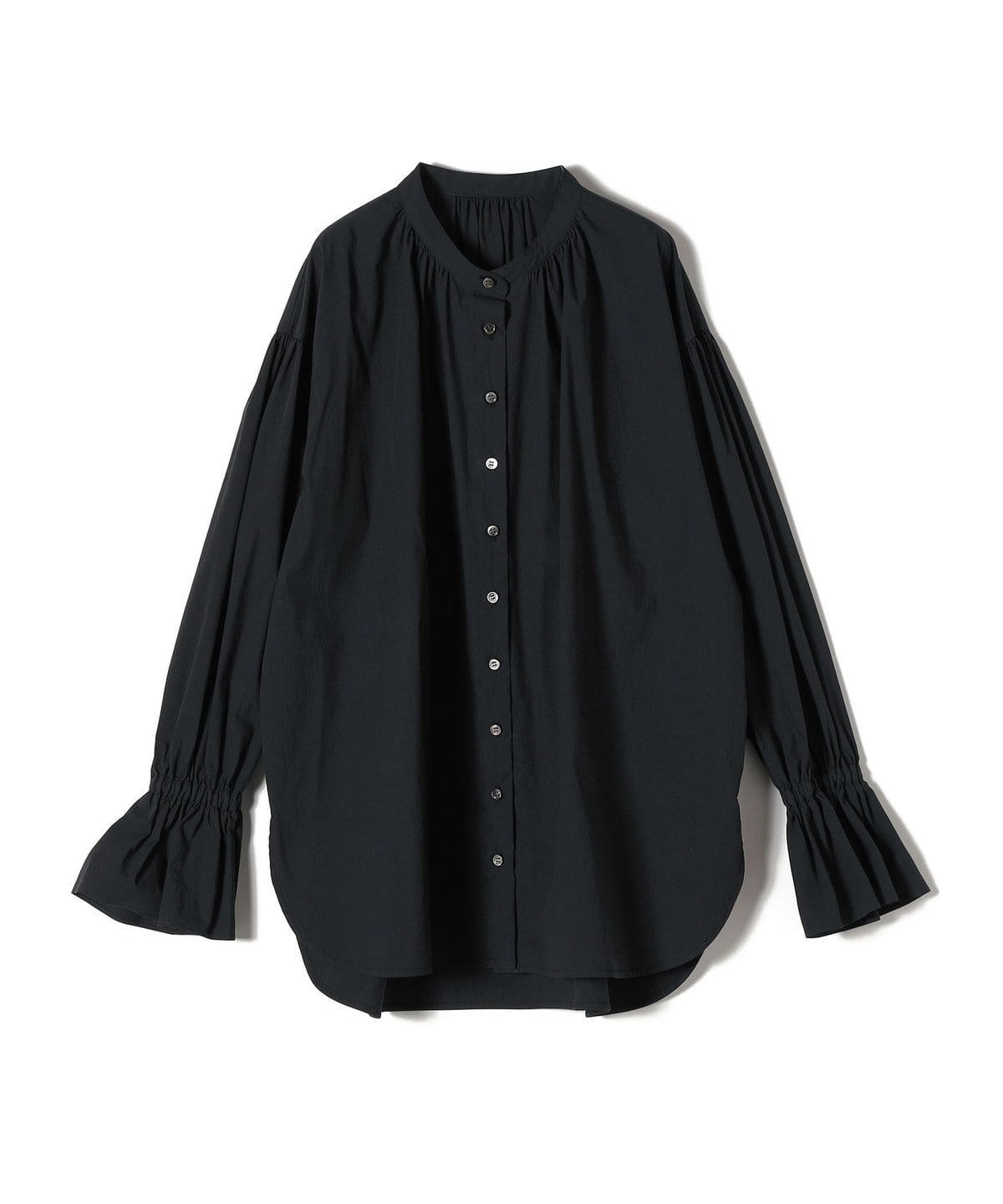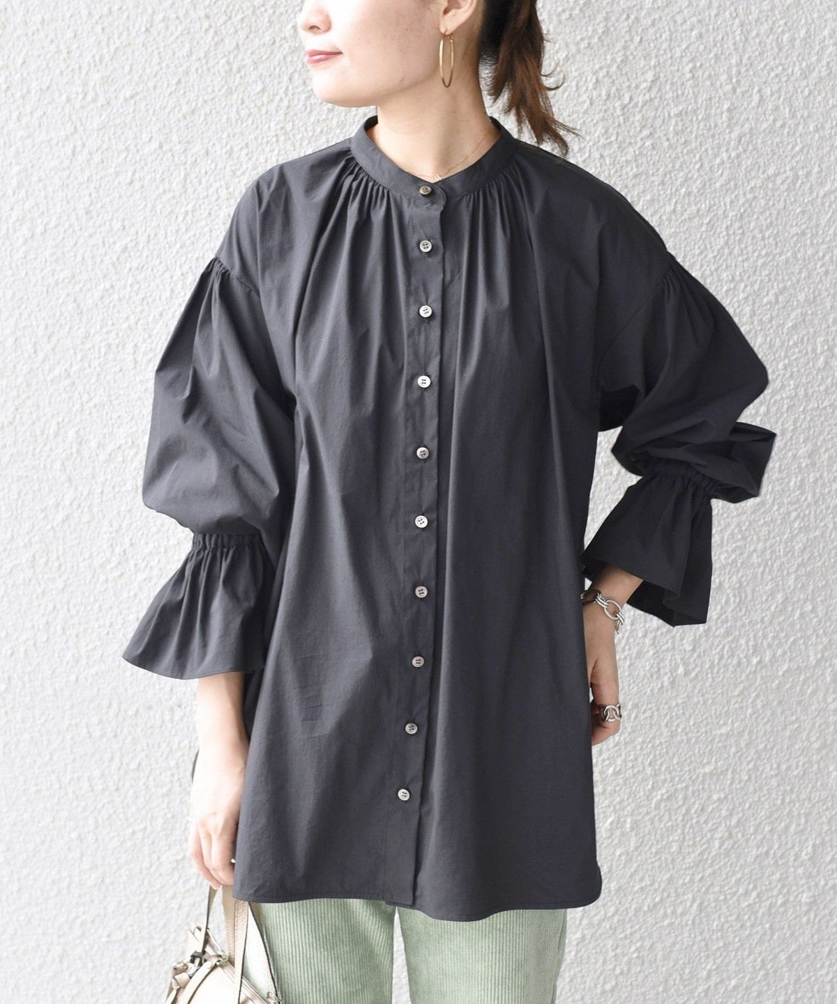 首元に入った細かいギャザーと、きゅっと絞ったキャンディースリーブがかわいいブラウス。