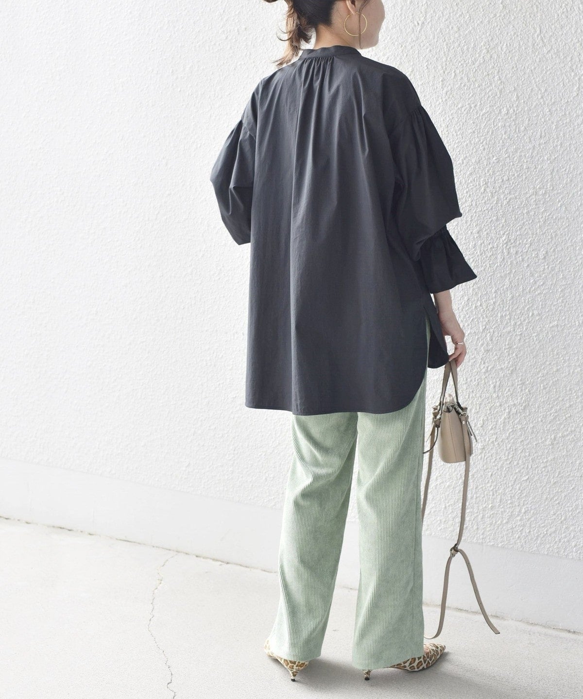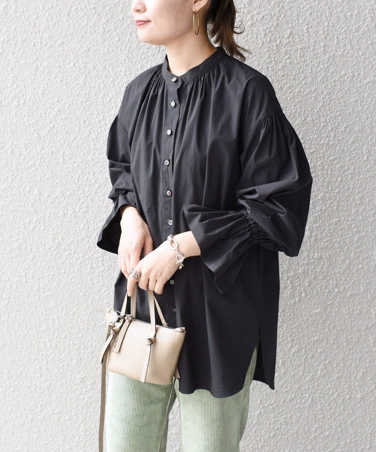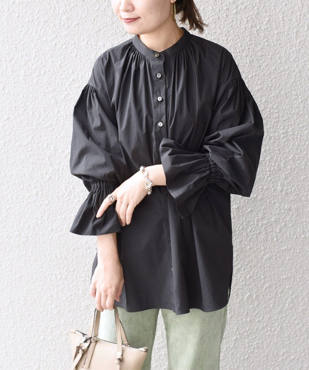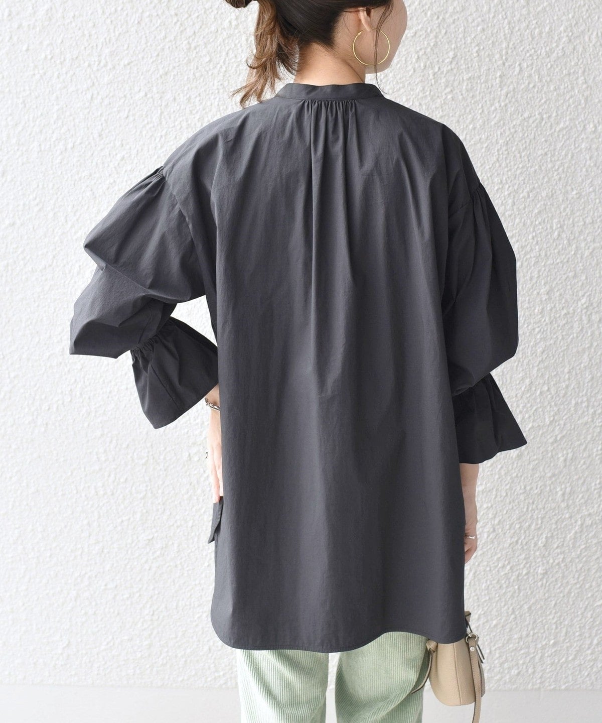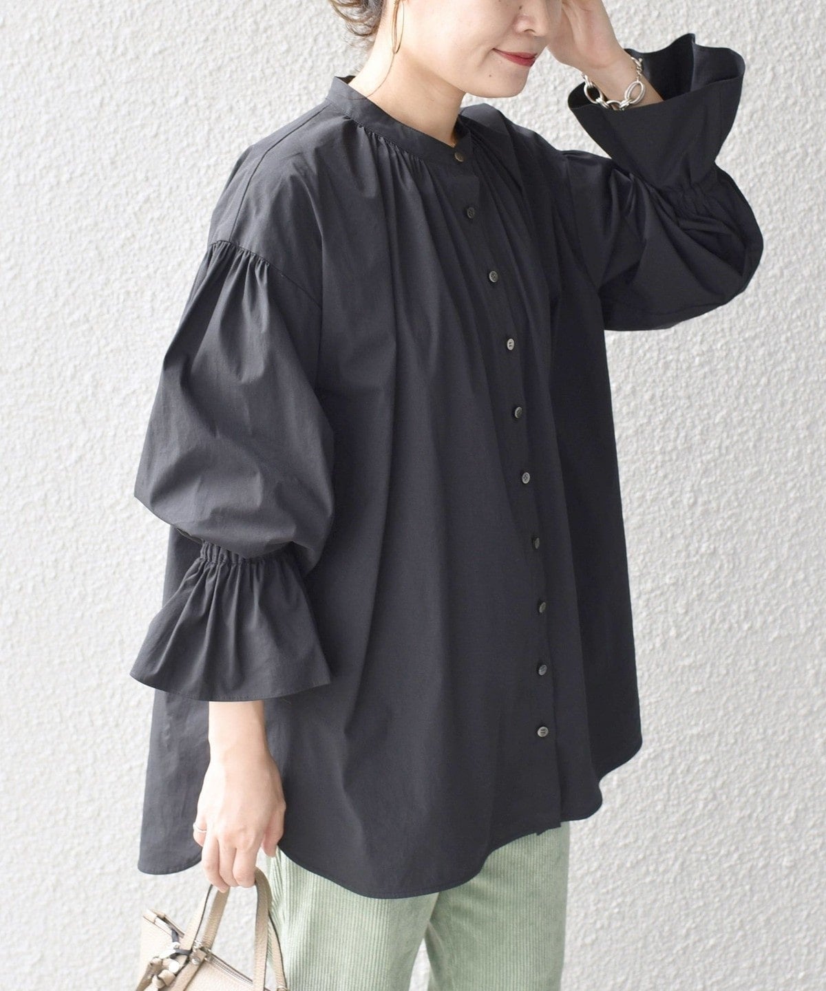 〈手洗い可能〉ソリッドギャザースリーブブラウス