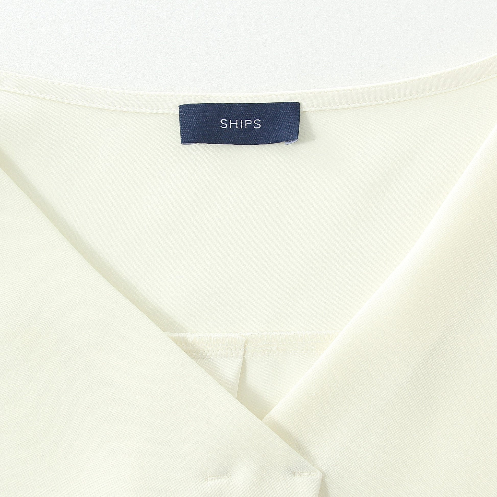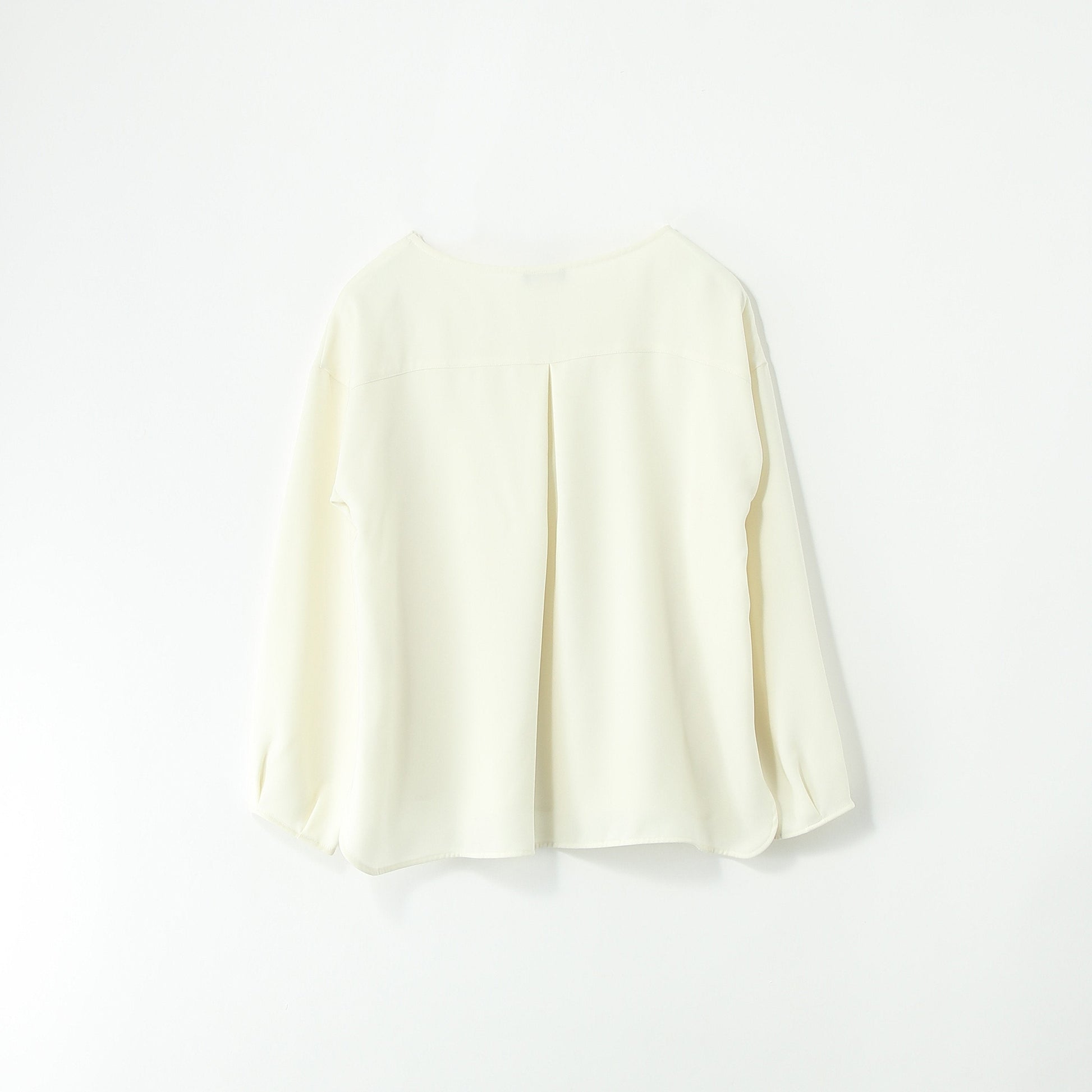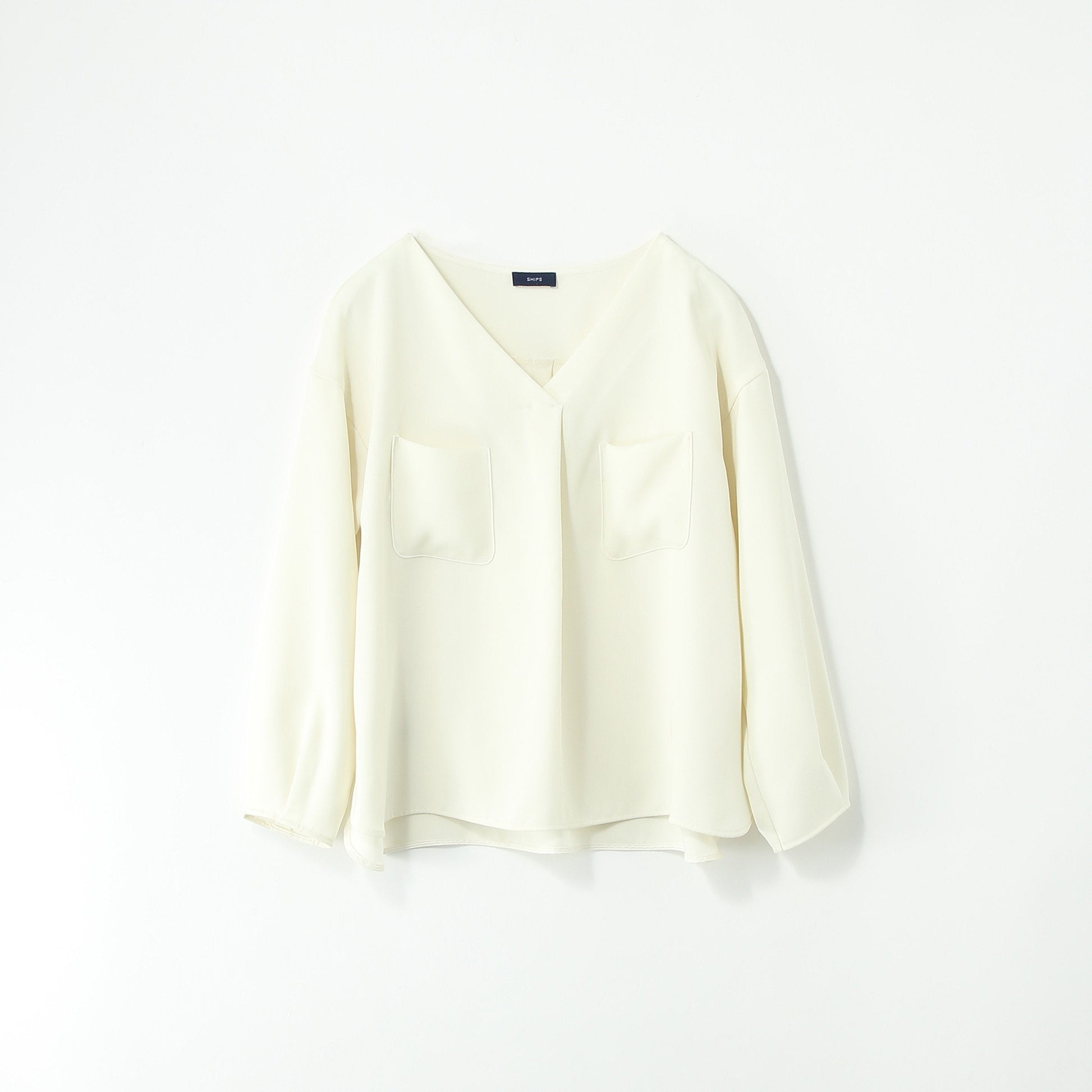 ダブルポケットがポイントのブラウスが登場。スッキリと見えるVネックで程よいボリューム袖がポイント。シンプルなので、ボトムスを選ばない万能アイテムです♪