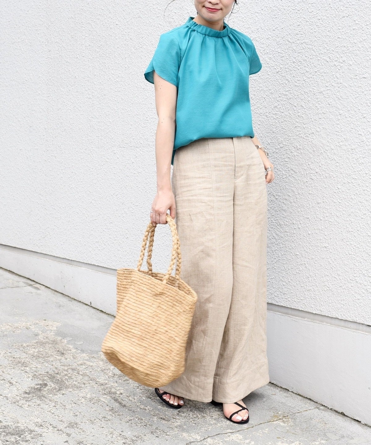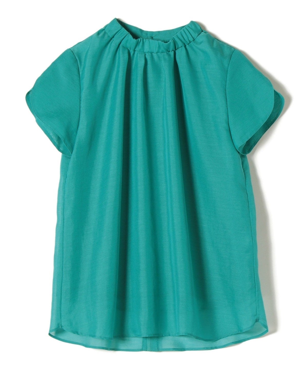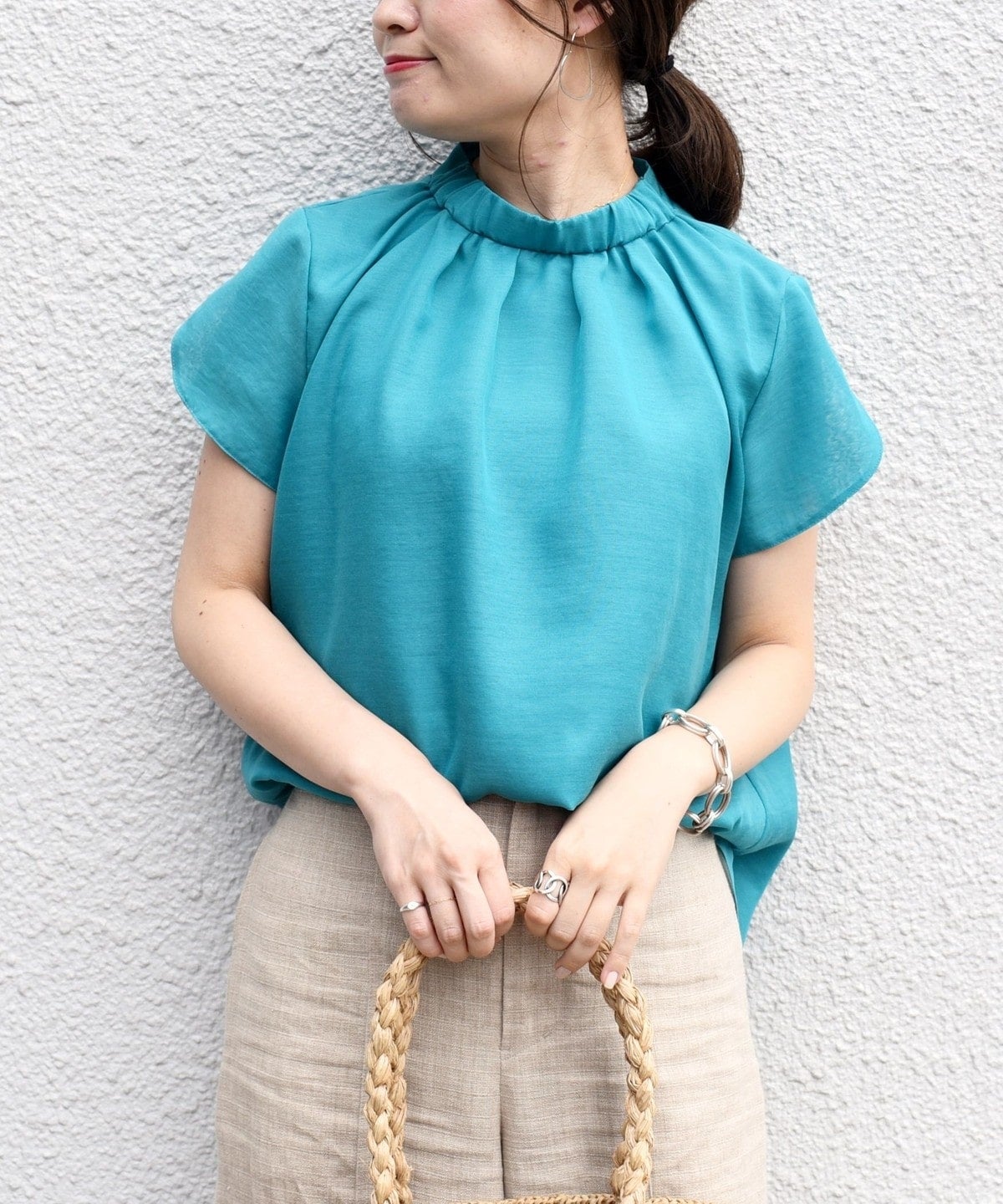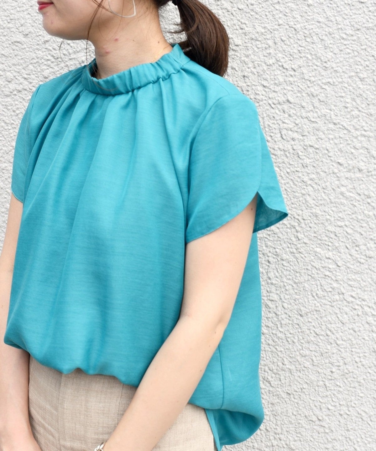 スタンドカラーできちんと感をプラスしつつ、ハイネックの襟ぐりにはゴムギャザーが入っていて、着こなしが華やぎます。ジャケットのインにもおすすめです。