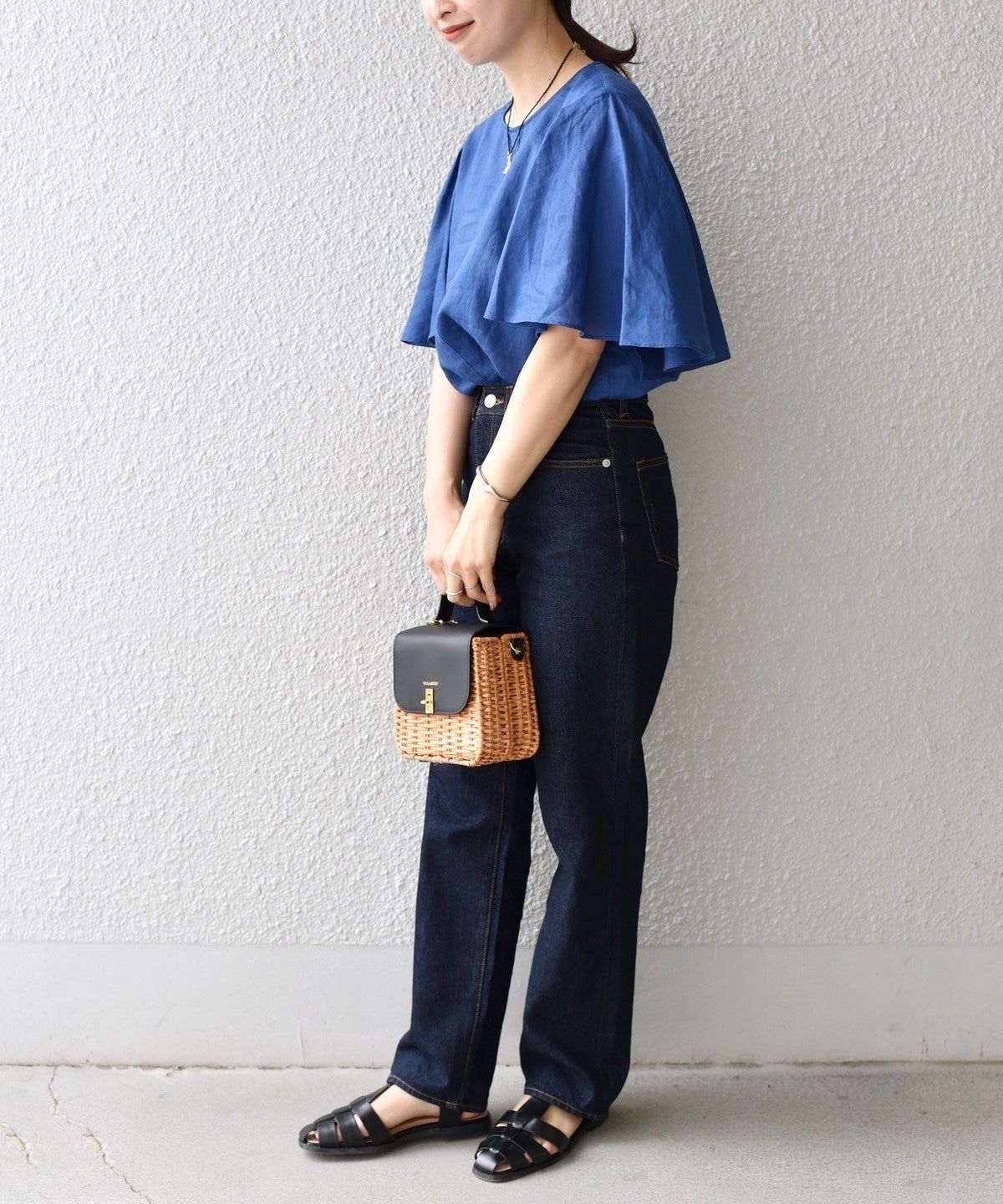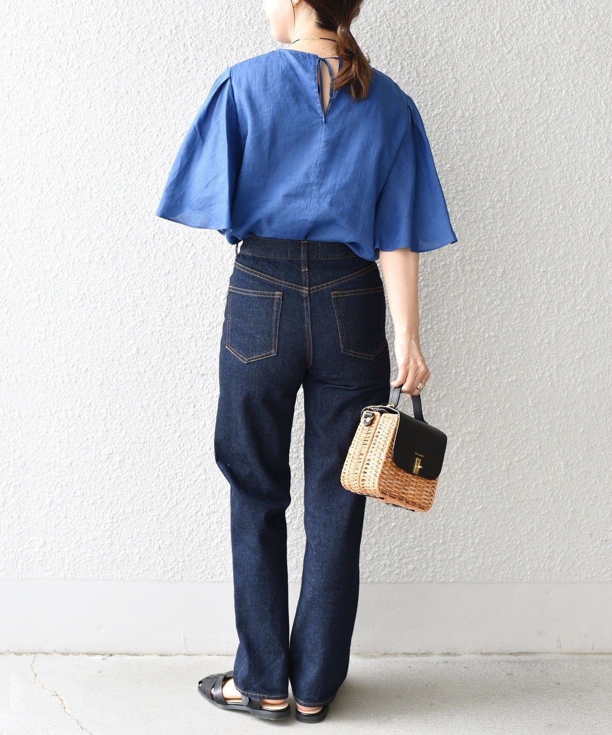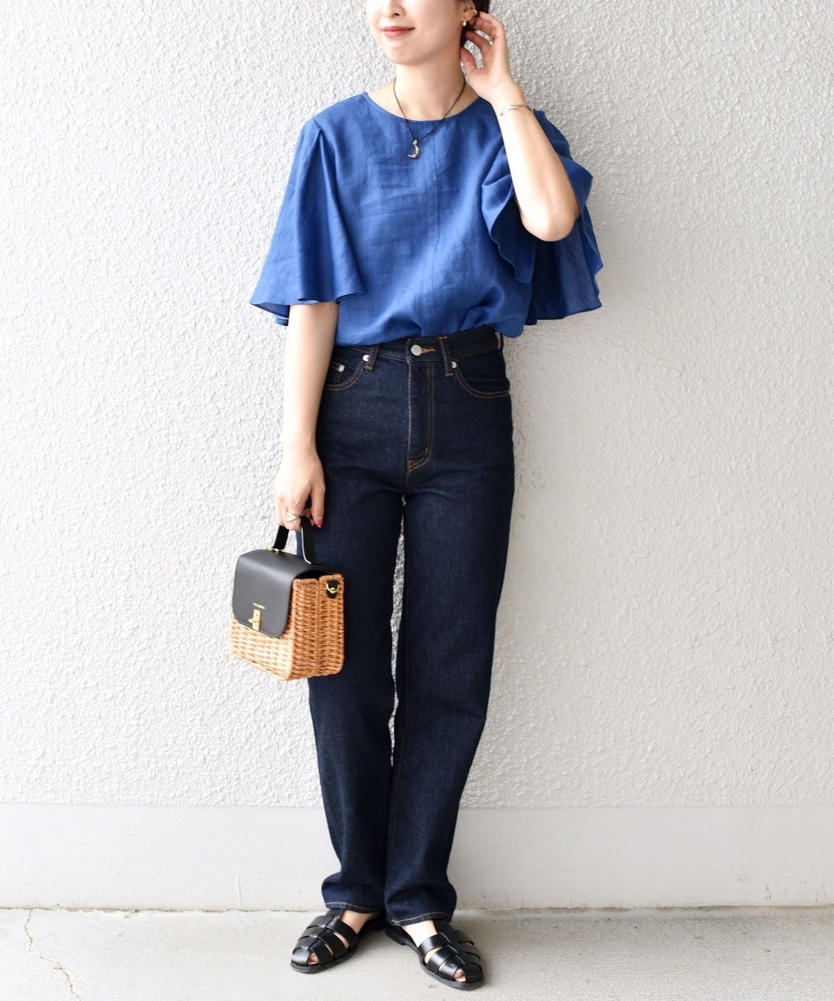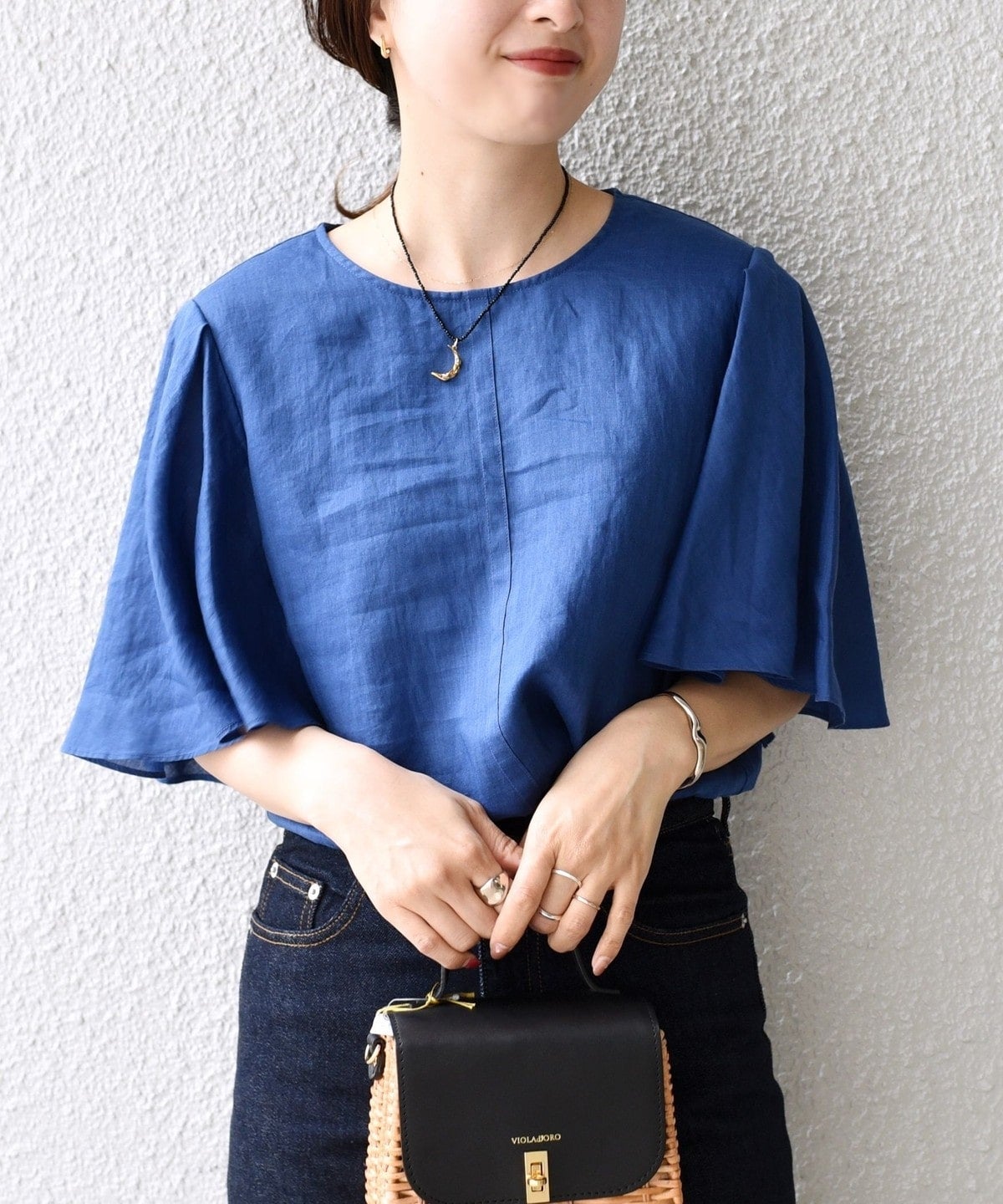 上品な印象なので、あえてデニムやワイドパンツと合わせてカジュアルダウンして着用するのがおすすめ。