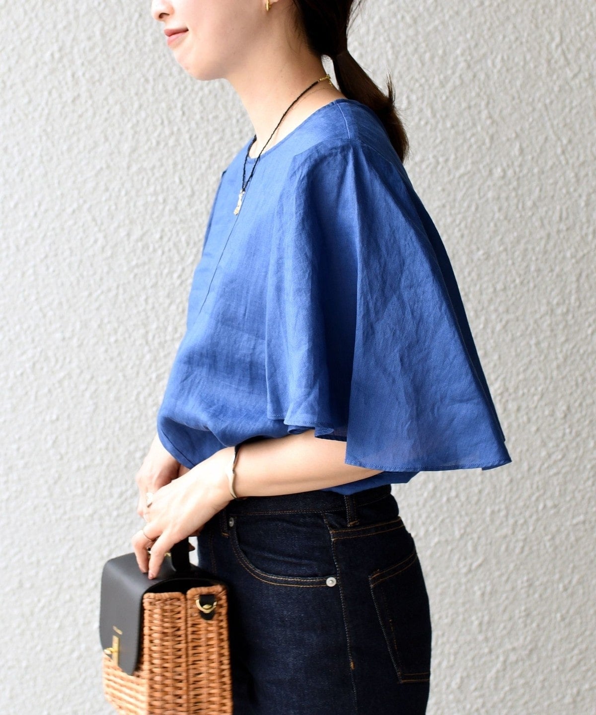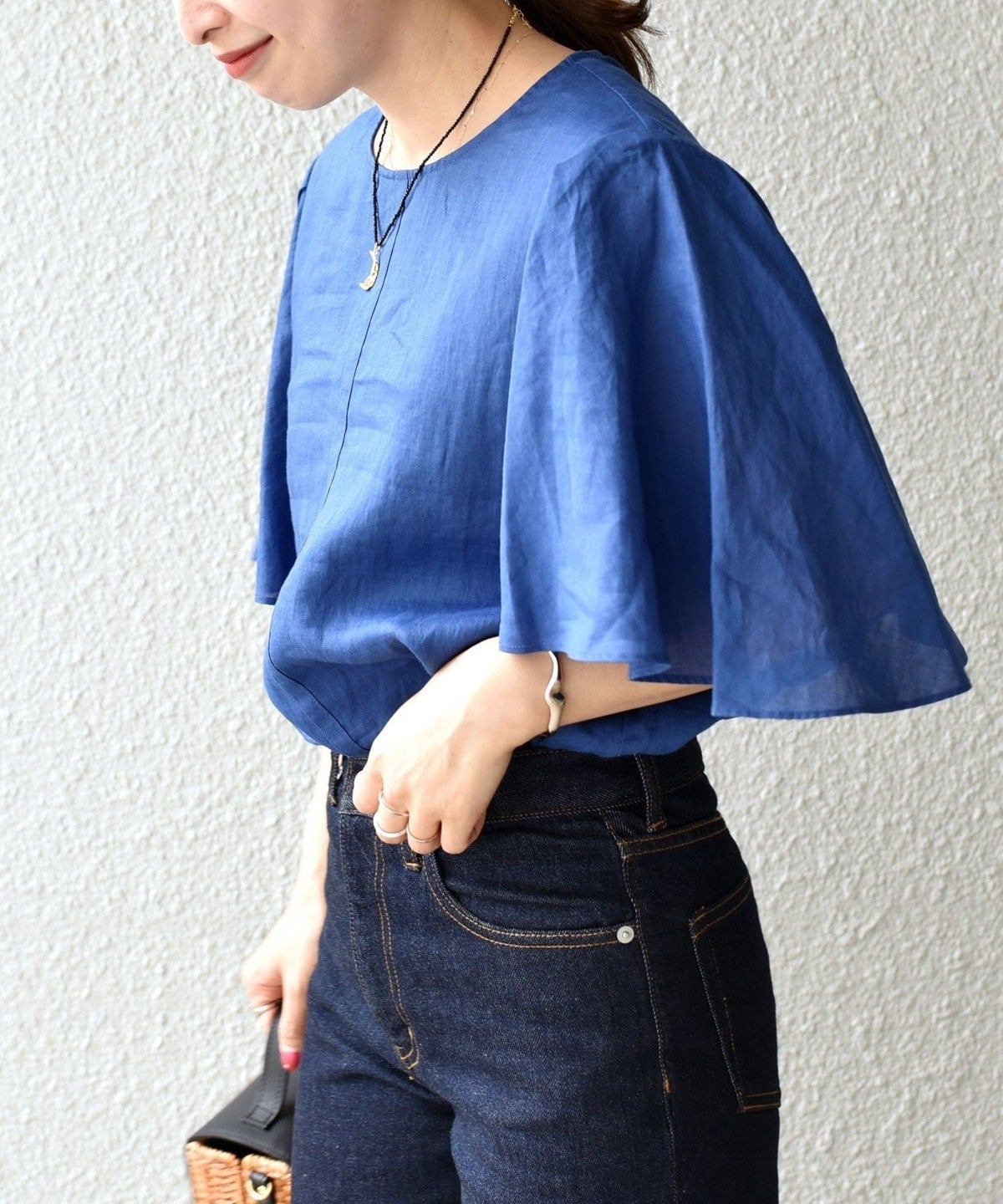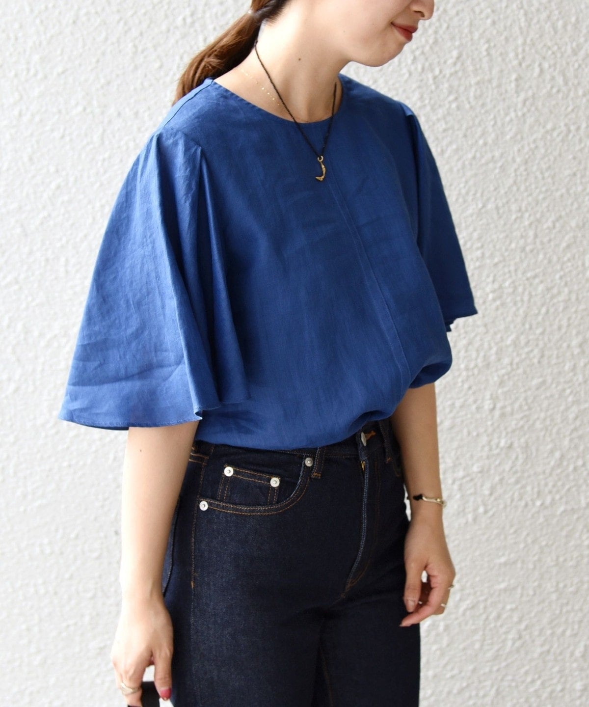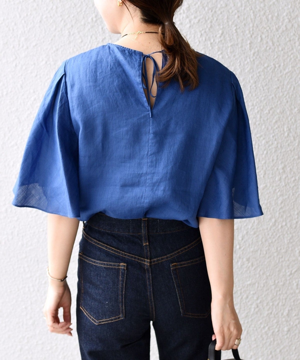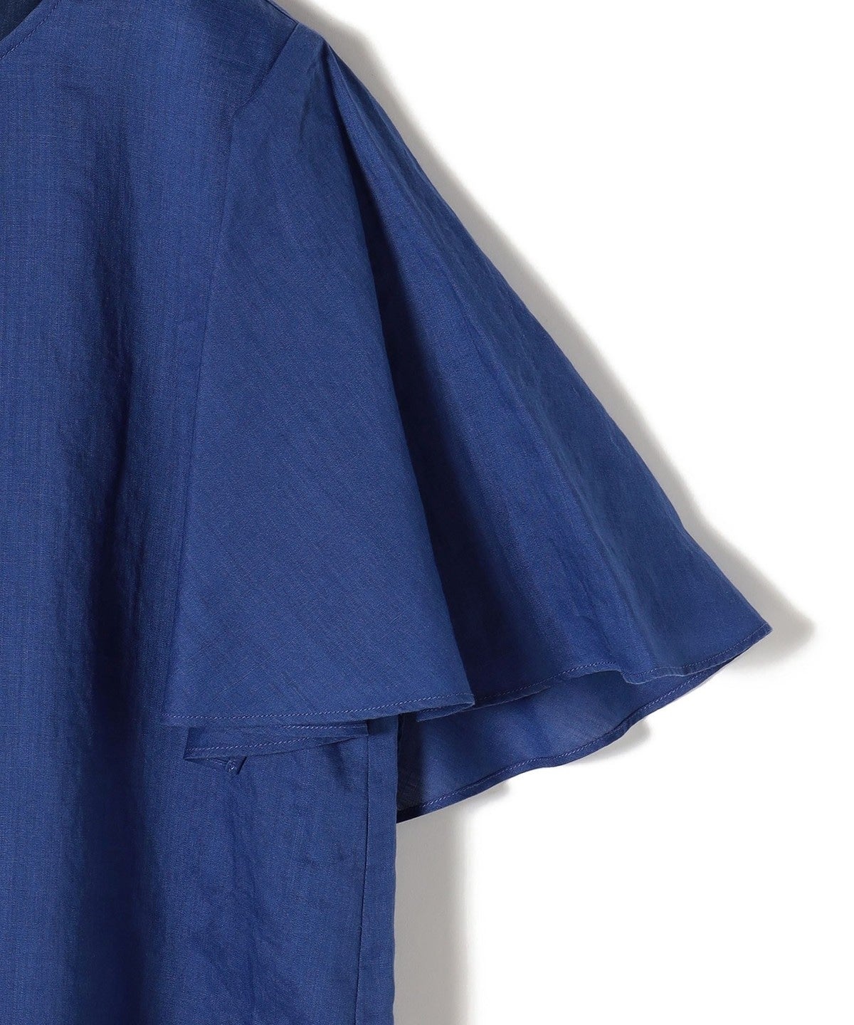 袖丈に前後差を付けることで、袖下が繋がらないハンカチーフヘムのようなデザインになっており、動く度に揺れる女性らしい一着。