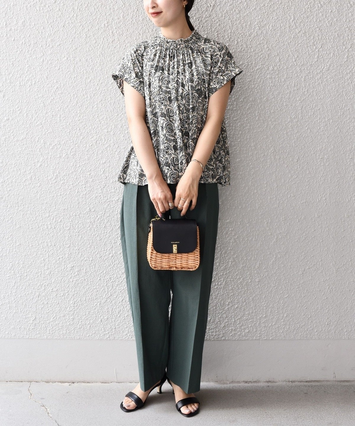 ブラウスの華やかさを活かしてボトムはシンプルなアイテムにするのがおすすめ。