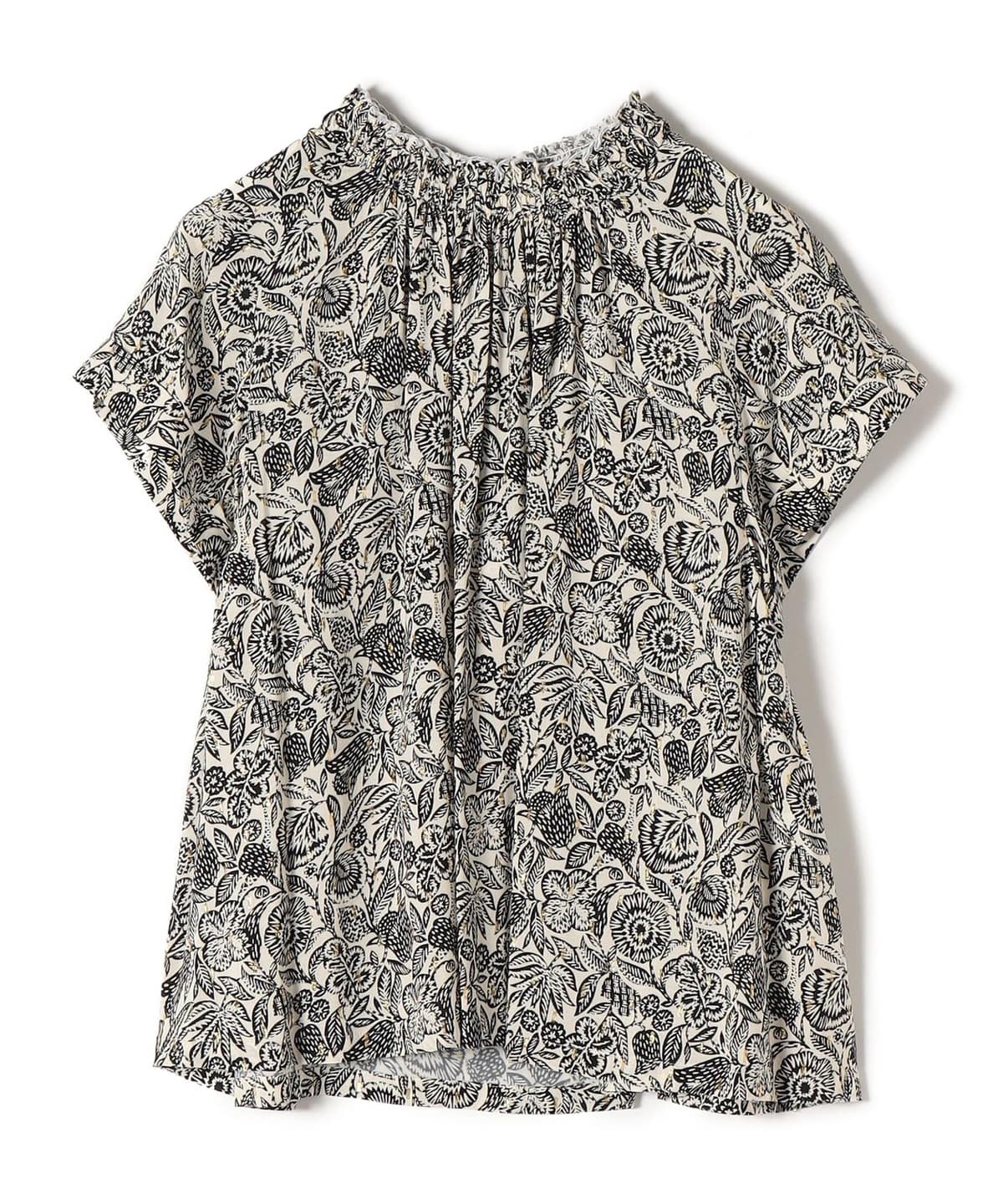 ネックのゴムシャーリングを利用したフリルデザインがポイントのブラウス。