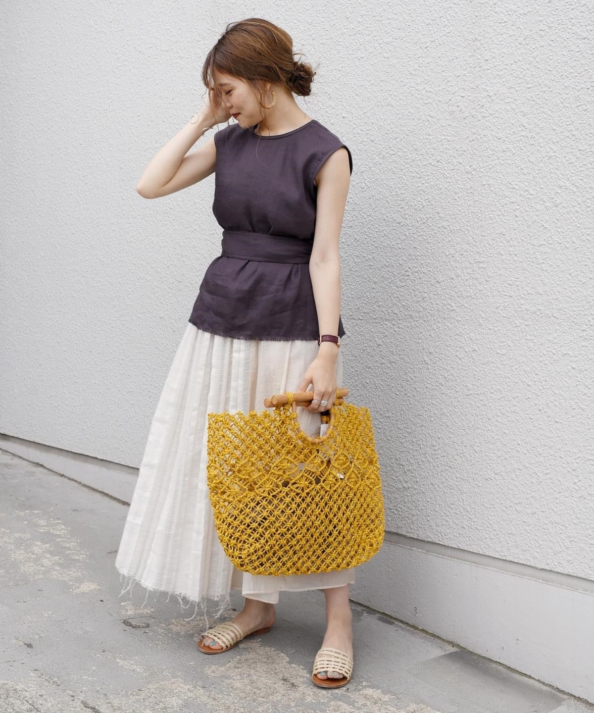 あえて詰まったデザインにしたネックに、肩が少しかかるくらいのノースリーブで、露出を抑えてヘルシーに仕上げたアイテム。