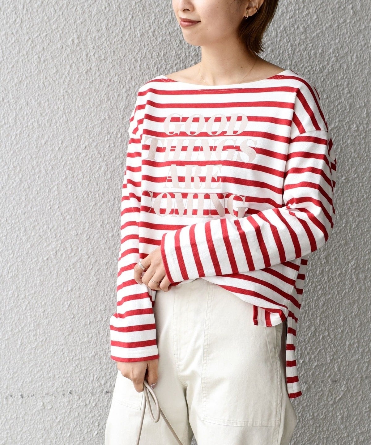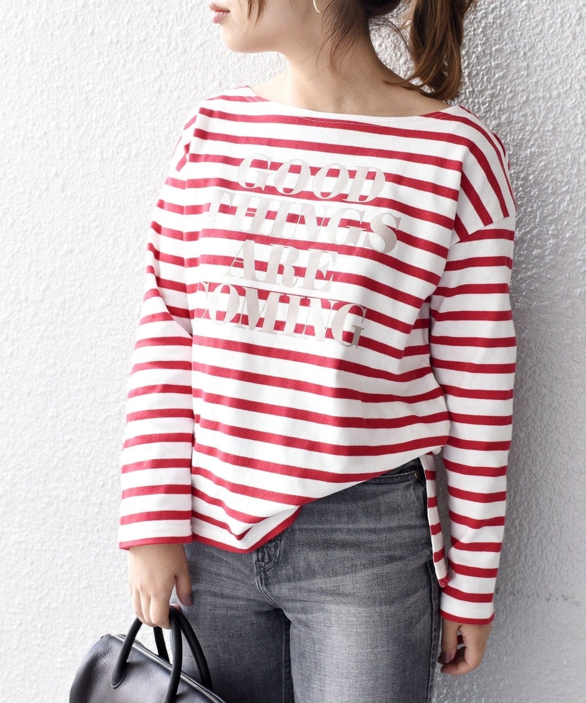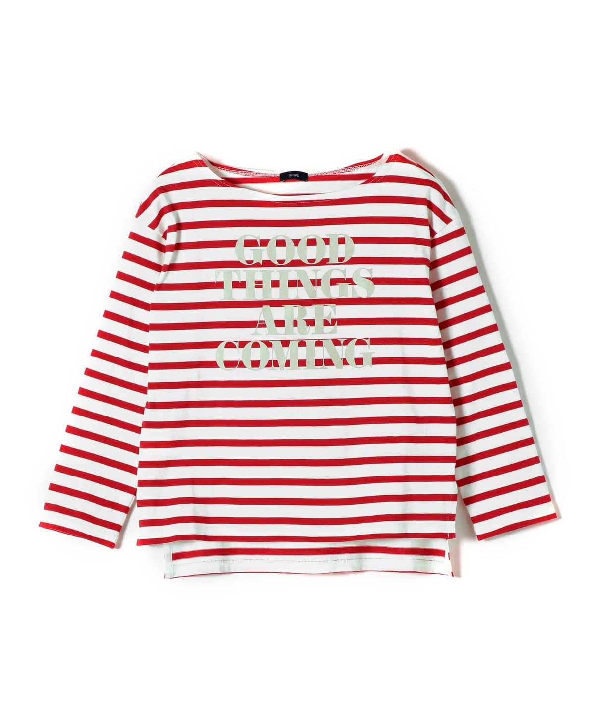ボーダー柄のボディにロゴプリントが施された存在感のある一着です。