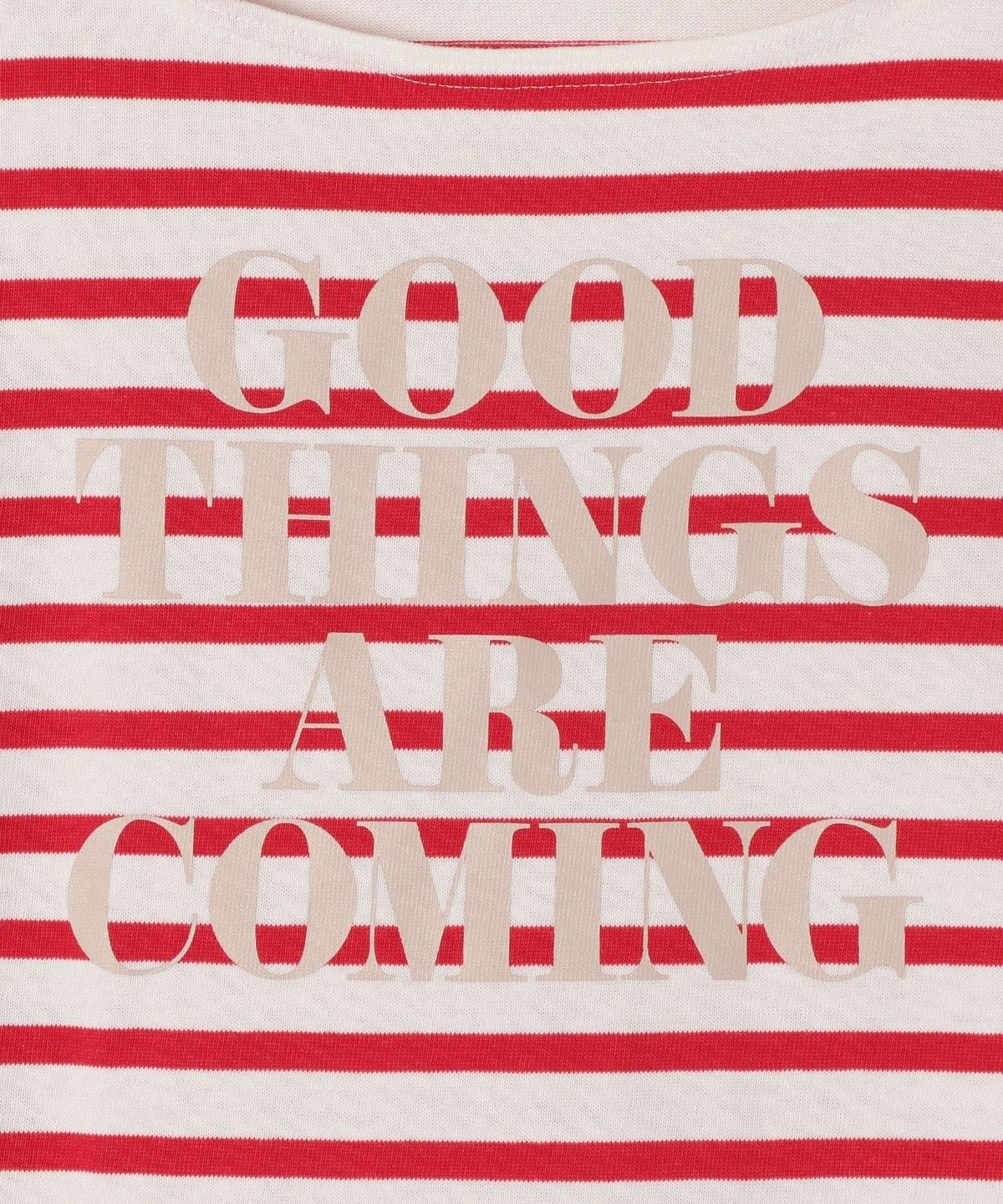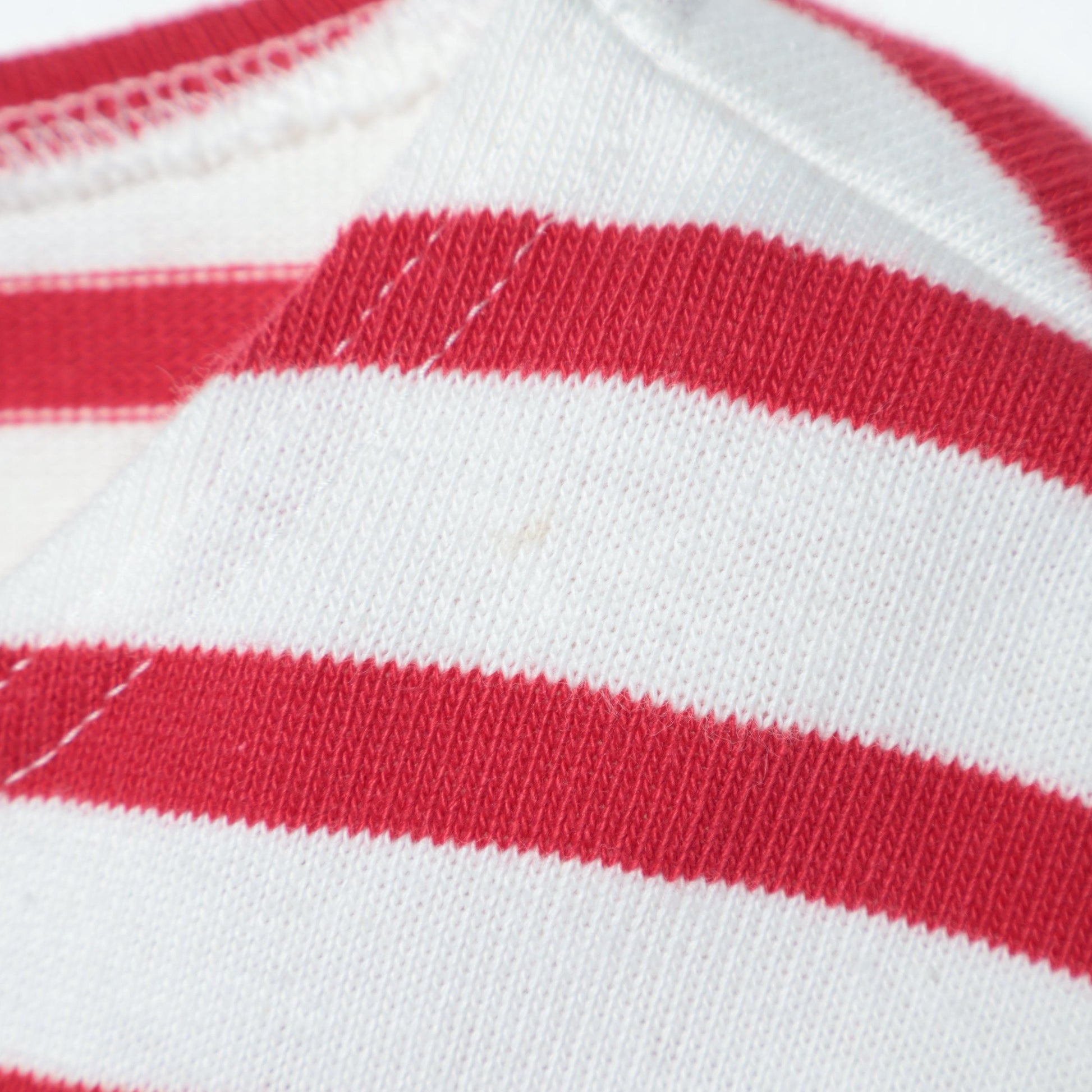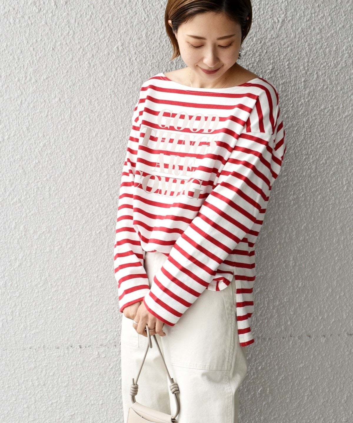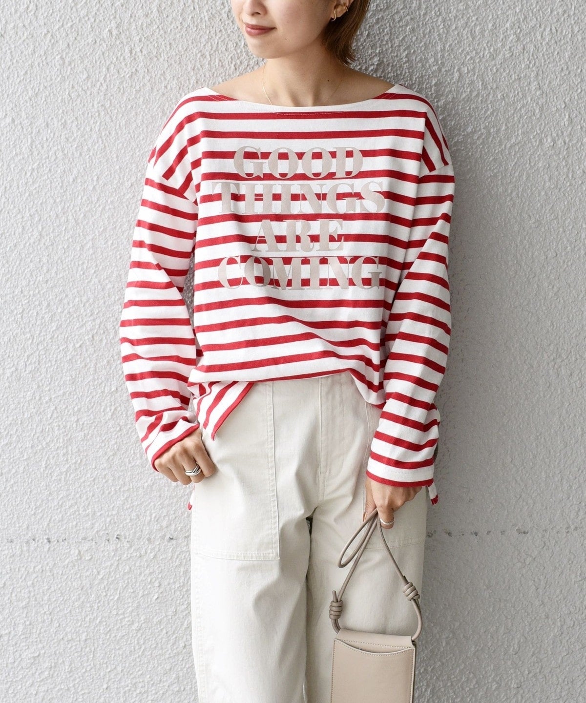 ボーダー柄のボディにロゴプリントが施された存在感のある一着です。