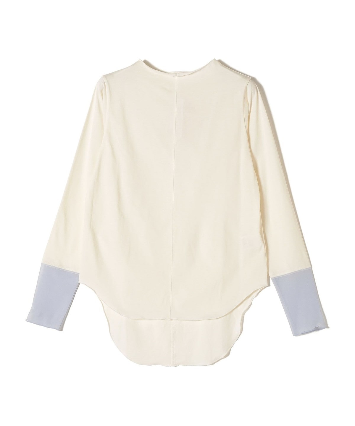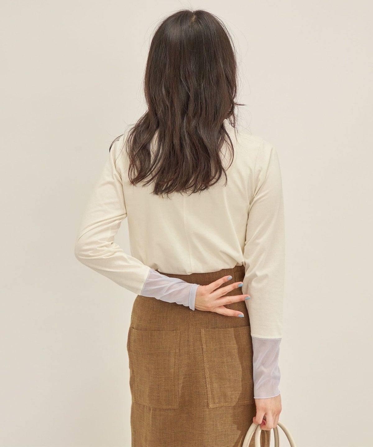 シルクのような美しい上品なツヤ感の天竺と、ビンテージ風の透け感素材を袖口にドッキングしたプルオーバー。
