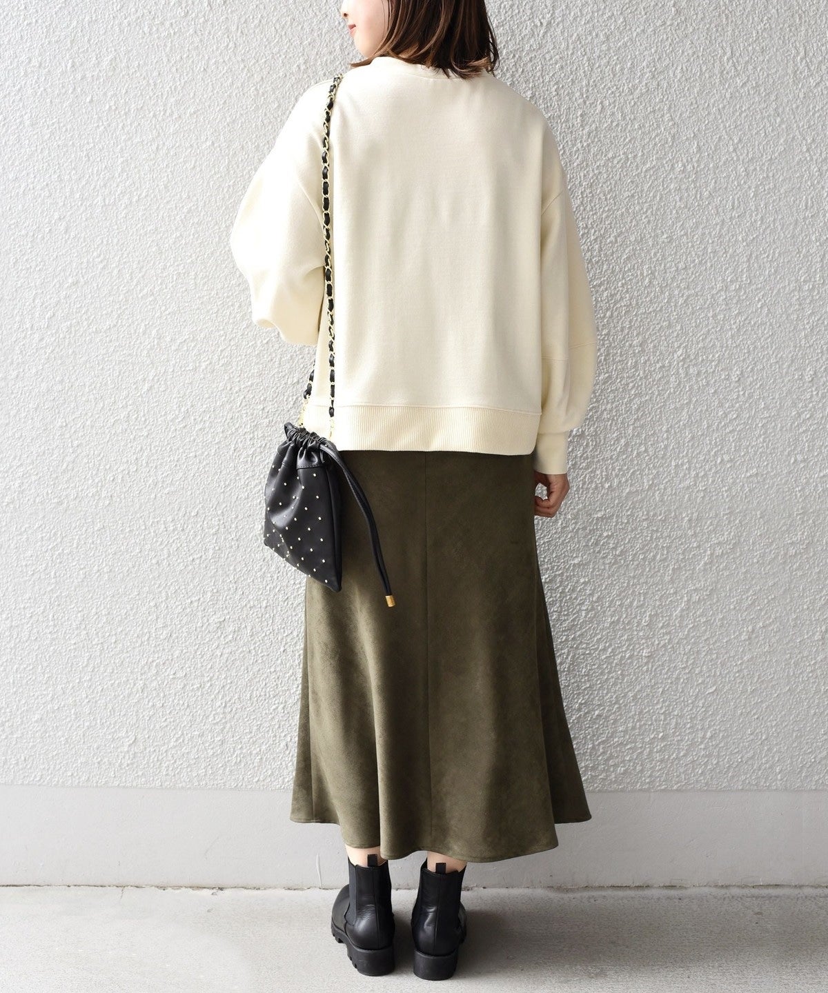 着丈に前後差を付けたデザインなので、色々なボトムスと合わせやすいデザインです。